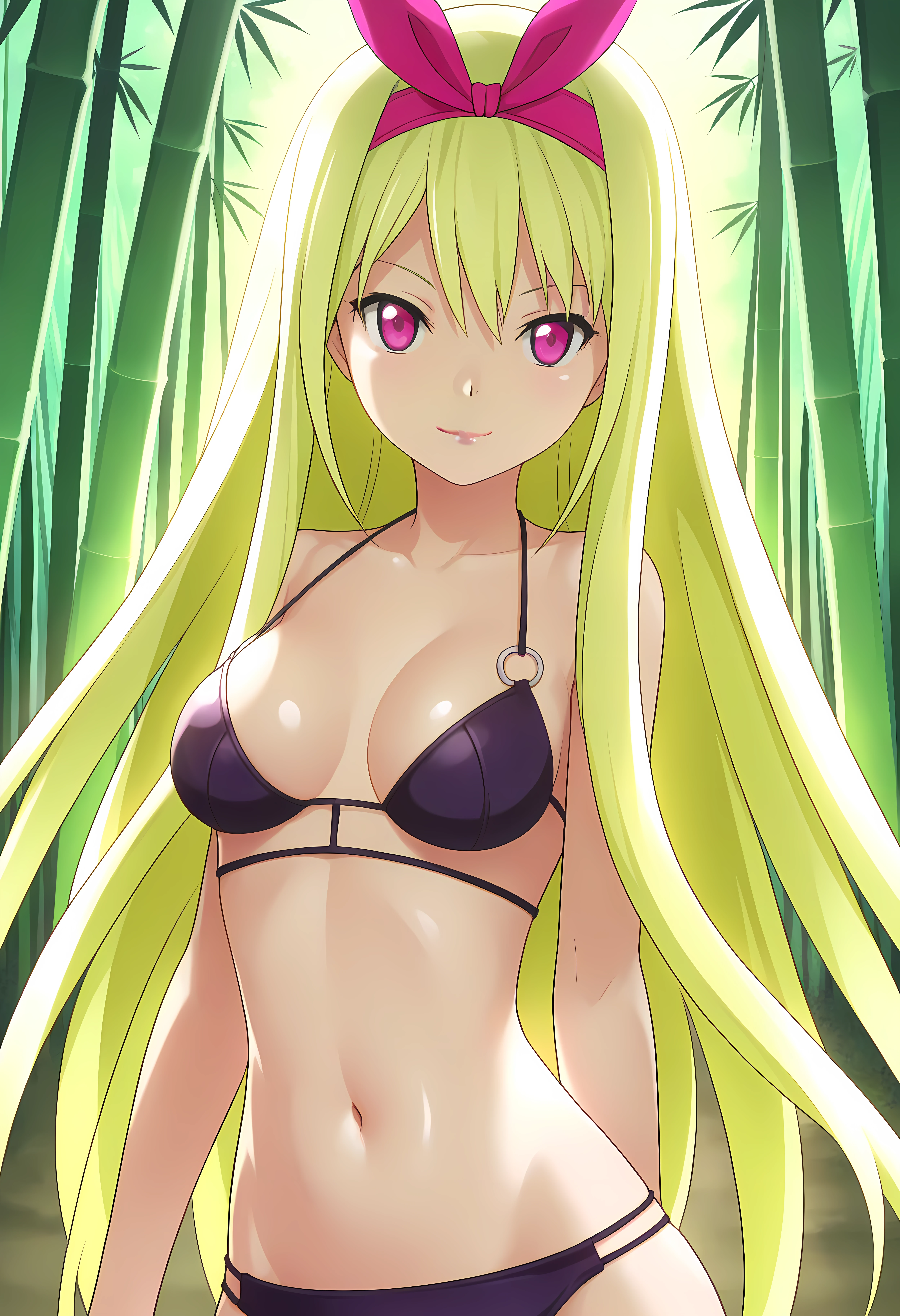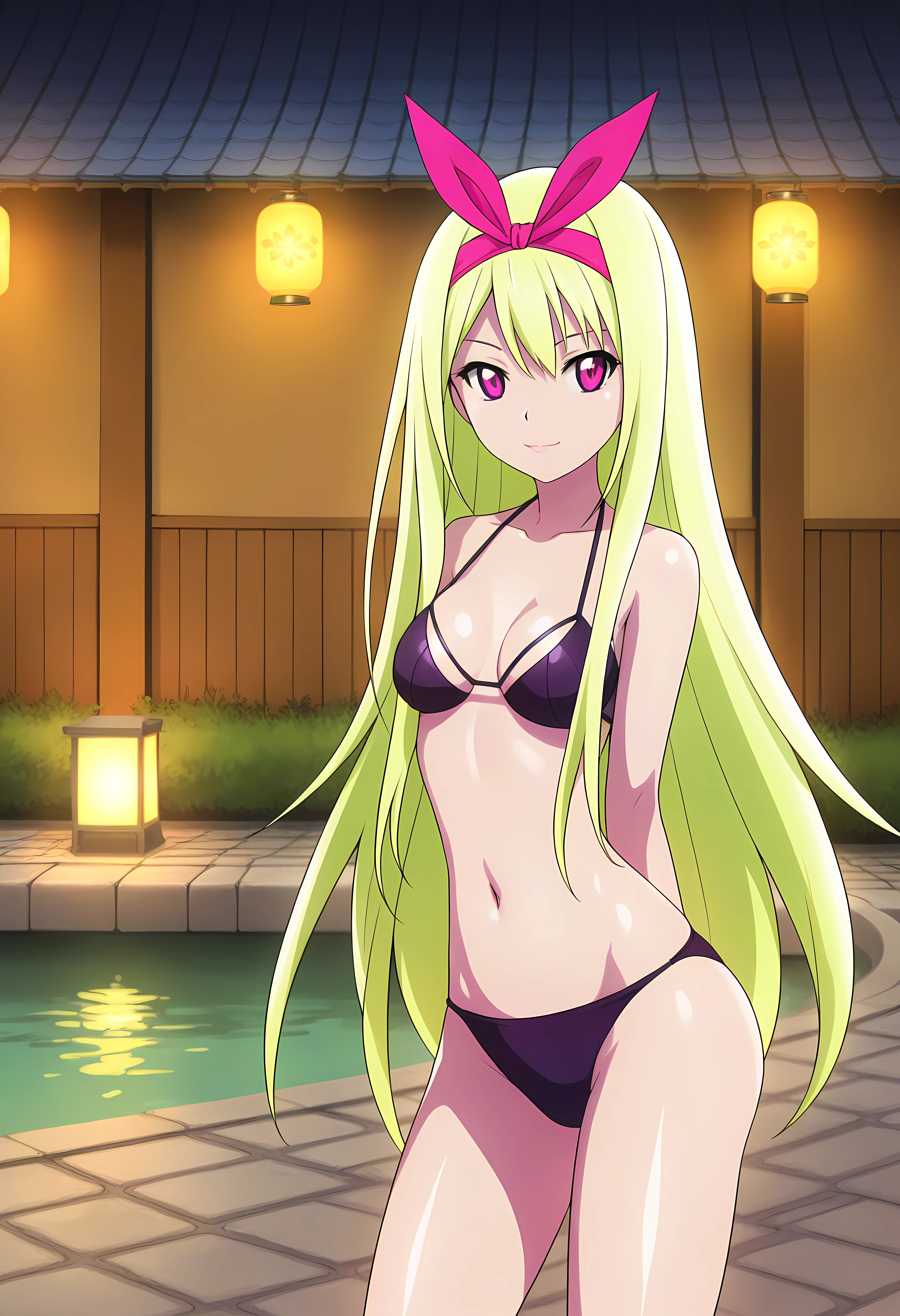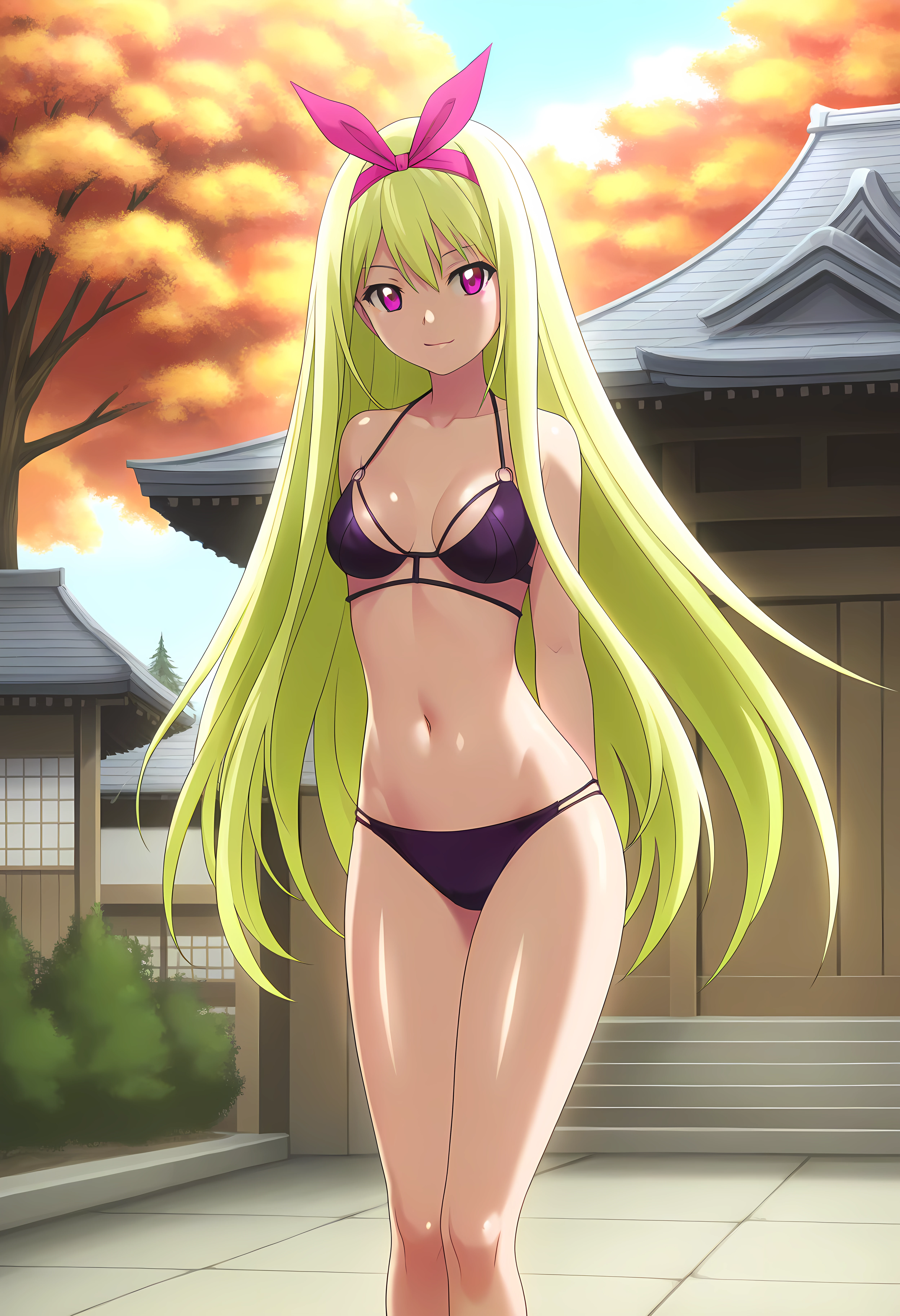 Outfit 2 → swimsuit, bikini, navel, black_bikini, purple_bikini,