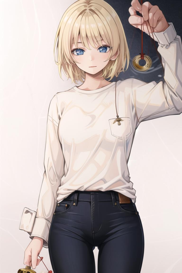 This model was trained using 24 images of characters holding a pendulum. It was trained on the NAI model so it should work with most anime based models. It has some issues that you will have to work around tho. If you don't prompt character traits it tends to add too many pendulums, and it still happens even if you do. It also adds some weird things behind the character sometimes due to there being hypnosis things and other stuff there in the imageset. So be prepared to inpaint those out, or let me know what to put in the negative prompt to get rid of it :3c