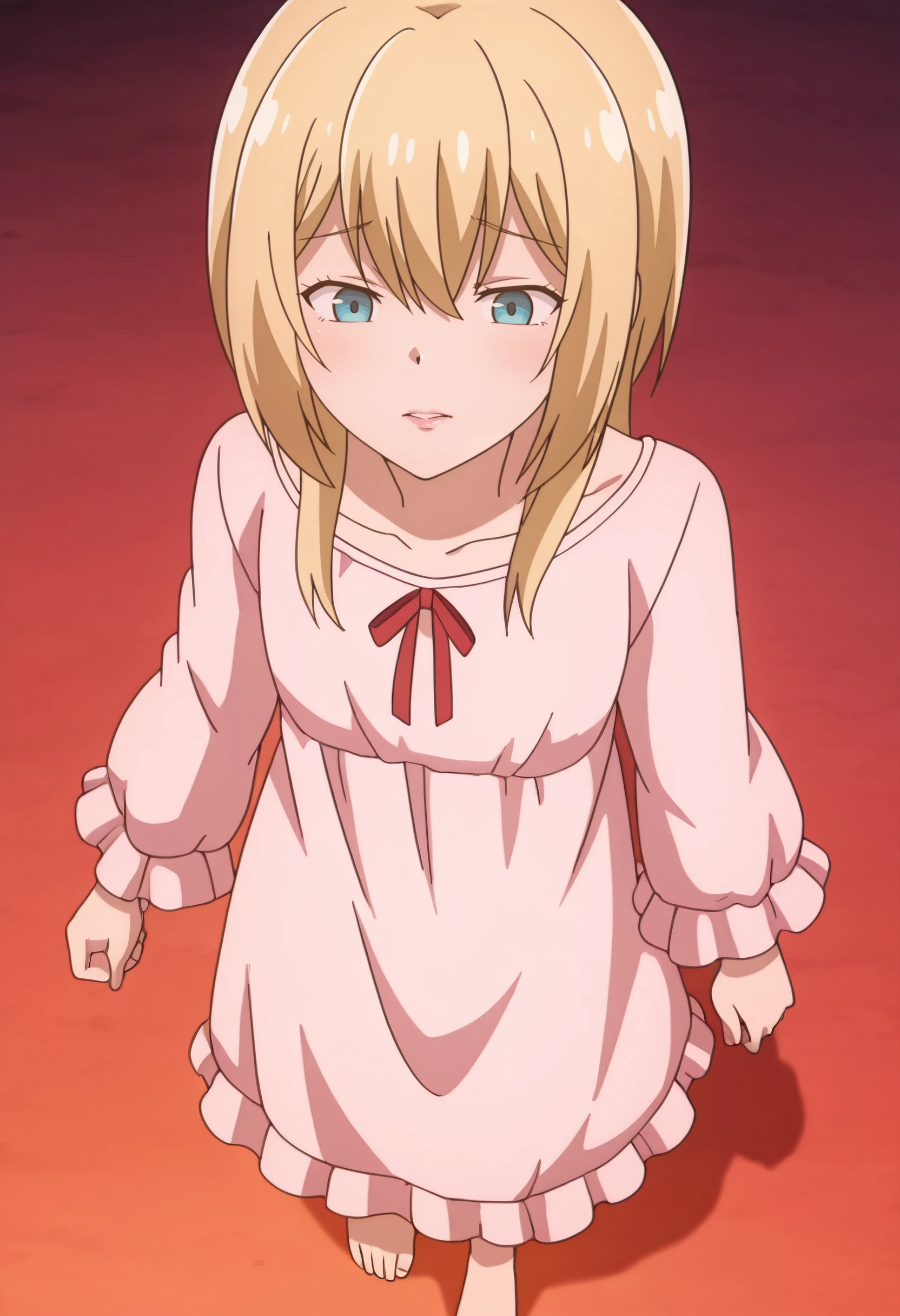 LurieSleepwear, long sleeves, ribbon, red ribbon, pajamas, nightgown, frills, pink pajamas, sleepwear, neck ribbon, frilled sleeves, barefoot,