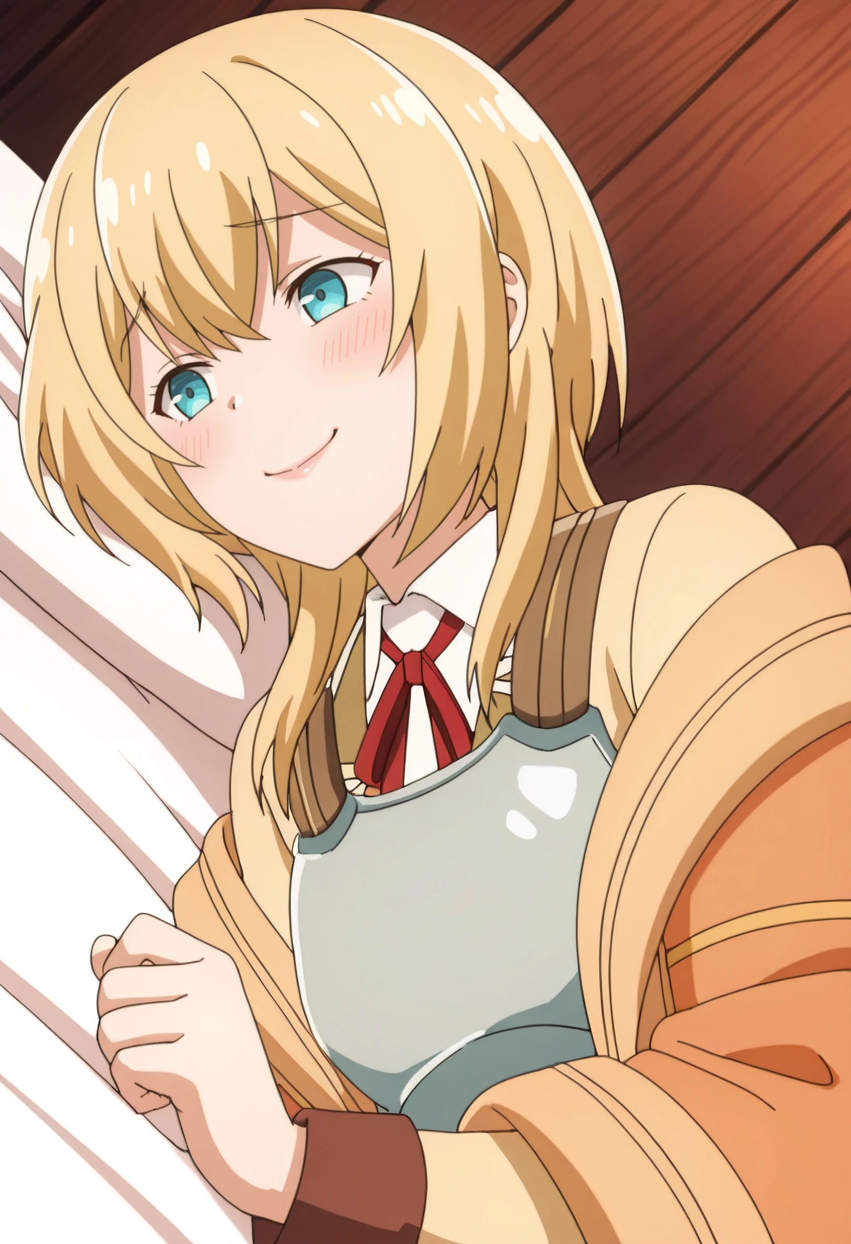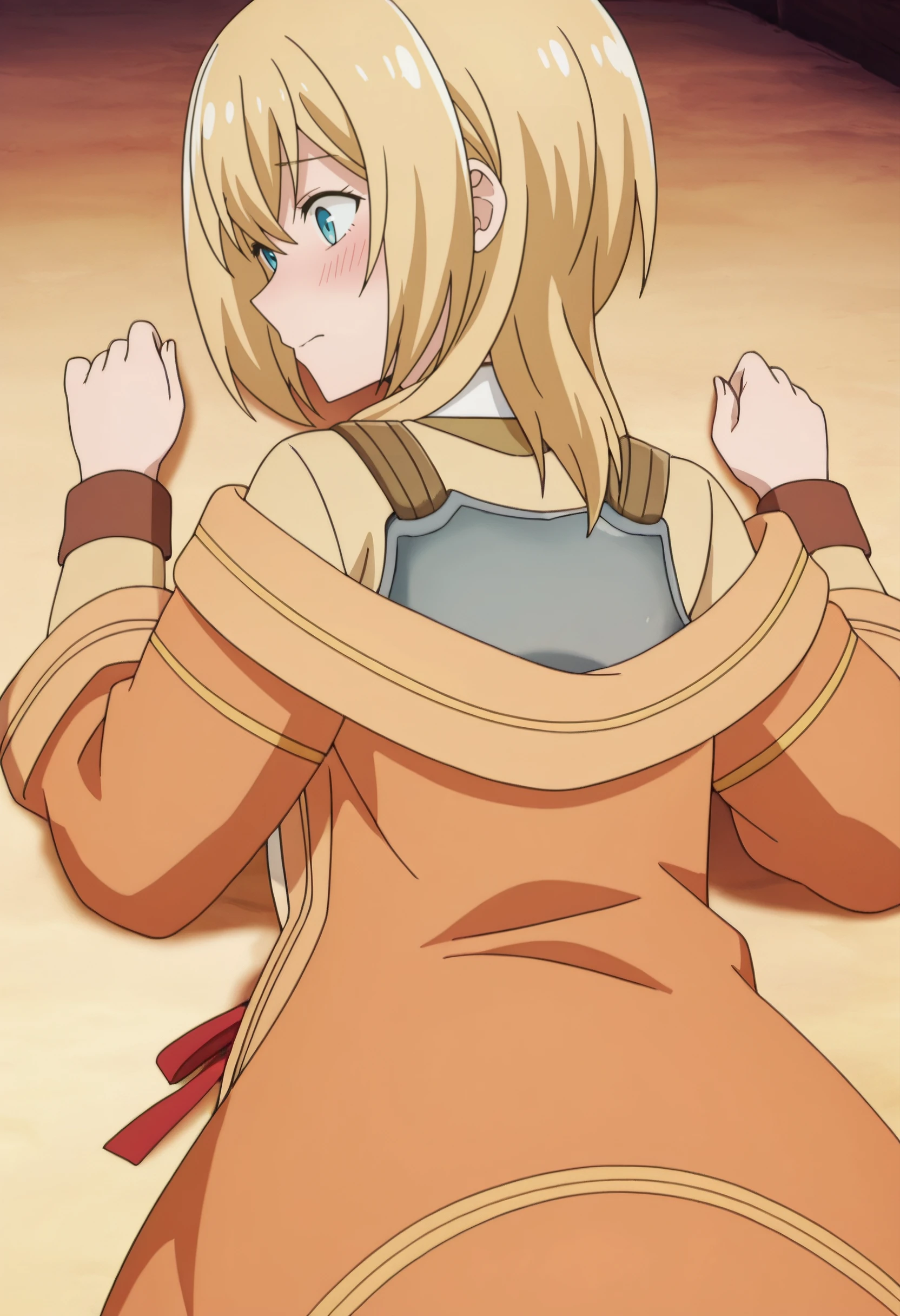 LurieArmor, orange jacket, armor, ribbon, red ribbon, neck ribbon, white shirt, breastplate, open clothes, collared shirt, off shoulder, open jacket, long sleeves, cardigan, yellow cardigan, off-shoulder jacket,