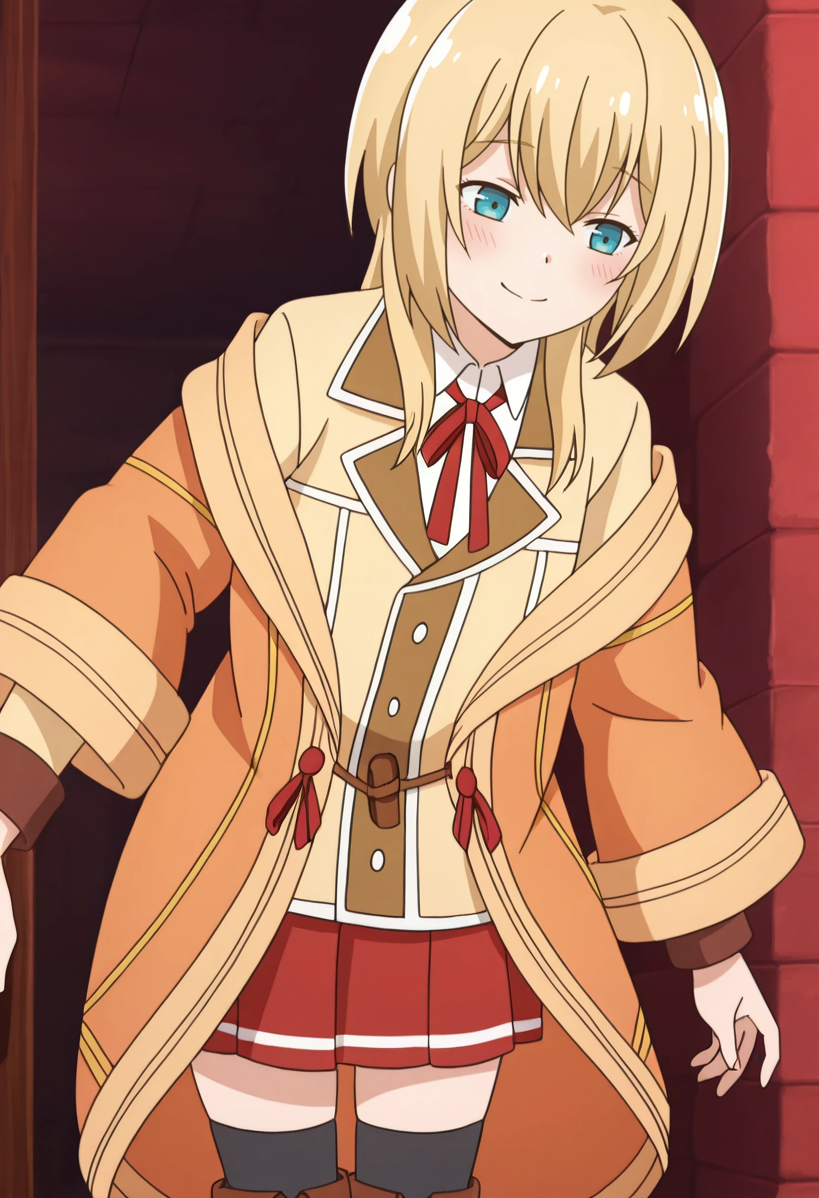 LurieOutfit, orange jacket, white shirt, collared shirt, red ribbon, ribbon, neck ribbon, school uniform, off shoulder, long sleeves, open clothes, red bow, red skirt, pleated skirt, bow, blazer, miniskirt, brown footwear, boots, black thighhighs, open jacket, zettai ryouiki, knee boots, buttons, yellow cardigan, red bowtie, wide sleeves,