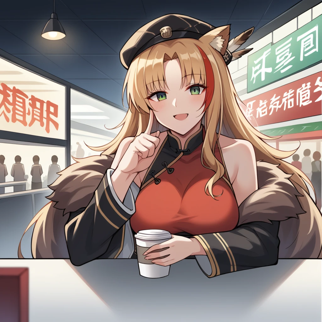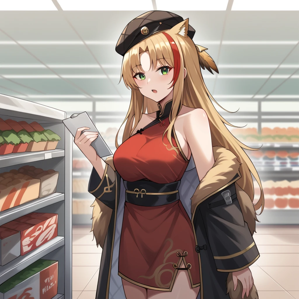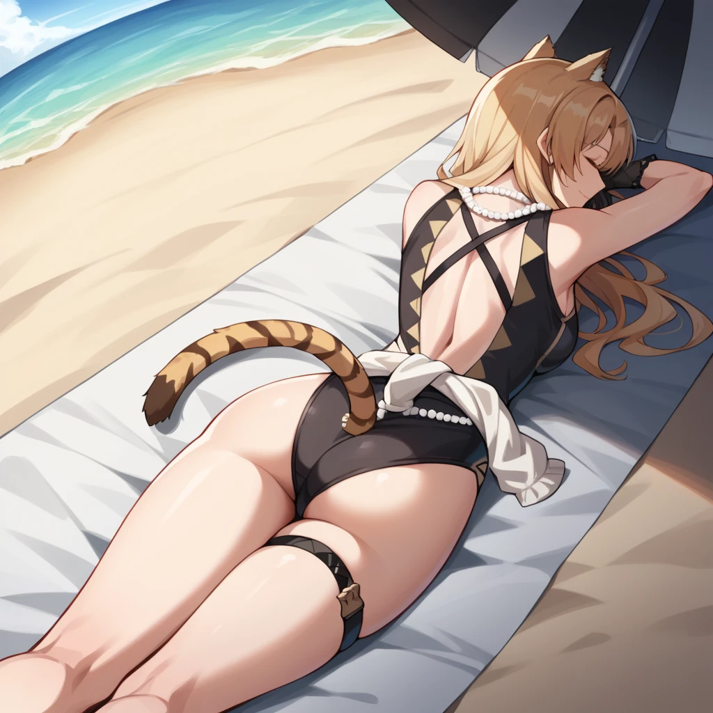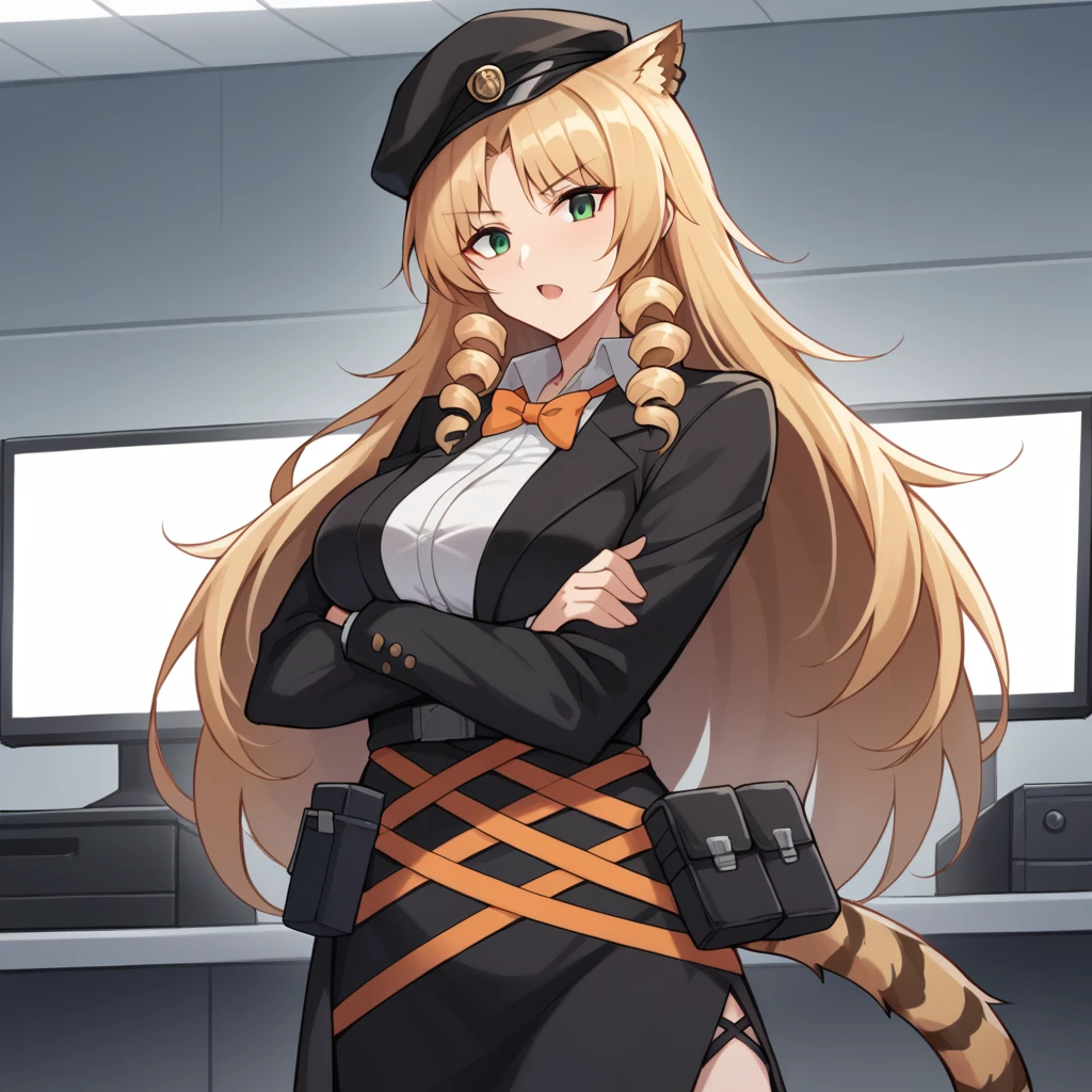 Swire, swire_(arknights), tiger ears, tiger tail, green eyes, blonde hair, long hair,Default Outfit: