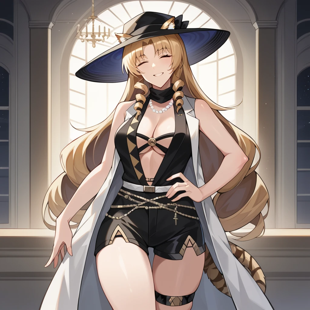 Sw_Elegant, drill hair, black dress, bodycon dress, black short shorts, white blazer, sleeveless blazer, bare arms, open blazer, center opening, collarbone, criss-cross front, pearl necklace, black hat, black bow, thigh strap, black neck scarf, jewelry, ears through headwear,Extra Info: Originally it was supposed to be "sleeveless jacket", but AI mistook her capelet for it. I re-trained with "swimsuit cover-up" (Yes that's an actual piece of clothing, google it if you want), didn't work as well. So I just prompted it myself and sleeveless blazer actually worked...