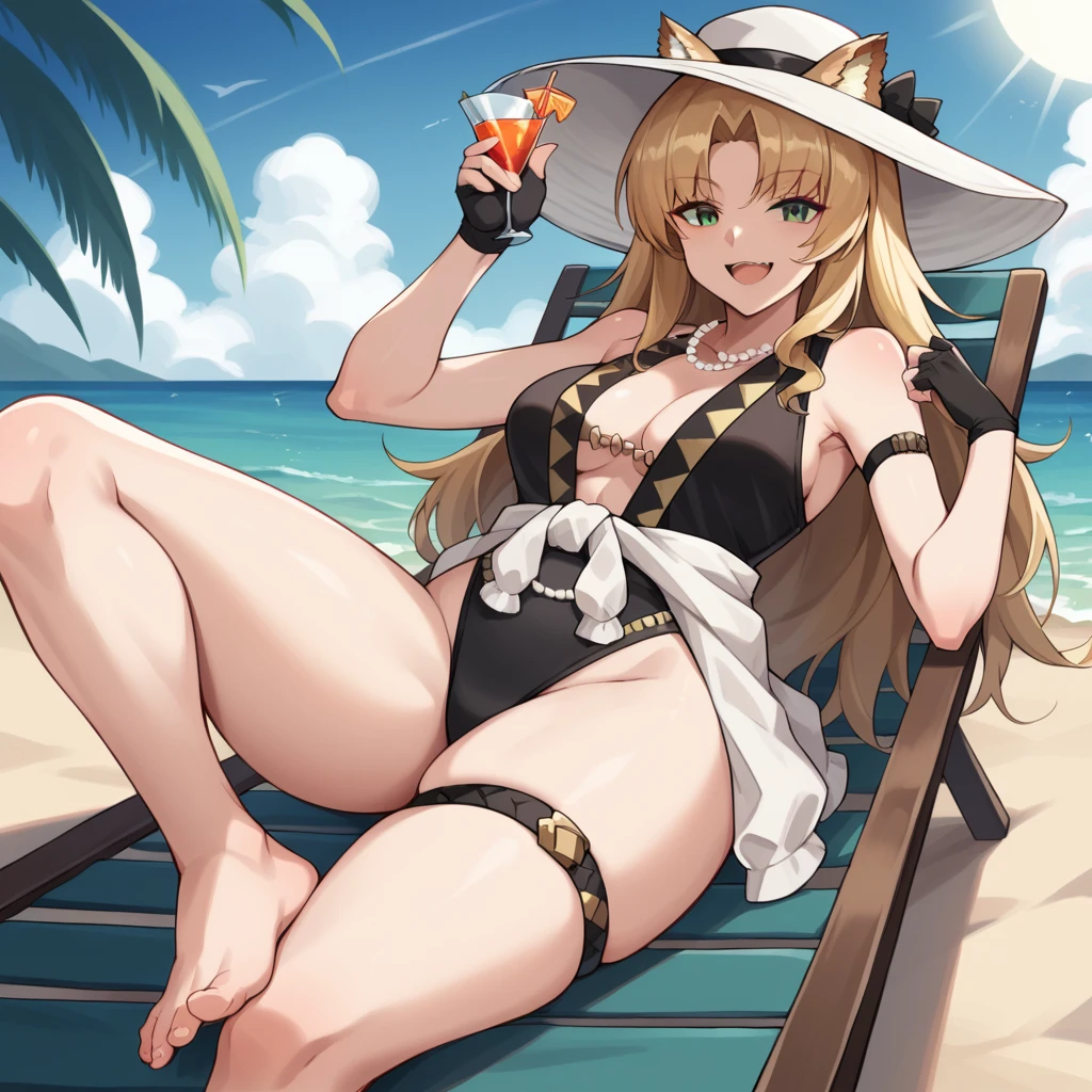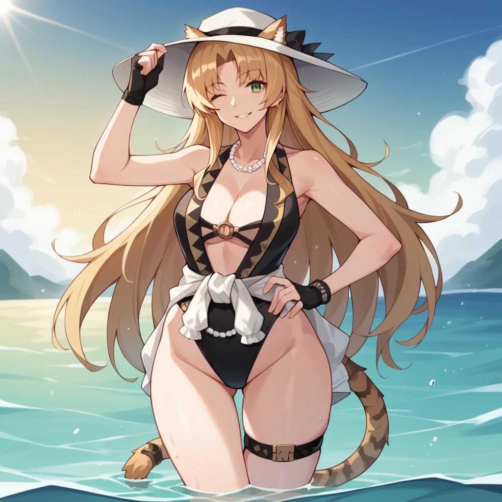 Sw_Swimsuit, black swimsuit, casual one-piece black swimsuit, center opening, pearl necklace, white hat, sunhat, clothes around waist, highleg, thigh strap, black gloves, fingerless gloves, ears through headwear,Elegant Dress Outfit: