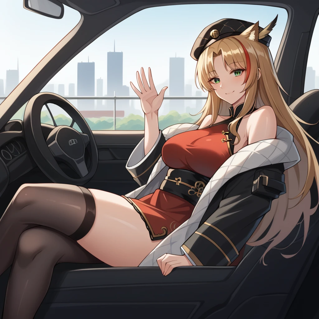 Sw_CN, red hair, streaked hair, china dress, red dress, black sash, black thighhighs, black headwear, beret, black coat, open coat, sleeveless dress, hair ornament, feather boa, halter dress, halterneck, white inner jacket, black choker, short dress,Swimsuit Outfit:
