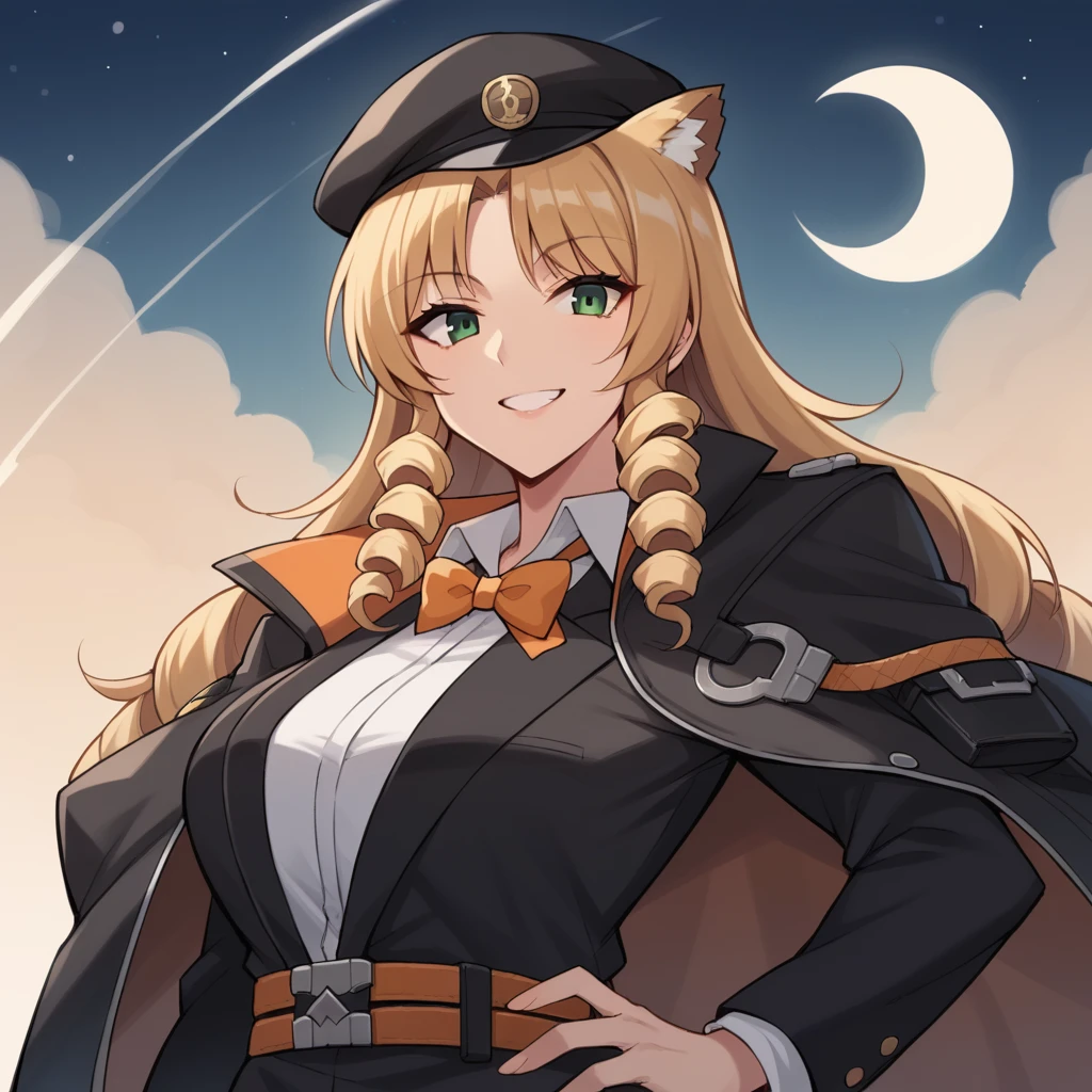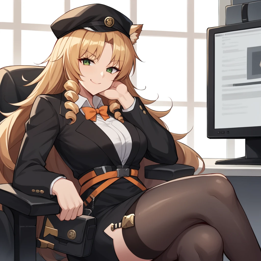Sw_Def, drill hair, black blazer, orange ribbon bowtie, white shirt, black thighhighs, pouch, collared shirt, high-waist skirt, black skirt, belt, orange straps, black beret,Optional: If you want her Jacket, I wish you luck, because "black Blazer + black Jacket" don't go well together for Ai. Try these prompts: