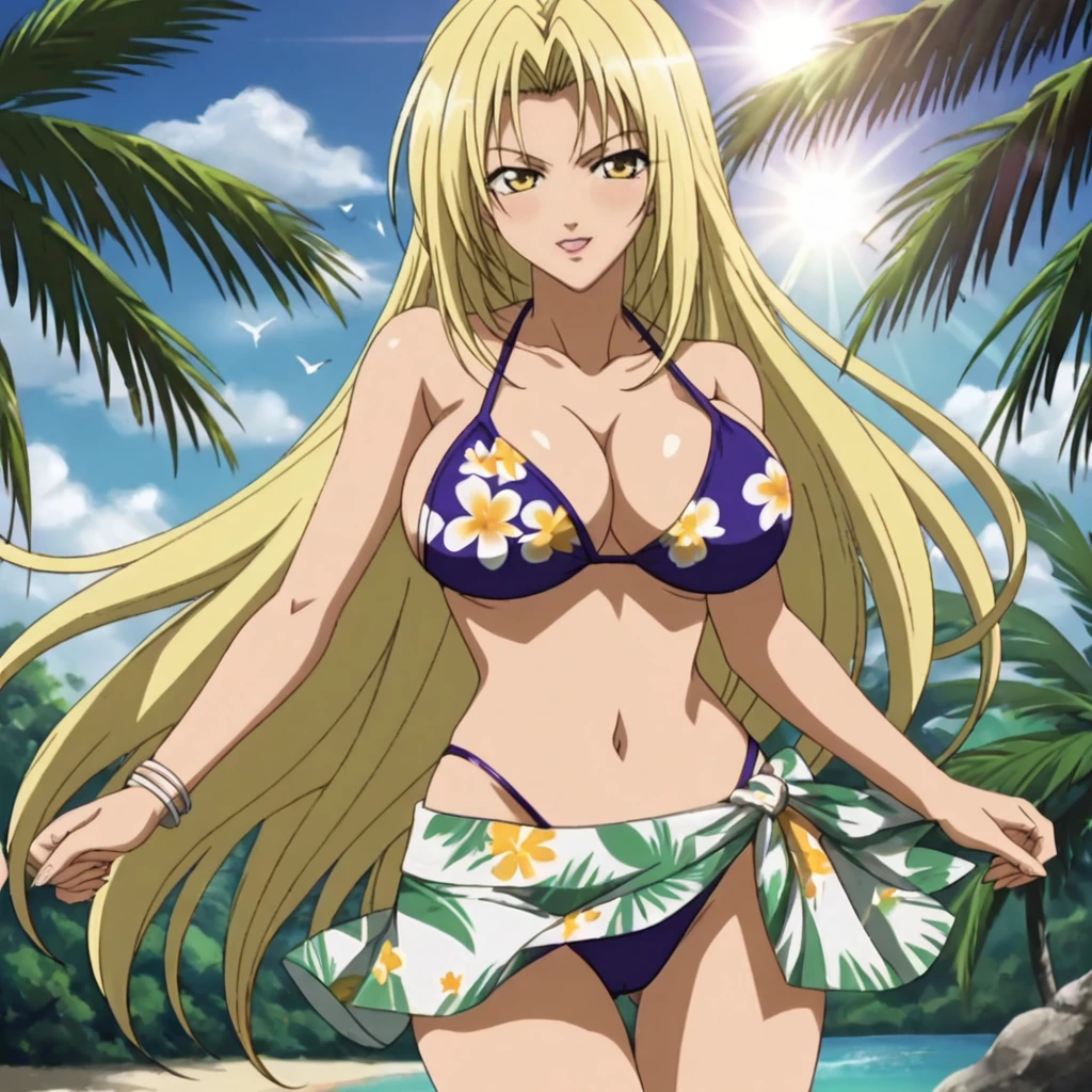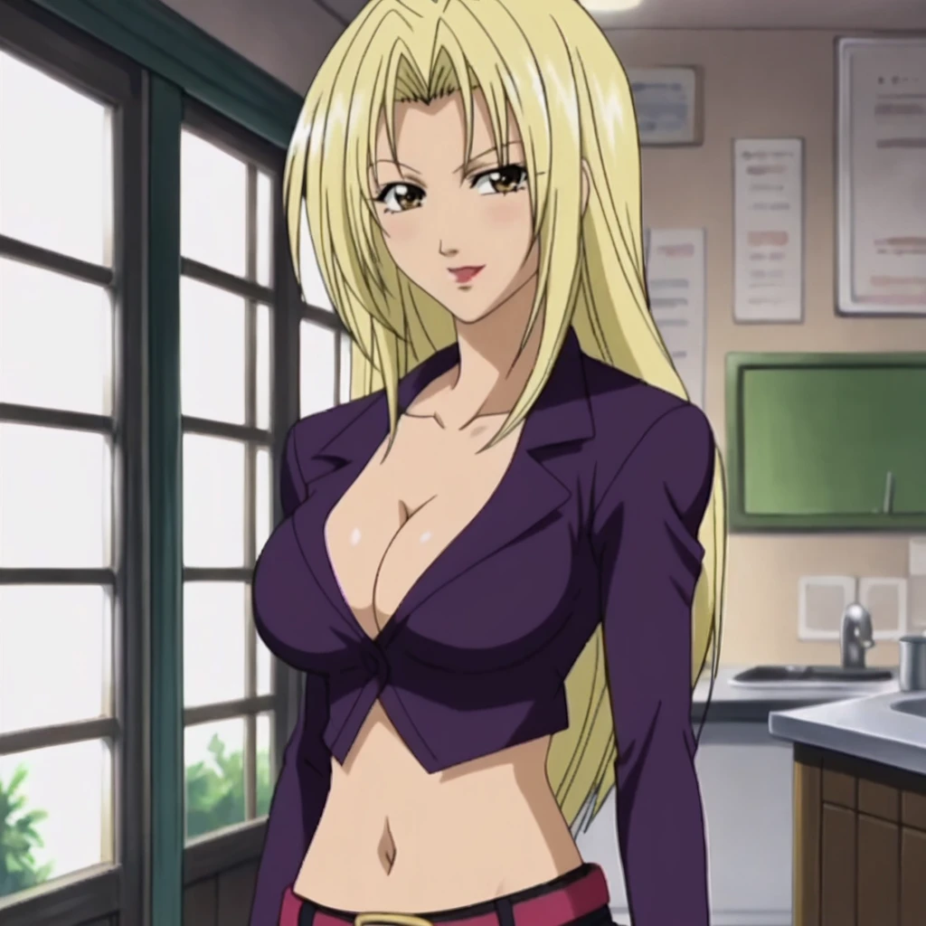 • Trigger : Hevn, blonde hair, large breasts, long hair, 1girl, midriff, belt, cleavage, navel, pants, brown eyes