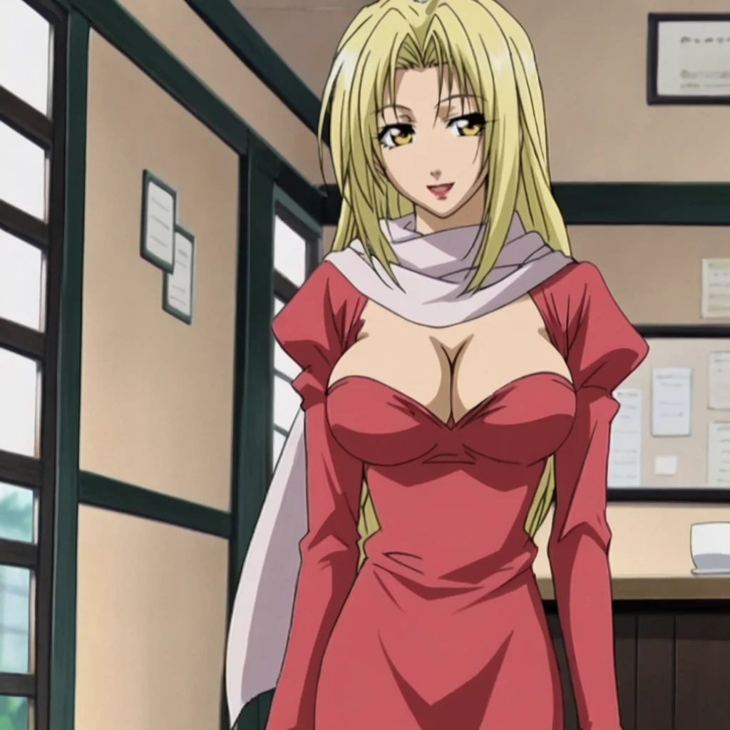 HevnScarf, 1girl, large breasts, blonde hair, cleavage, yellow eyes, scarf, red dress, cowboy shot