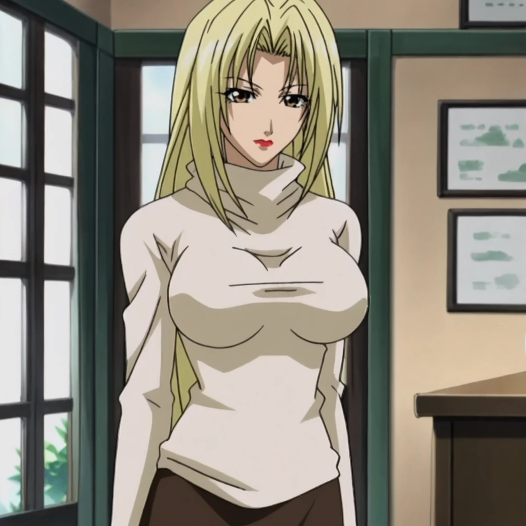 HevnLongSweater, 1girl, blonde hair, long hair, turtleneck, sweater, skirt, large breasts, brown eyes, long sleeves, lipstick, makeup, cowboy shot
