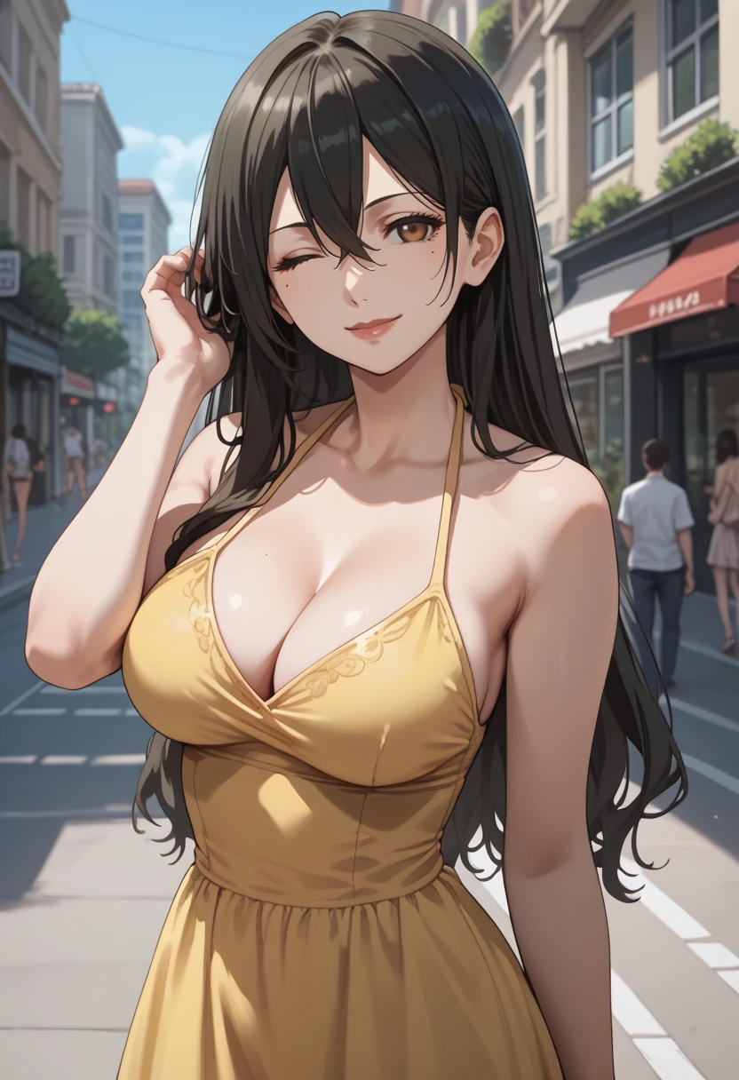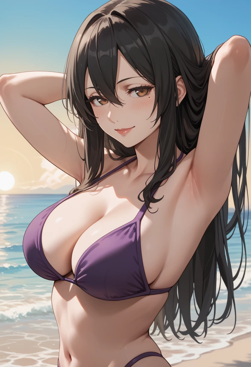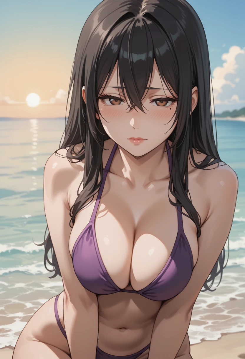 long hair, black hair, hair between eyes, brown eyes, makeup, mole under eye