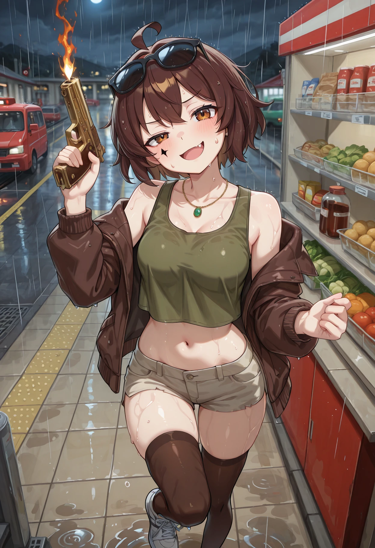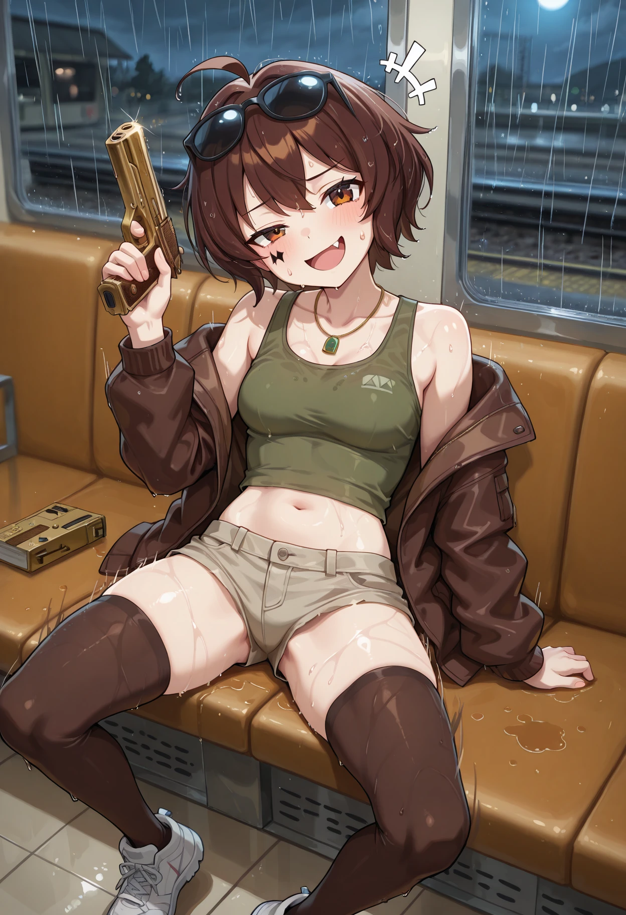 clothing:green tank top,eyewear on head,, thighhighs,brown jacket, shorts,sneakers, sunglasses,