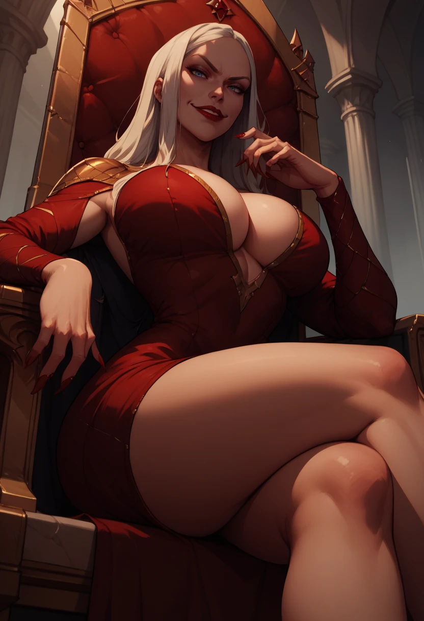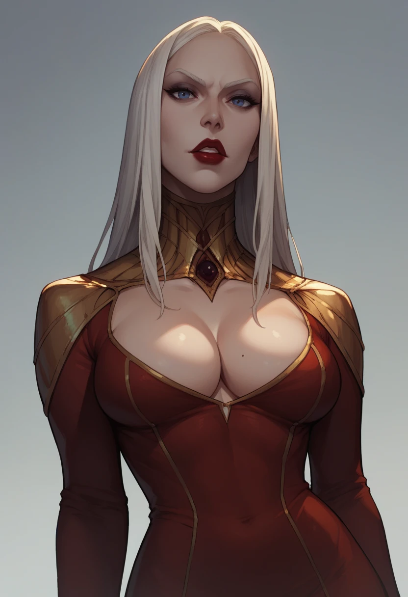Clothing: red dress, long dress, pauldrons