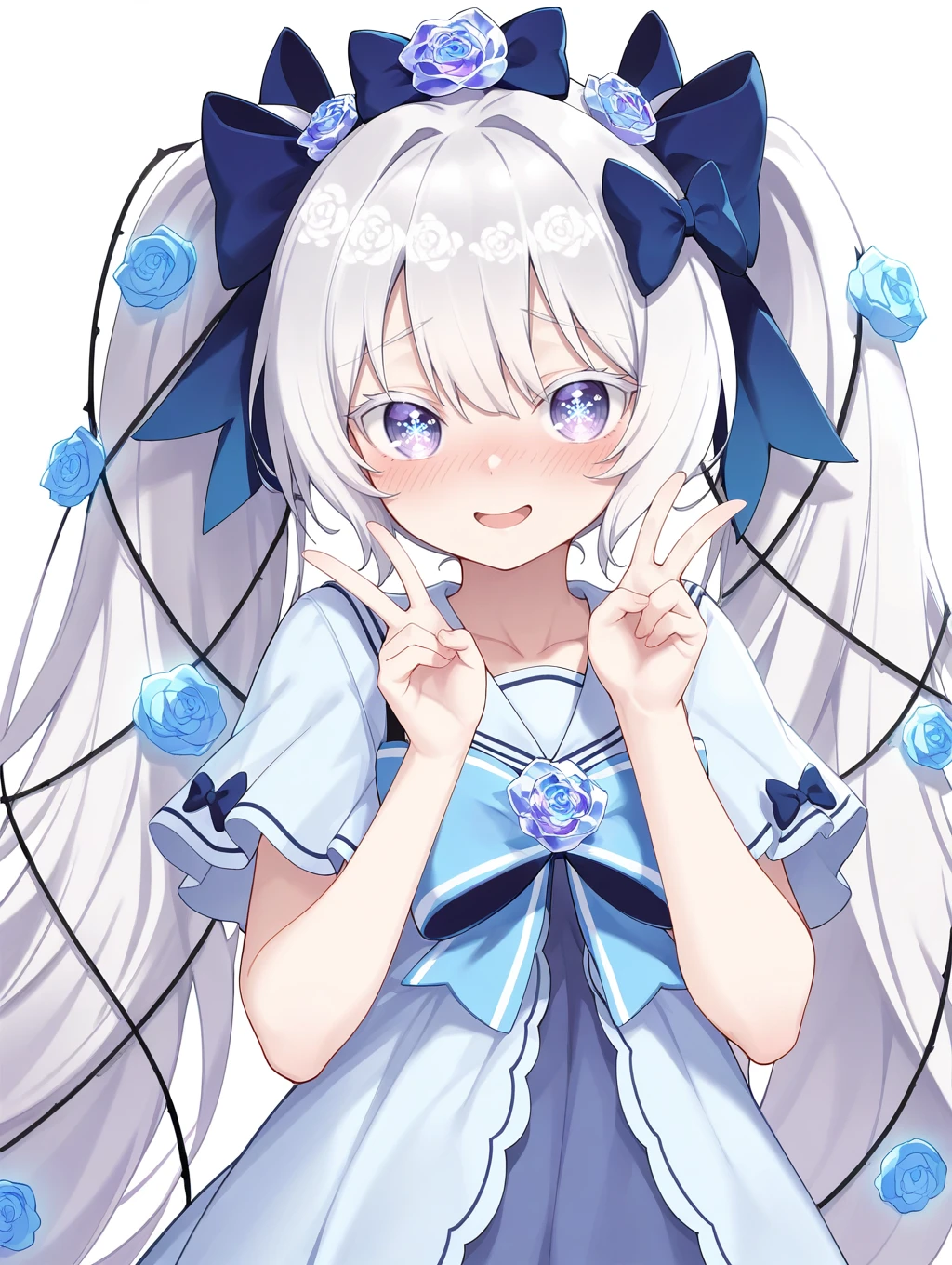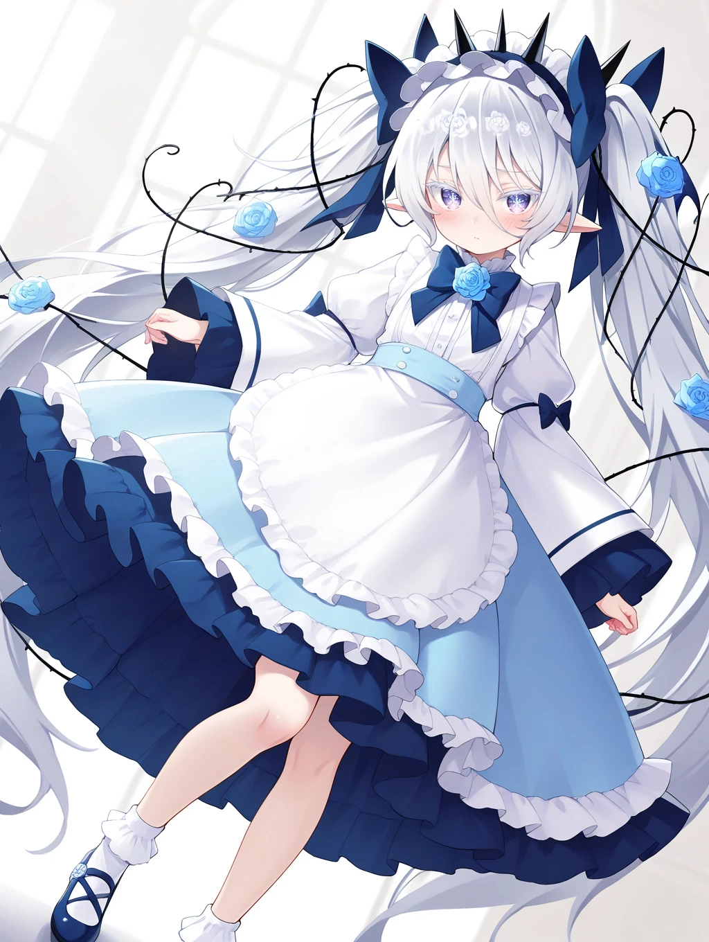 win\(fkg\),1girl,blue rose,very long hair,solo,wide sleeves,long hair,white socks,hair between eyes,white apron,frills,blue skirt,twintails,long sleeves,bobby socks,hair bow,blush,pointy ears,black footwear,thorns,frilled apron,white shirt,hair flower,waist apron,frilled socks,hair ornament,hairband,frilled skirt,blue bow,standing,blue footwear,looking at viewer,colored eyelashes,frilled dress,purple eyes,puffy sleeves,white hair,frilled hairband,purple eyes,vines,snowflake pupils,