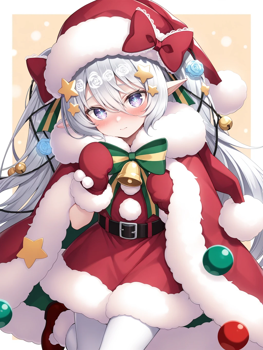 win\(fkg\),solo,christmas,santa hat,red mittens,fur trim,santa costume,red footwear,pointy ears,hair ornament,purple eyes,christmas ornaments,star \(symbol\),mittens,star hair ornament,fur-trimmed cloak,red dress,long hair,blush,white pantyhose,bell,red cloak,1girl,red headwear,cloak,hair bell,looking at viewer,red hair,white hair,belt,santa dress,grey hair,ribbon,symbol-shaped pupils,fur-trimmed cape,fur-trimmed headwear,snowflake pupils,
