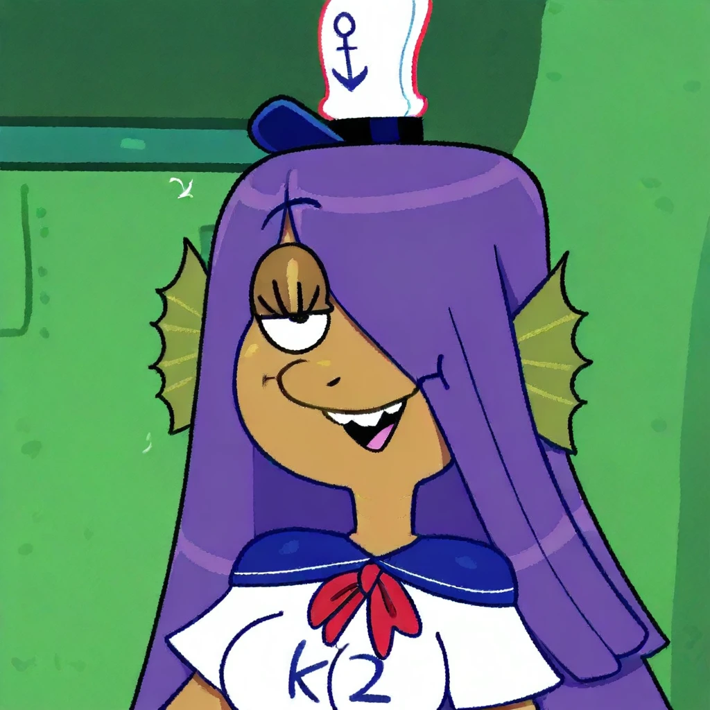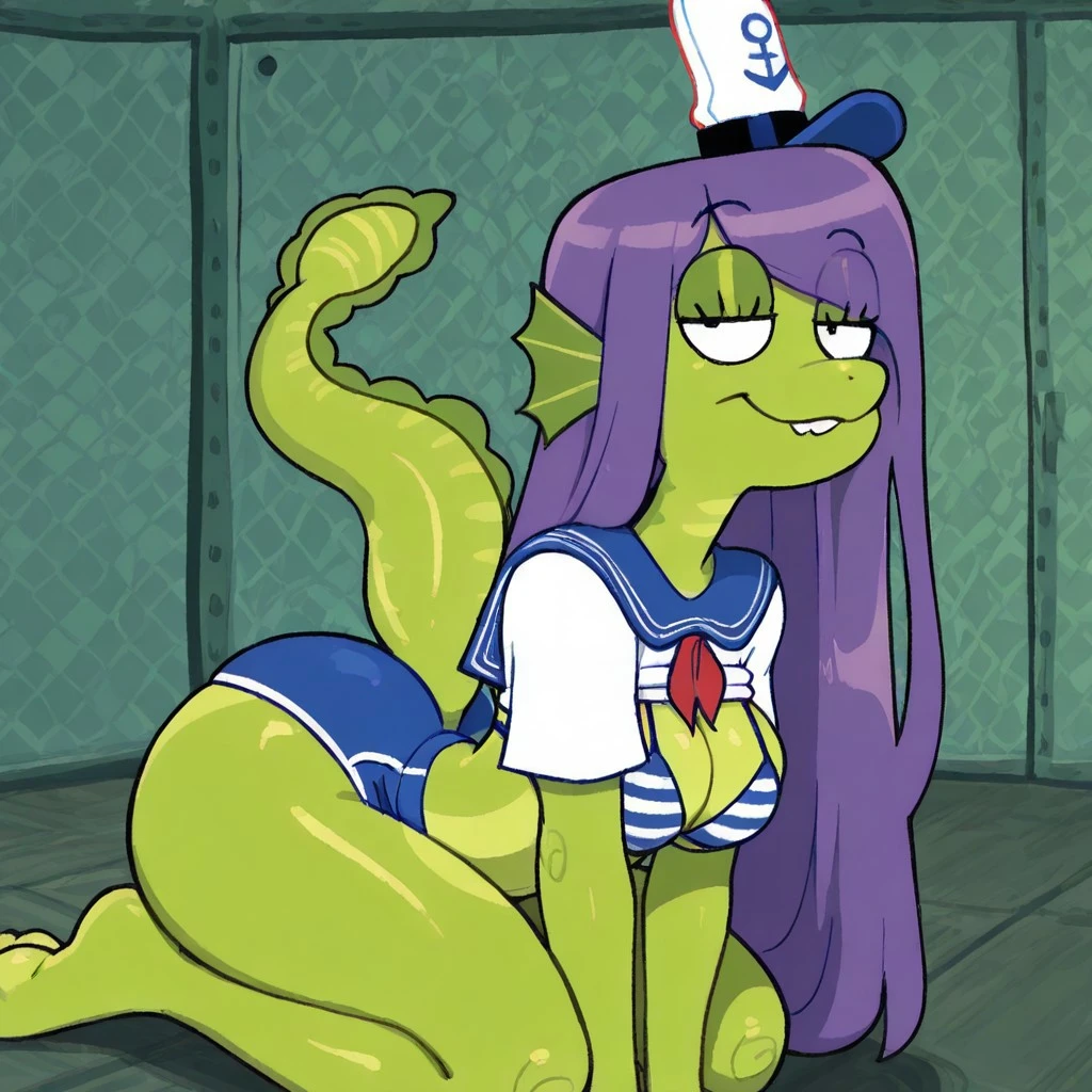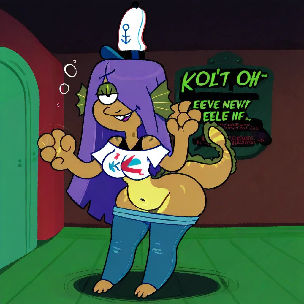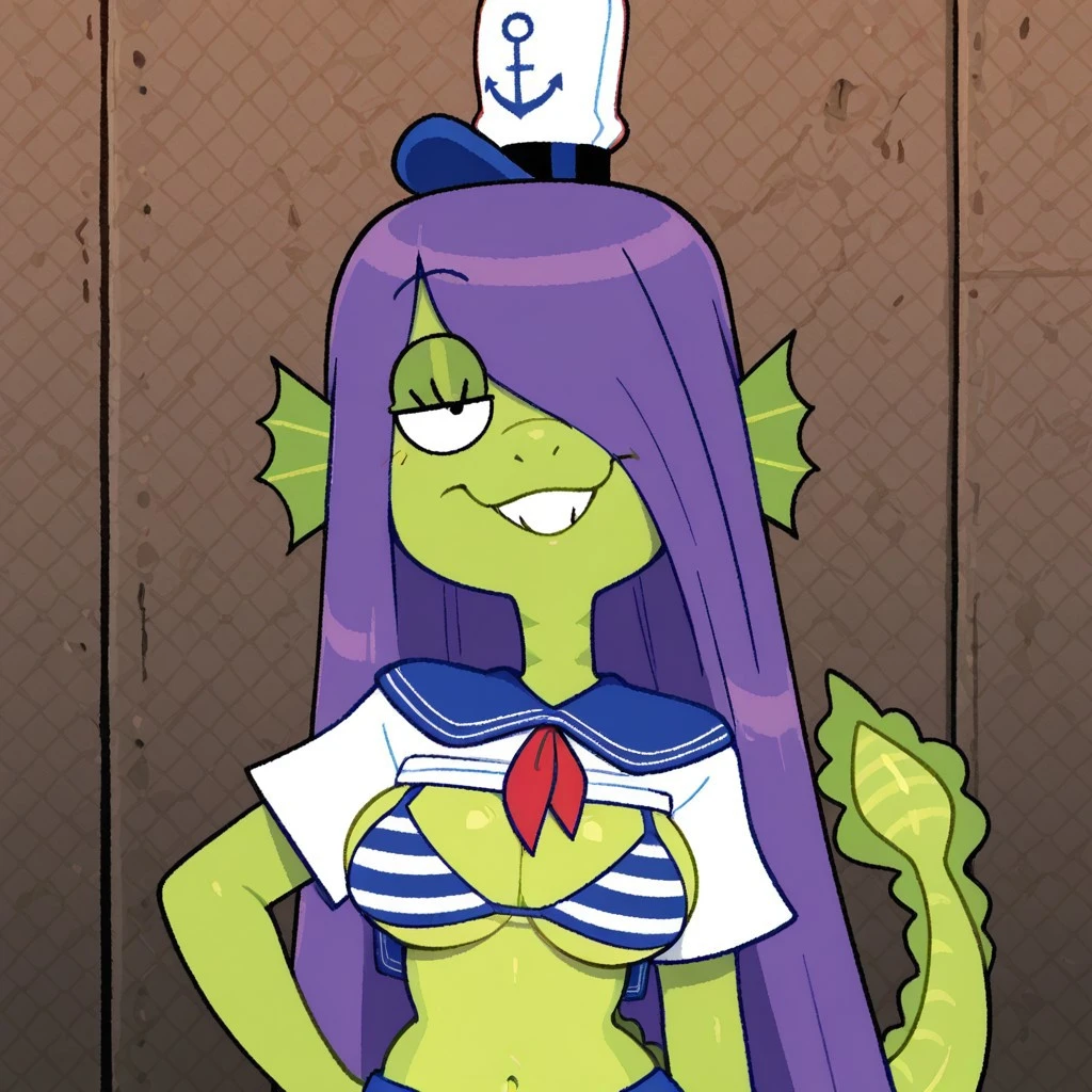 Eelie(Character), female, anthro, eel, purple hair, Green body, hair covering one eye,