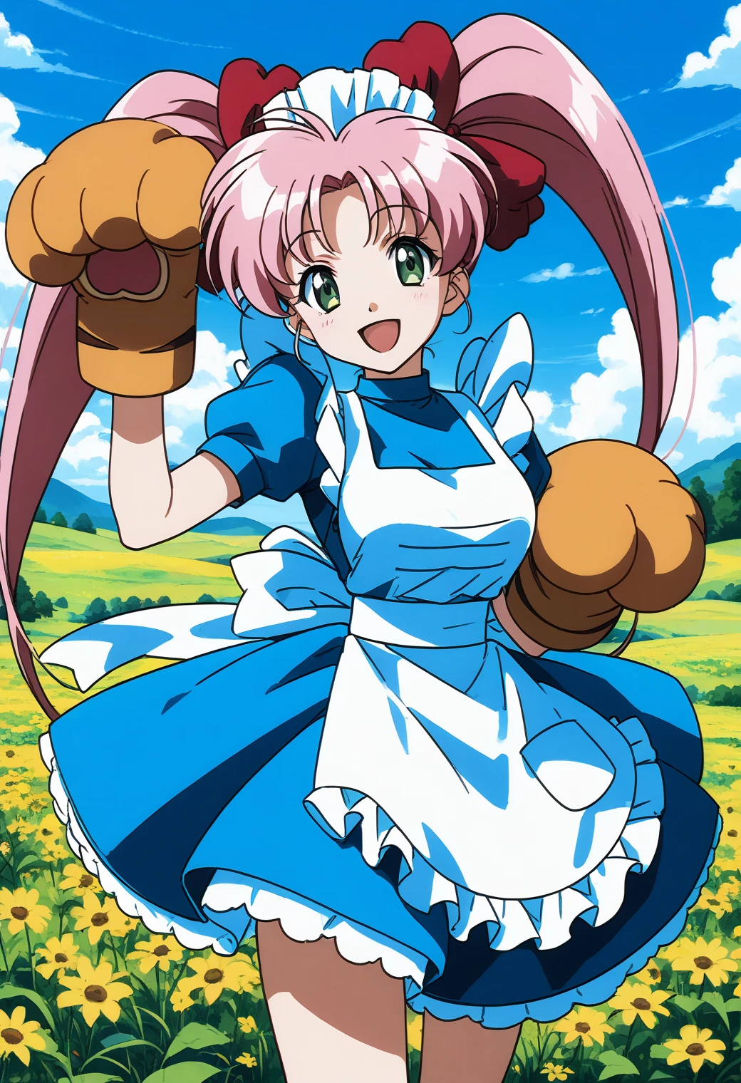 vg_manami, green eyes, pink hair, long hair, twintails, hair ribbon, maid headdress, animal hands, paw gloves, white apron, blue maid, short sleeves, blue skirt,