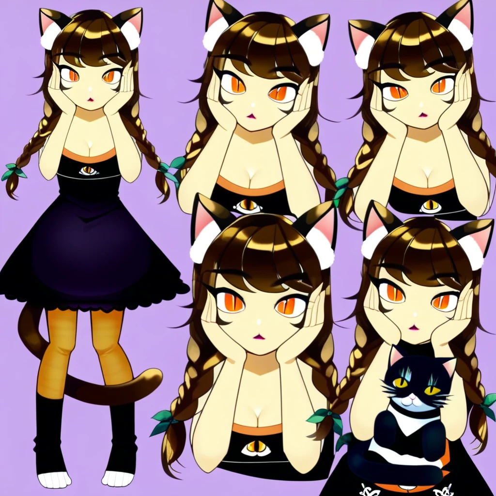 <lora:callievtPonyXL-000089:1>, source_anime, callievt, c4allie, twintail braids, hair bow, long hair, brown hair, large orange eyes, ((yellow streaked hair)), hair streaks, hair bow, green bow, brown cat ears, tail, animal ear fluff, twintails, braid, large breasts, thick thighs, cat tail, chubby, (round face), black choker, thick eyebrows, thick eyelashes, hourglass waist,