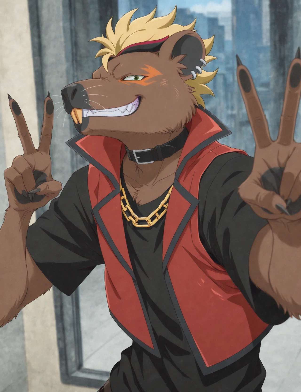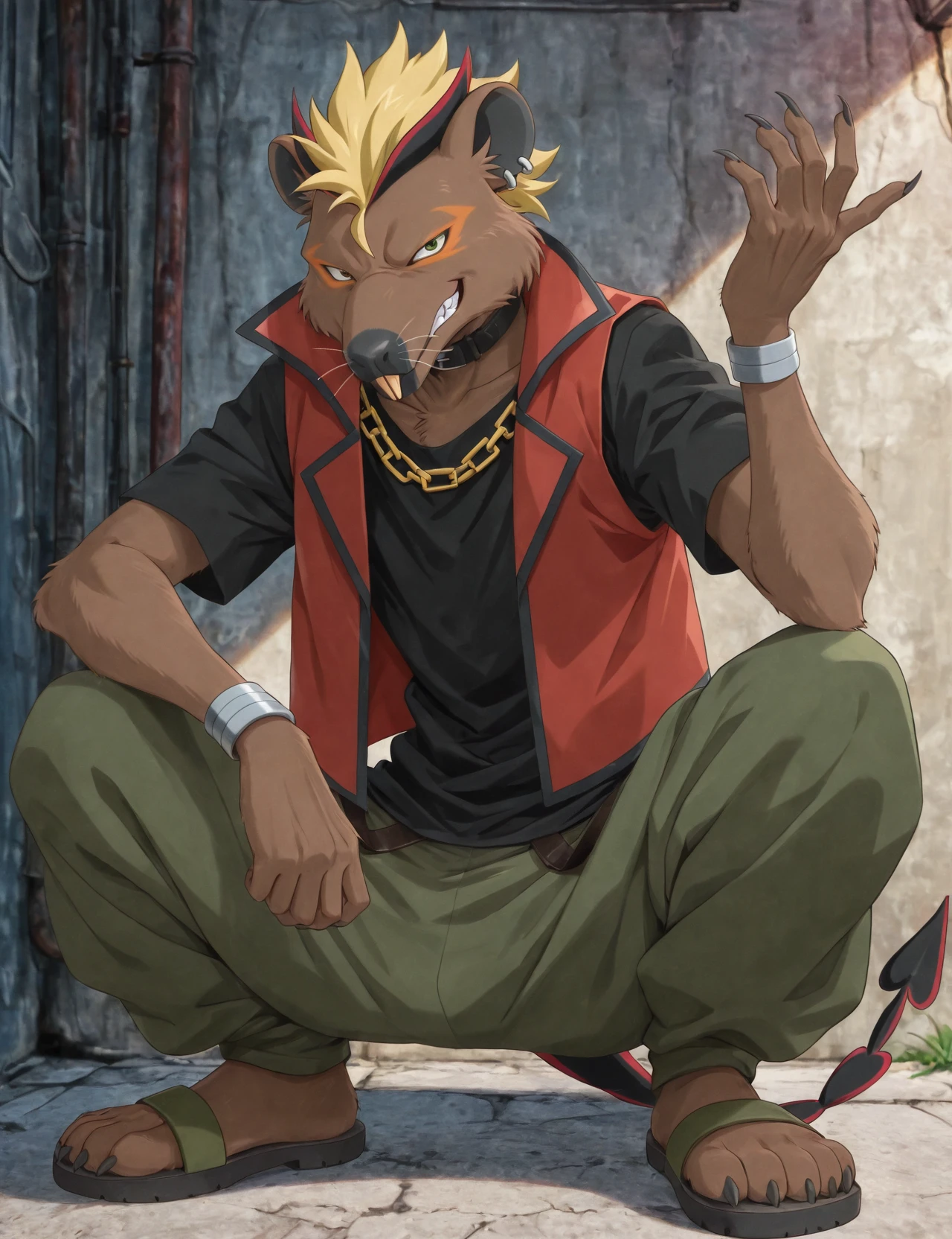 reinforcement: buckteeth, clothing, clothed, buckle collar, red vest, black shirt, bracelet, gold chain, green pants, segmented tail, sandals