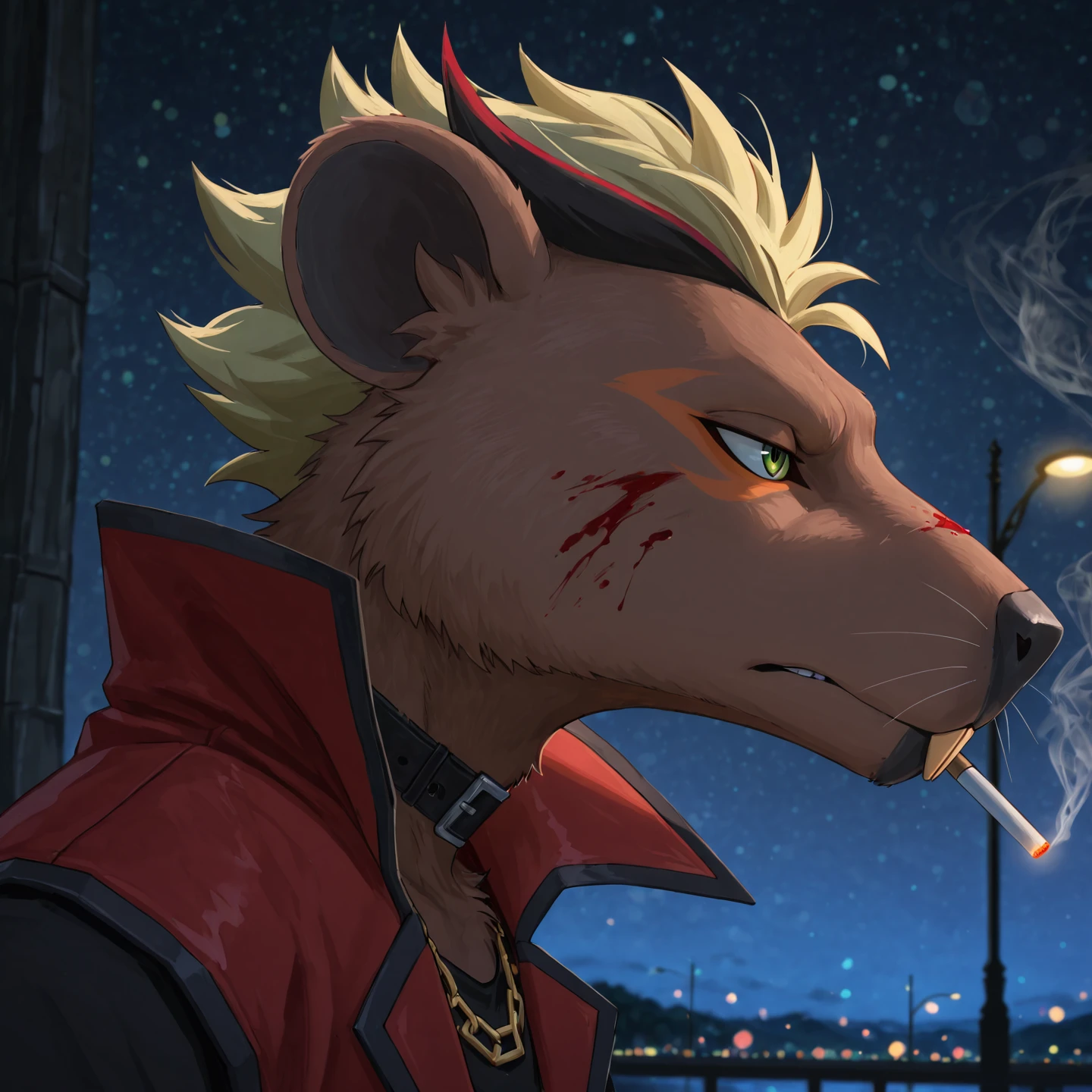 Optional: buckteeth, buckle collar, red vest, black shirt, bracelet, gold chain, green pants, segmented tail, sandals
