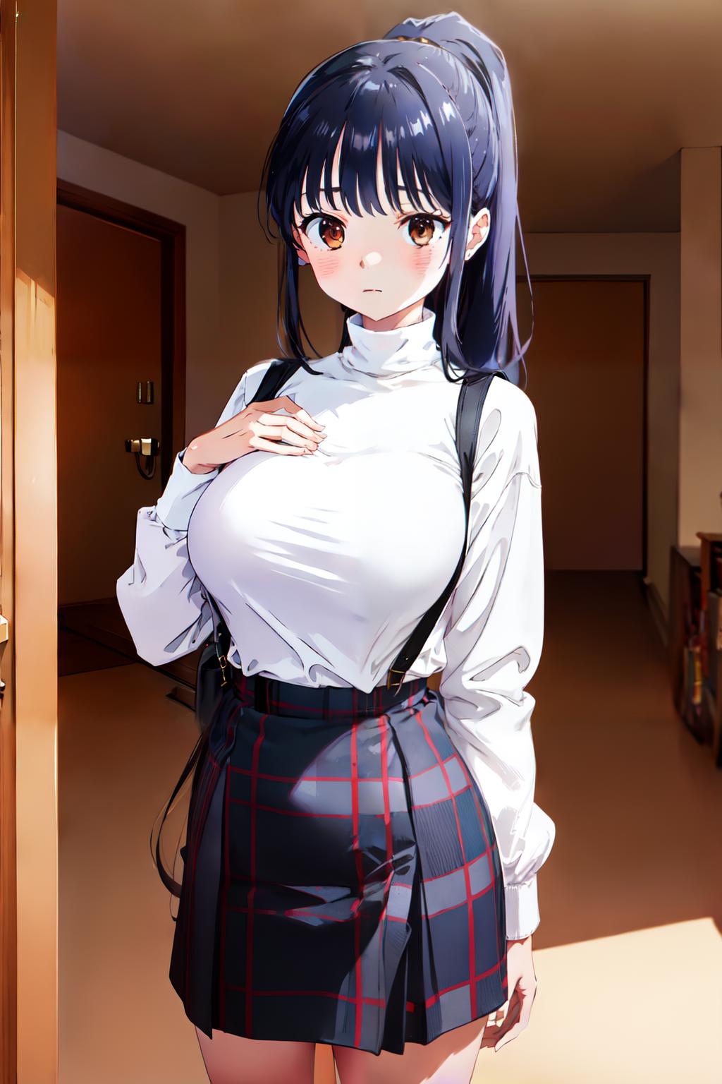 📌Prompt:Yamada Anna, white collared shirt, partially unbuttoned(部分解開), turtleneck(高領毛衣), black pleated skirt(黑打褶裙), plaid dress(格子連衣裙), checkered skirt(格子半身裙), plaid skirt(花格裙), suspender skirt(吊帶裙), suspenders(吊帶褲), blue jacket, school uniform, open clothes, long sleeves, ponytail, black lagwear, kneehighs, white footwear, uwabaki(學生室內鞋), blazer