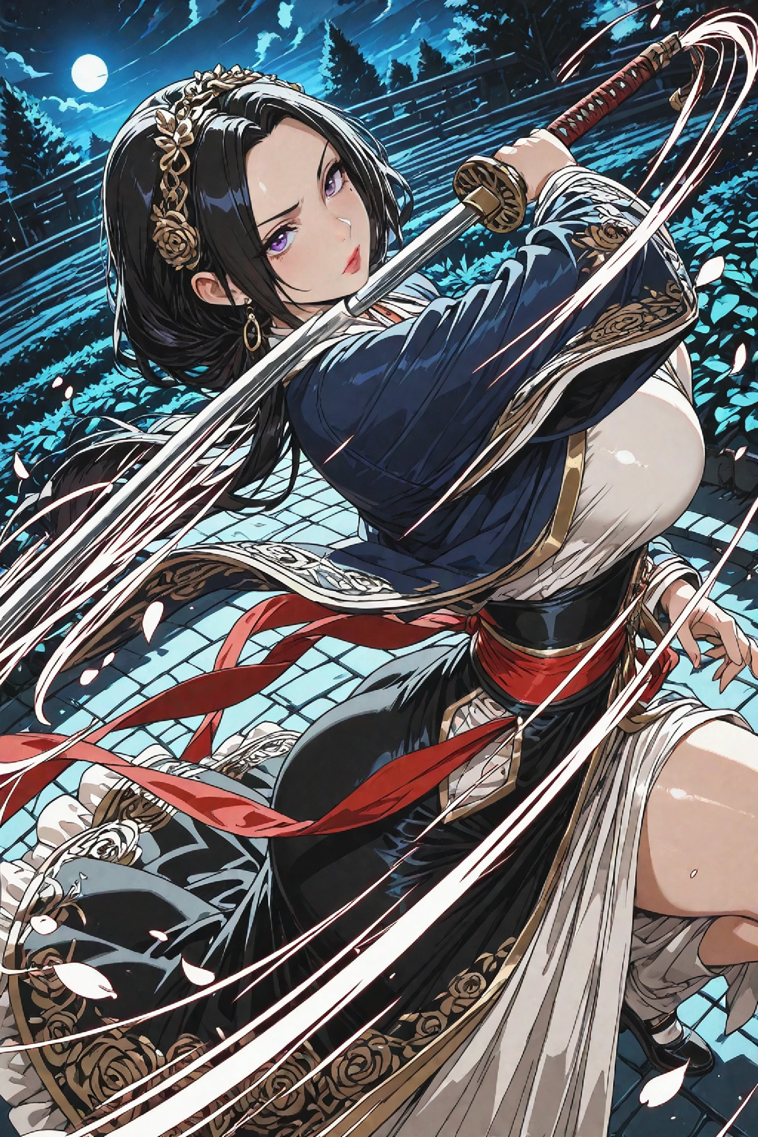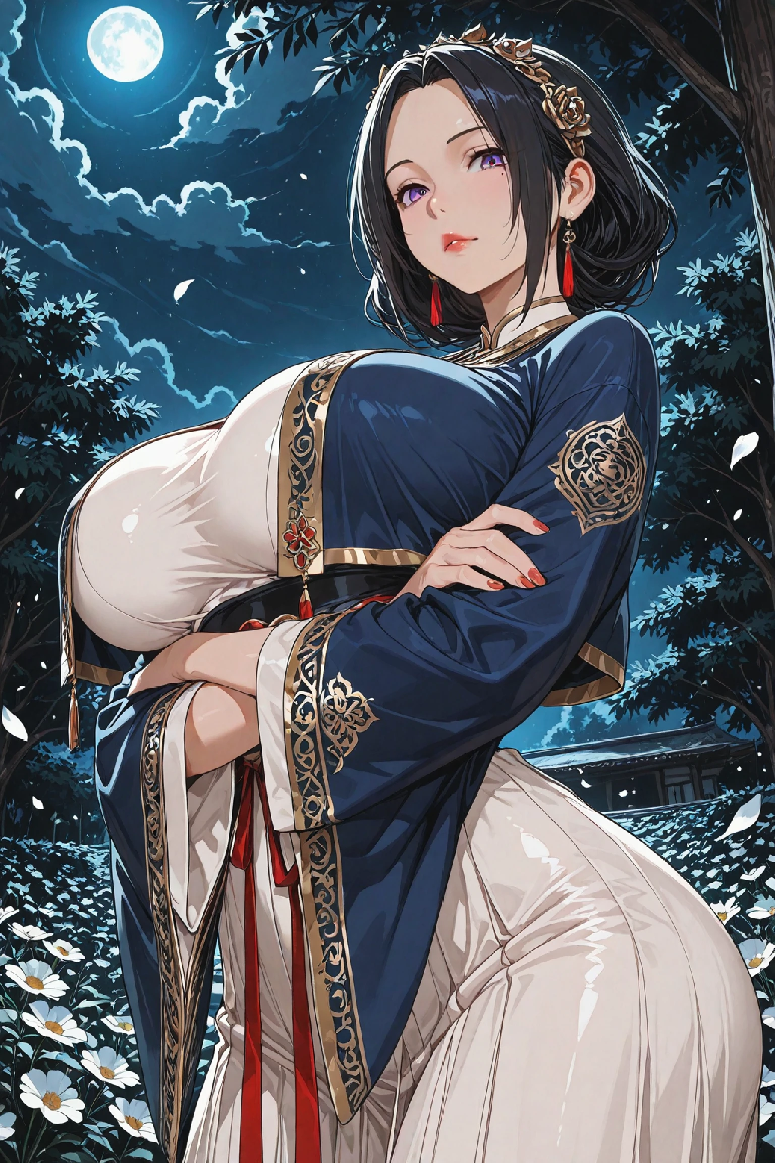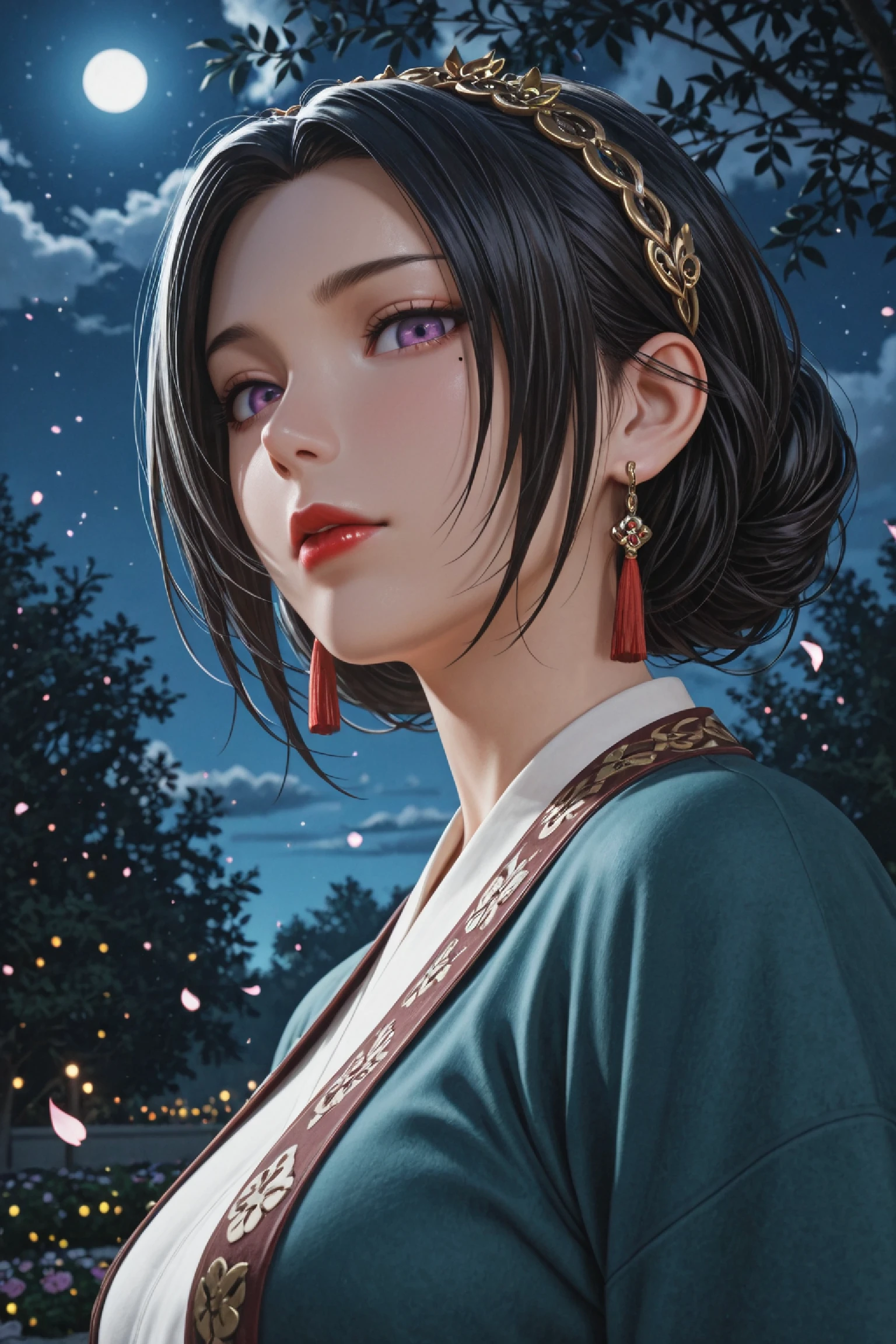1girl, jahye, mature female, sharp eyes, narrow eyes, purple eyes, beautiful eyes, mole under eye, thin eyebrows, thick lips, red lipstick, black hair, tucked hair, updo, low bun, hair gathered at nape, side parted hair, long side bangs, layered hair, braided hairband, hair ornament, golden hair ornaments, jade hairpin, tassel earrings, large breasts, wide hips, narrow waist, thick thighs