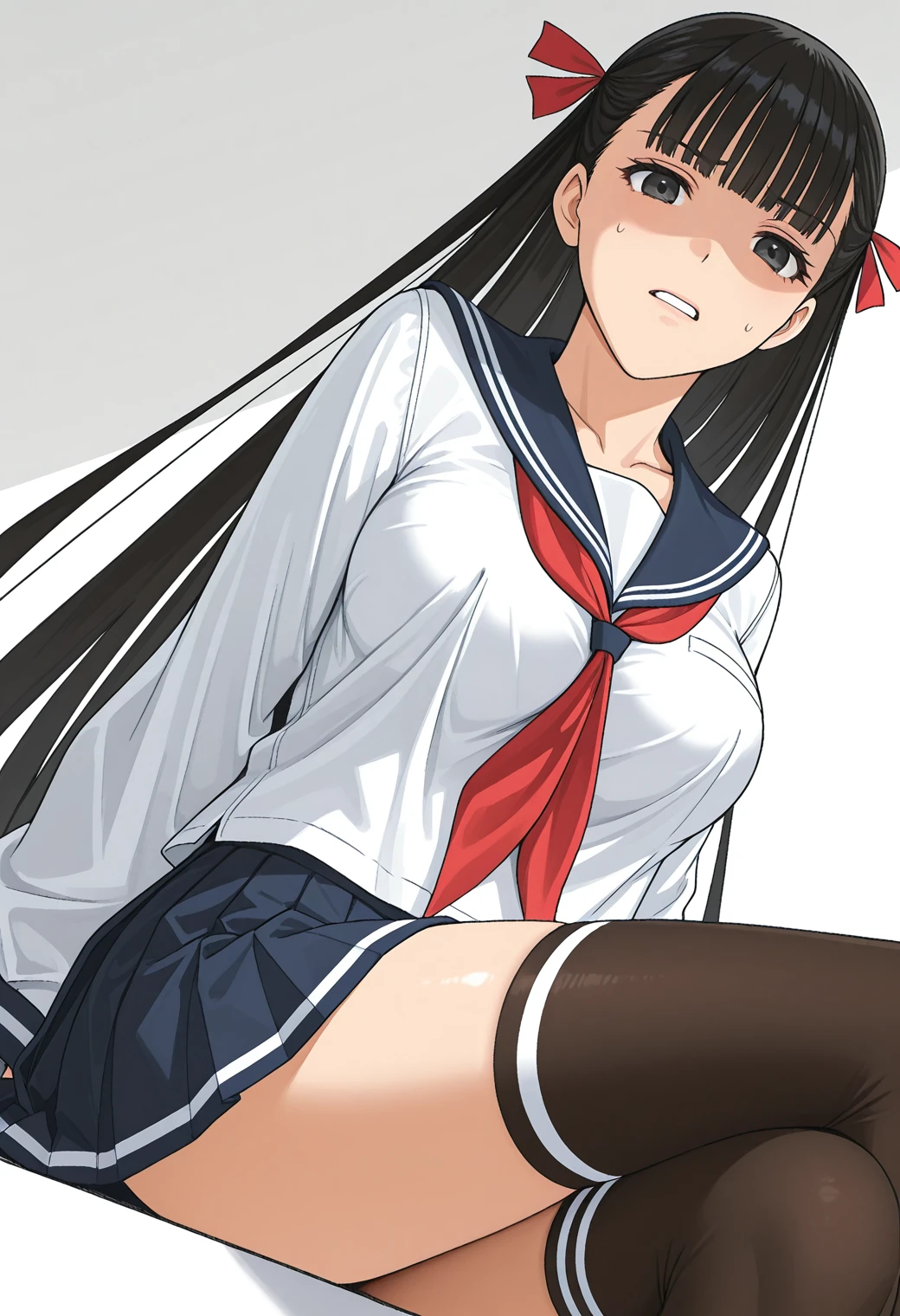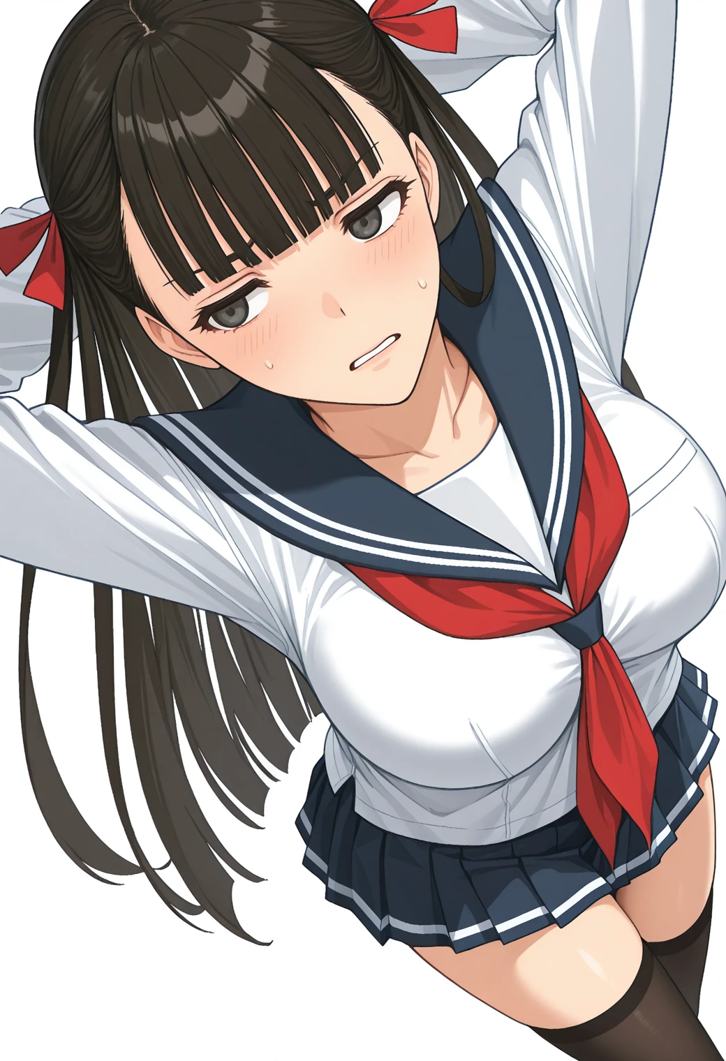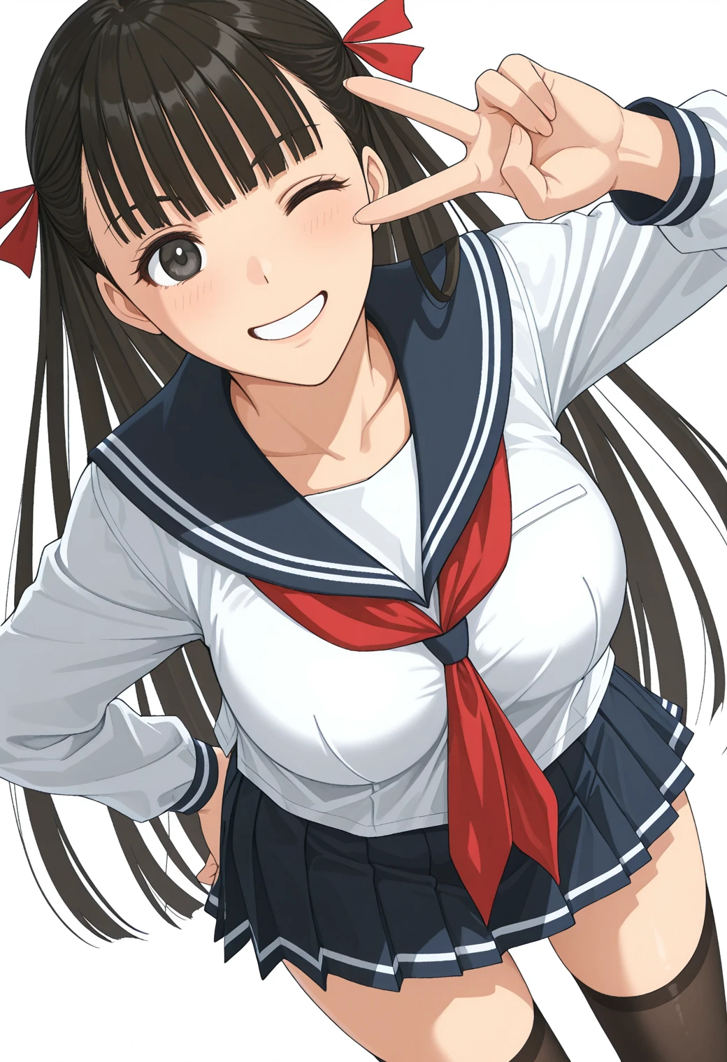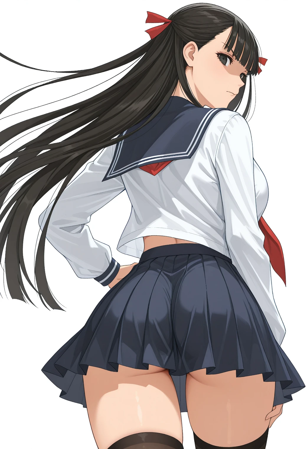 serafuku, blue sailor collar, red neckerchief, blue pleated skirt, mini skirt, black thighhighs, white stripe,