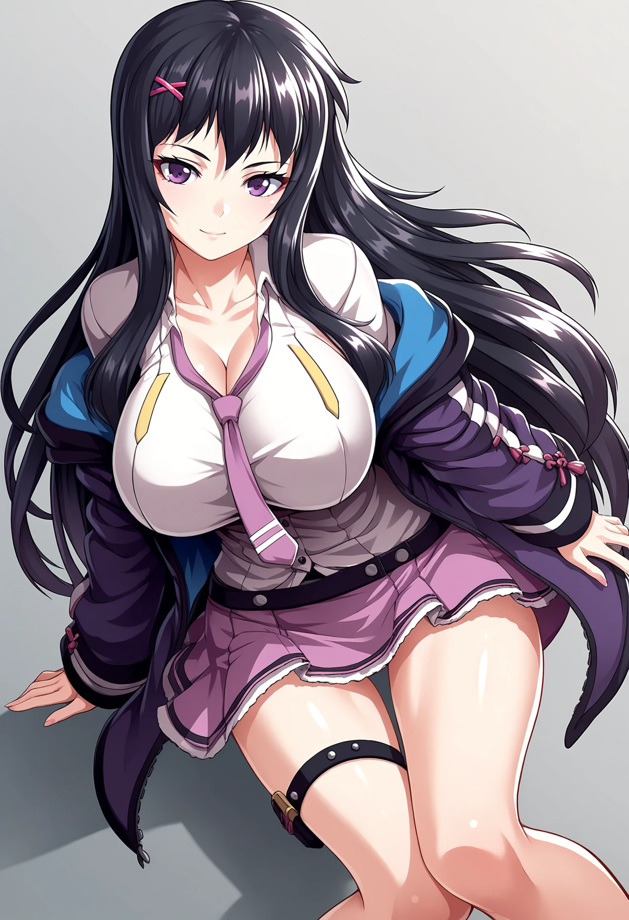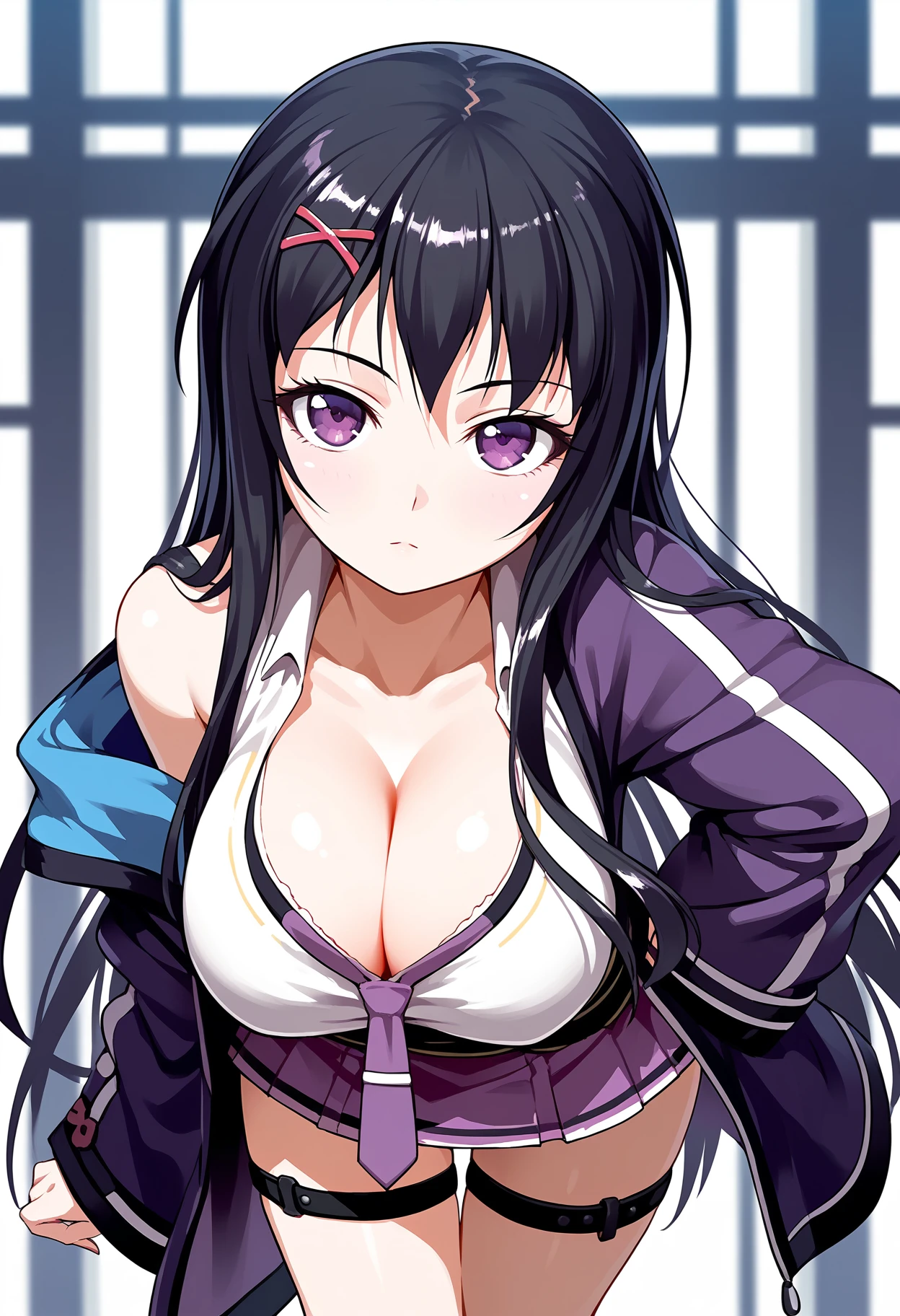 , hair ornament, skirt, necktie, jacket, shirt, thigh strap, cleavage