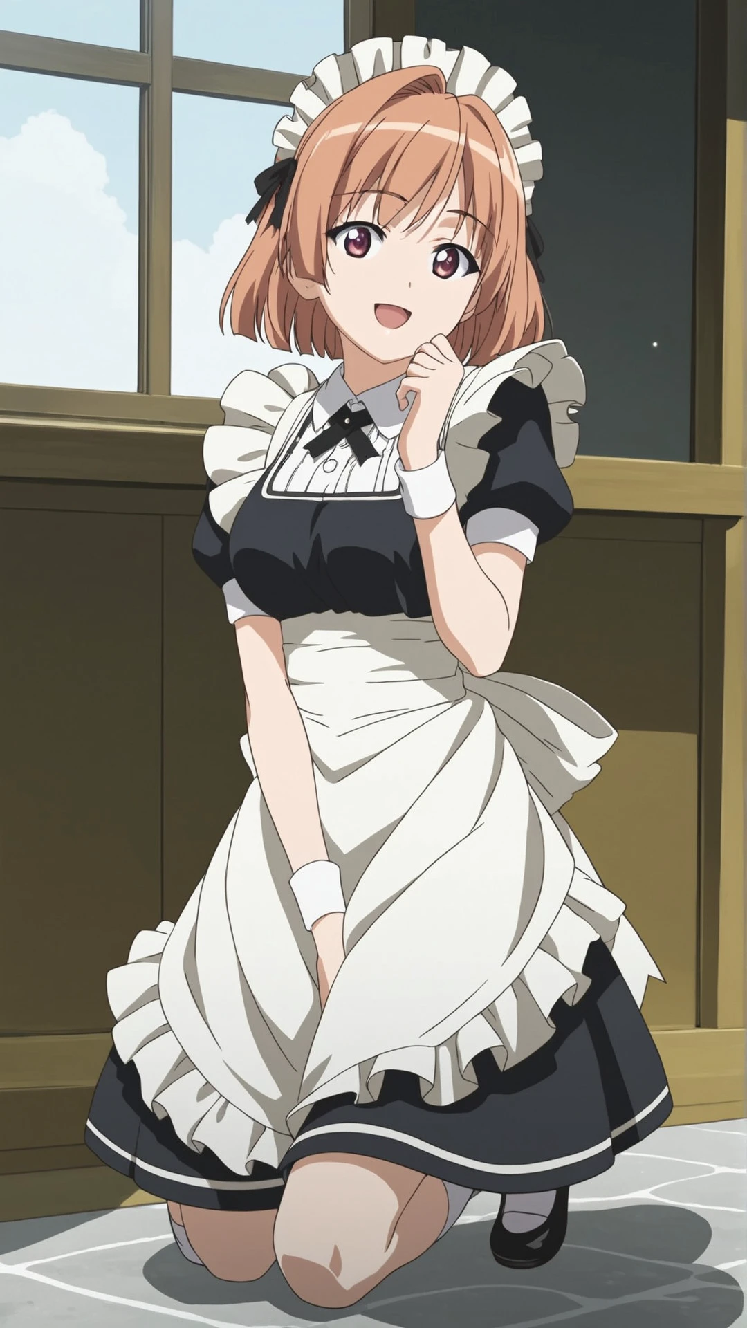motoka_nogisaka, an anime girl, 1girl, solo, smile, short hair, open mouth, brown hair, apron, wrist cuffs, maid, maid headdress, window,