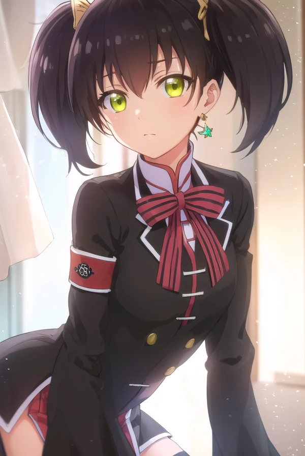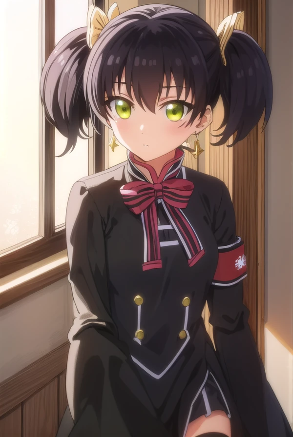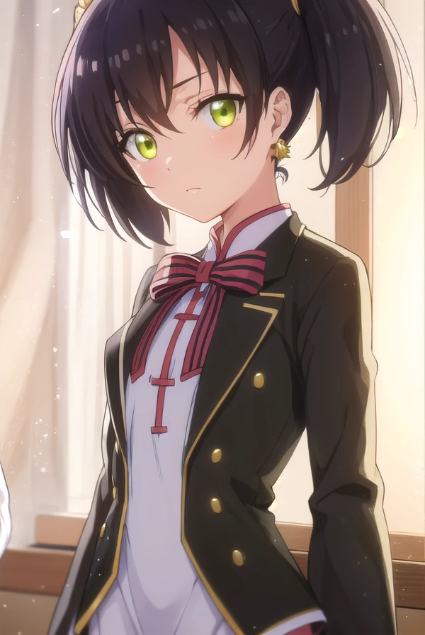 kochou wang, short hair, black hair, twintails, (green eyes:1.3),