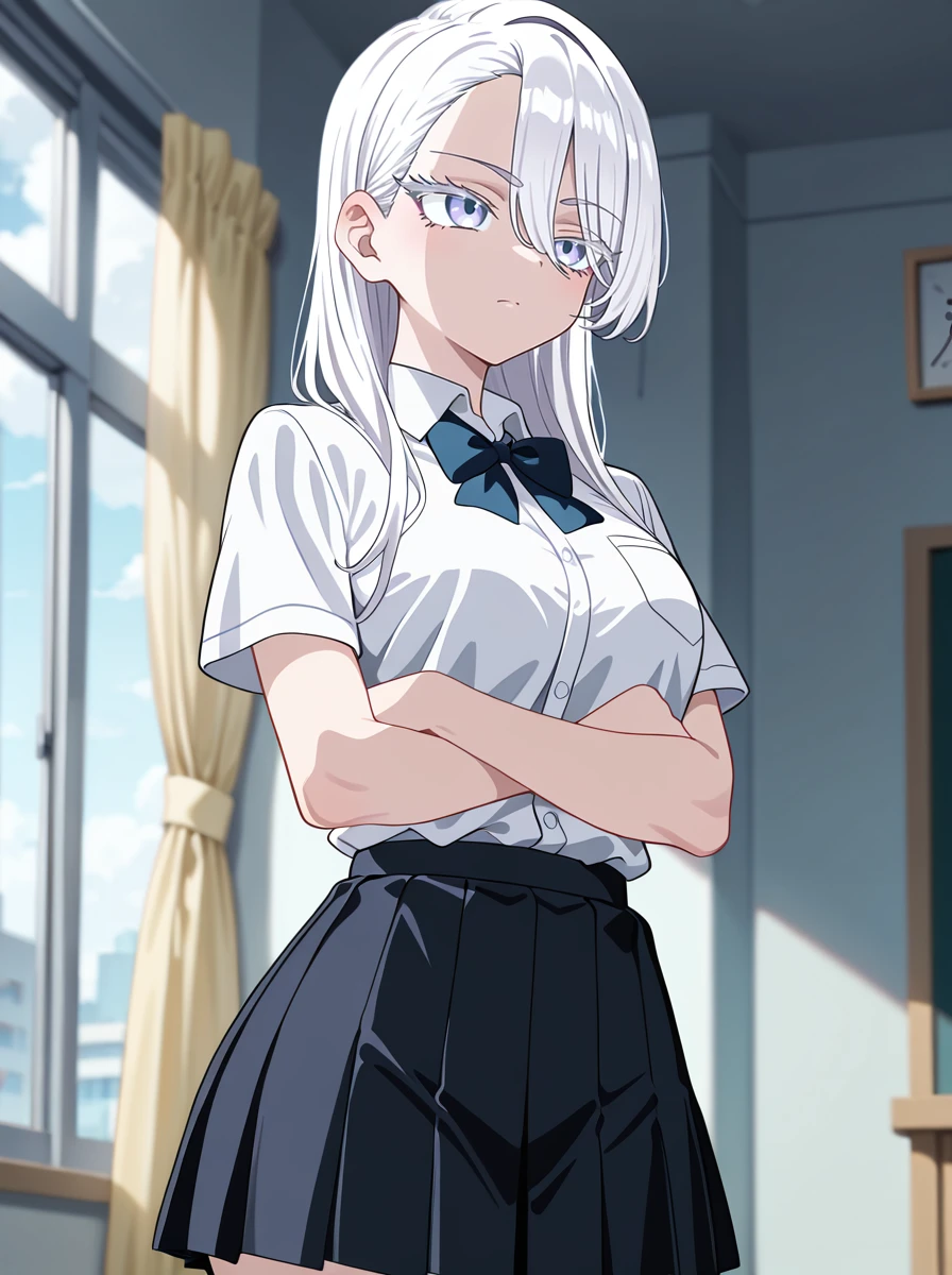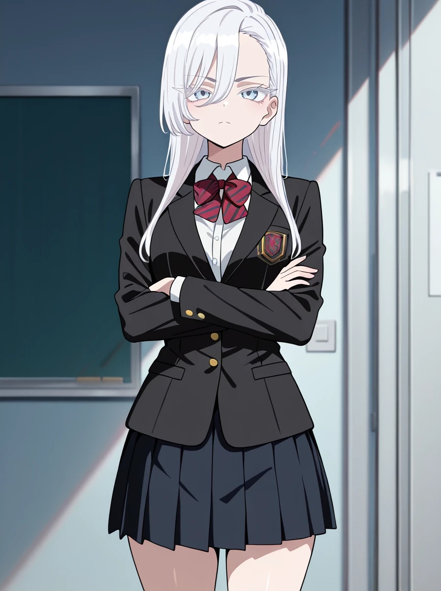 1girl, long hair, solo, white hair eyelashes, school uniform, pleated skirt, crossed arms, black_jacket, long sleeves,