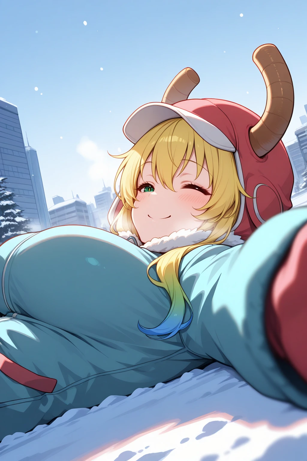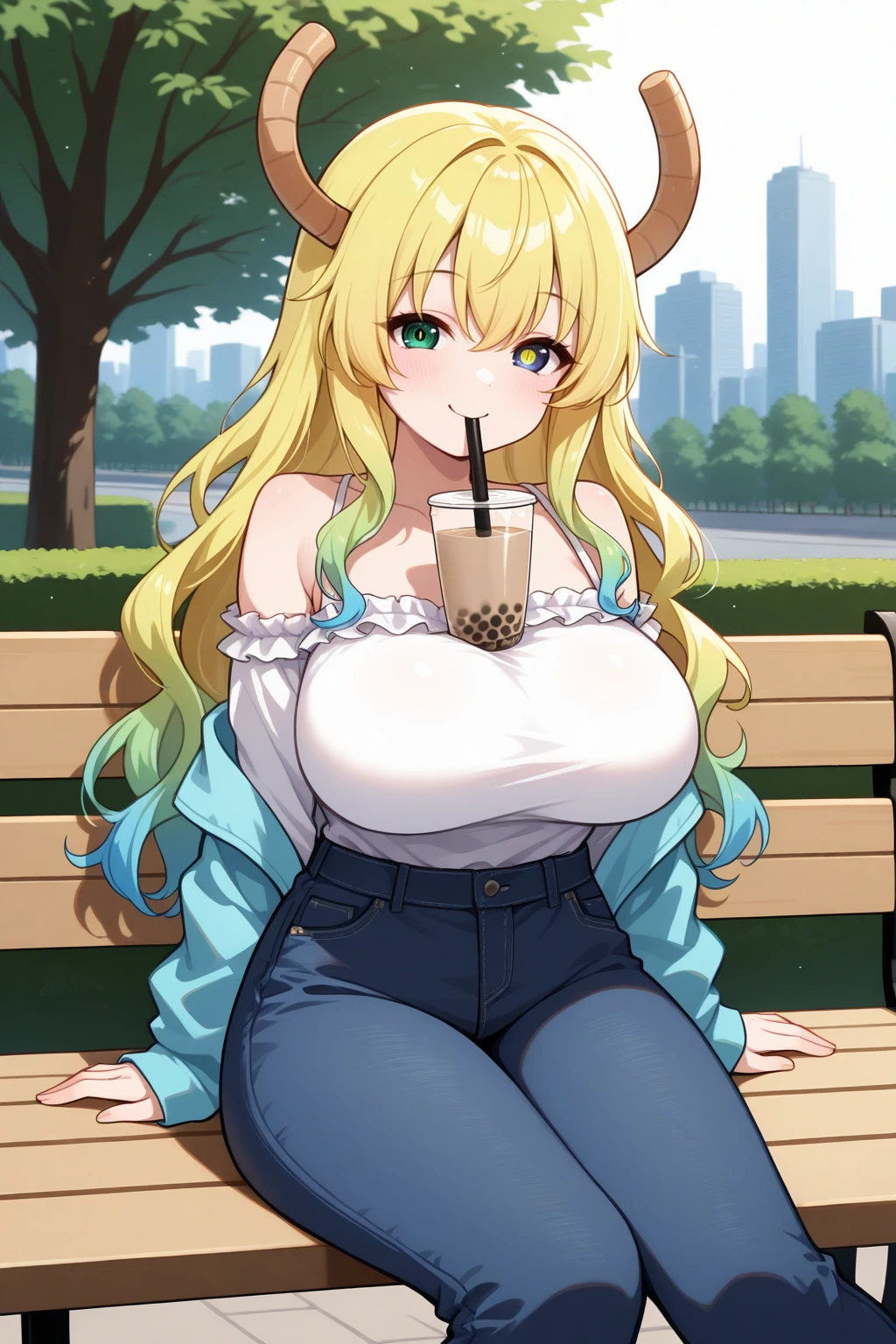 Appearance : mlc, dragon horns, huge breasts, heterochromia, green eyes, blue eyes, slit pupils, multicolored hair, blonde hair, green hair, blue hair, hair between eyes