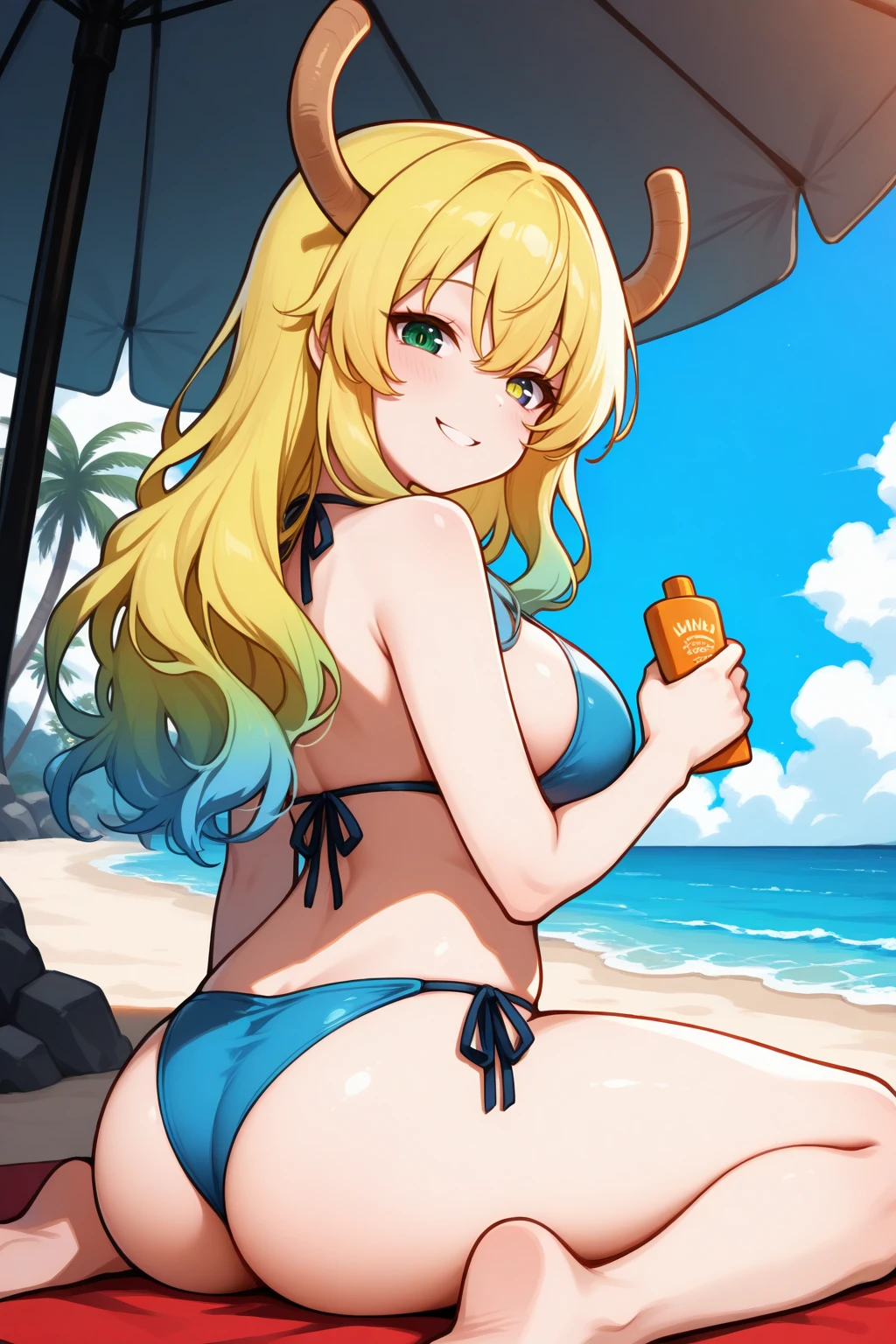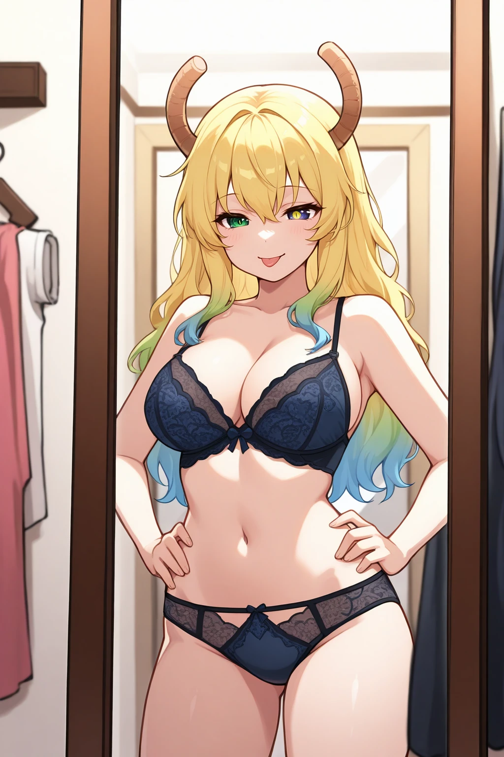mlc, dragon horns, huge breasts, heterochromia, green eyes, blue eyes, slit pupils, multicolored hair, blonde hair, green hair, blue hair, hair between eyes