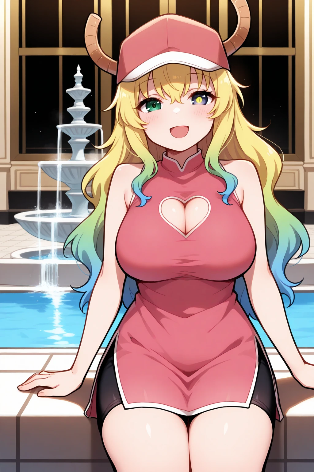 Outfit 2 : baseball cap, horns through headwear, sleeveless dress, pink dress, cleavage cutout, heart cutout, bike shorts, black shorts