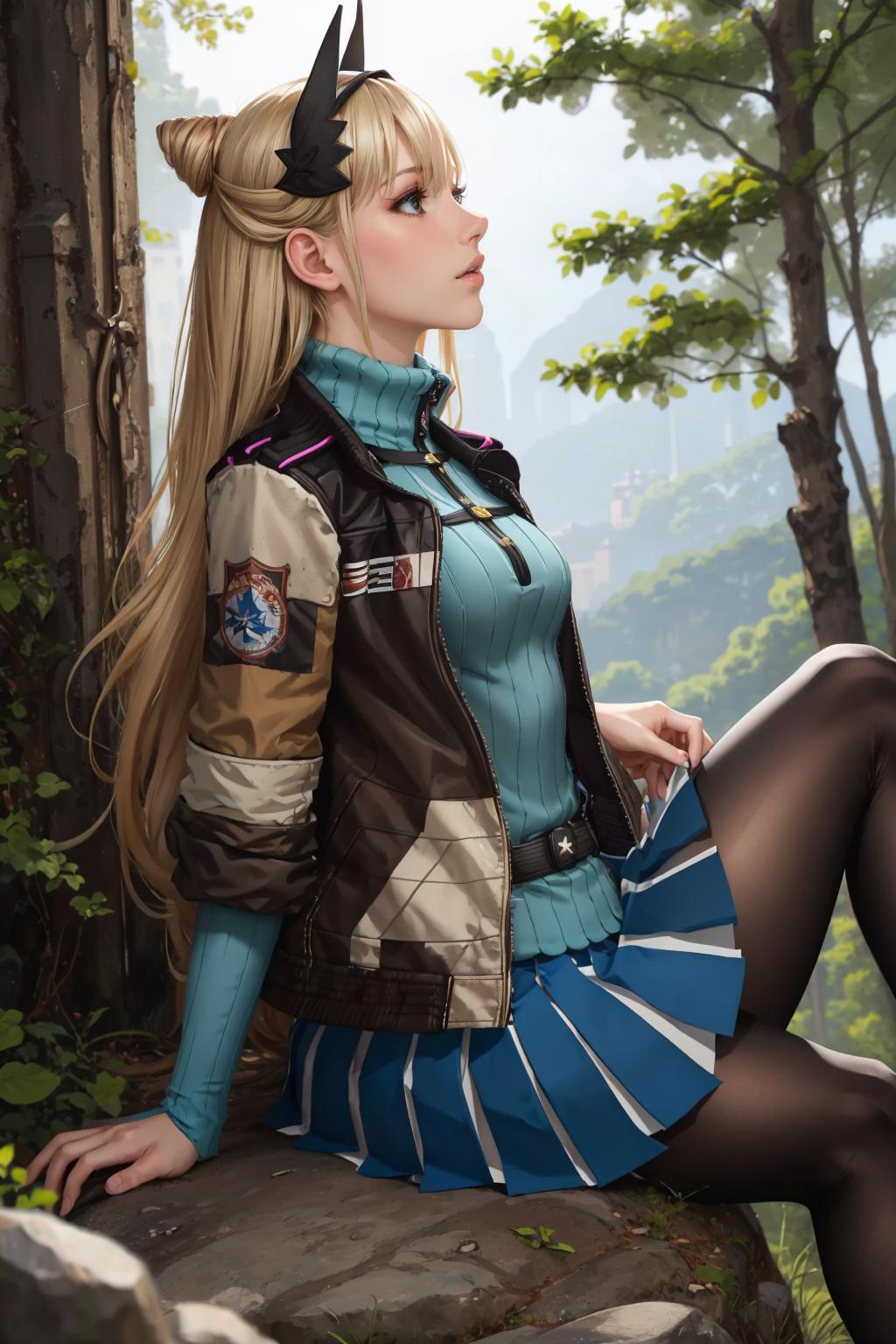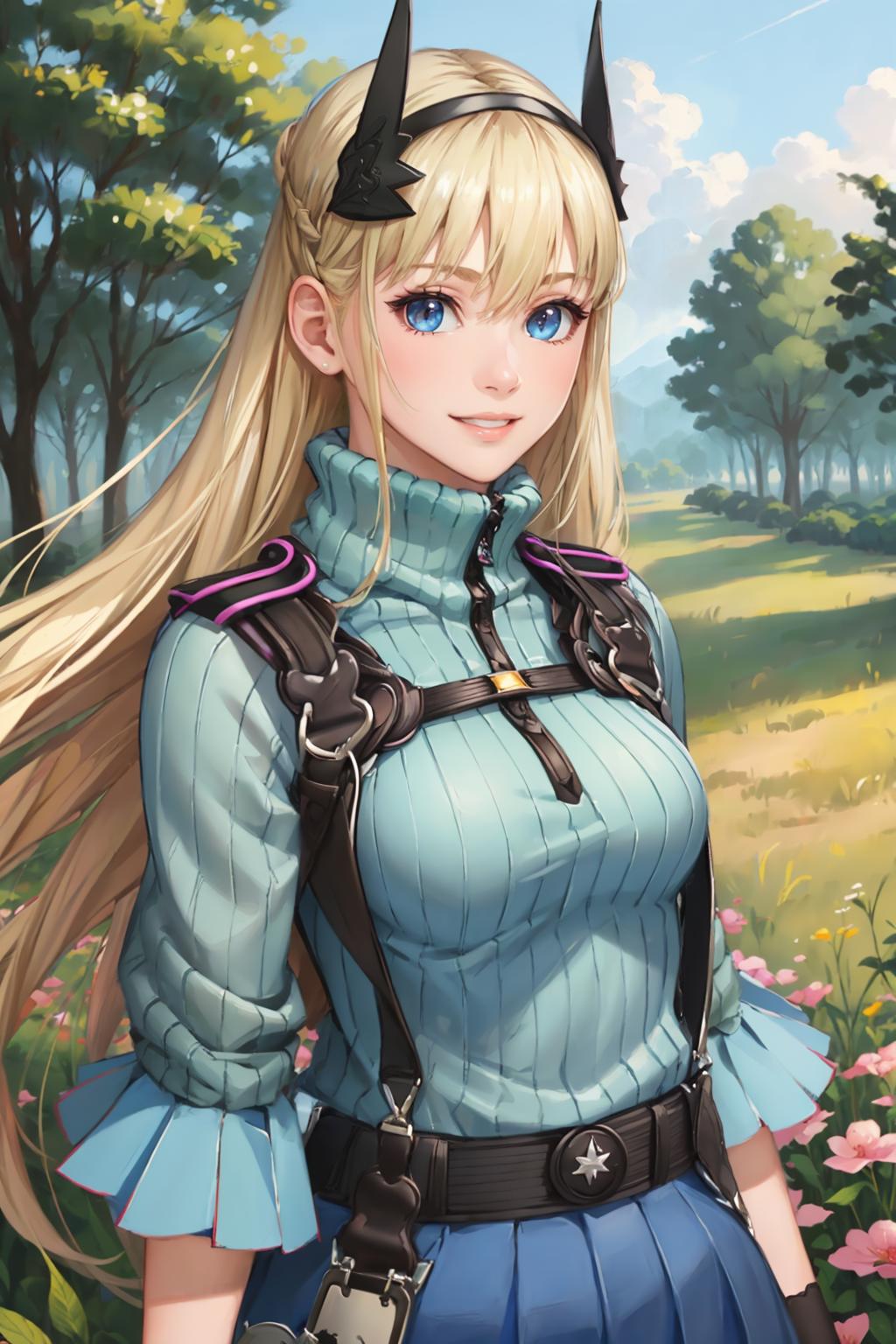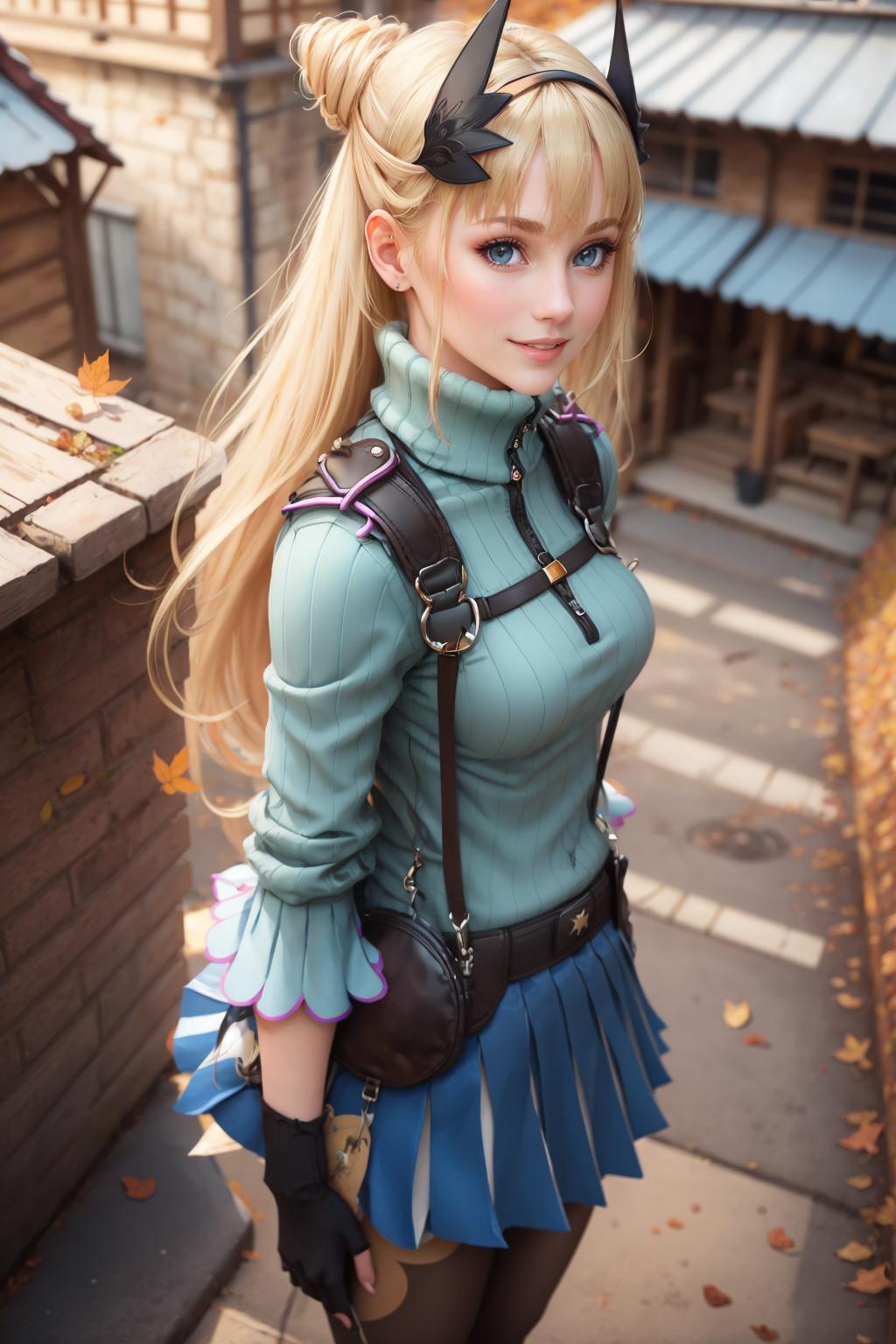 Add "hairband, hair ornament, jacket, ribbed sweater, turtleneck, fingerless gloves, skirt, pantyhose" for her typical look. The jacket can be removed.