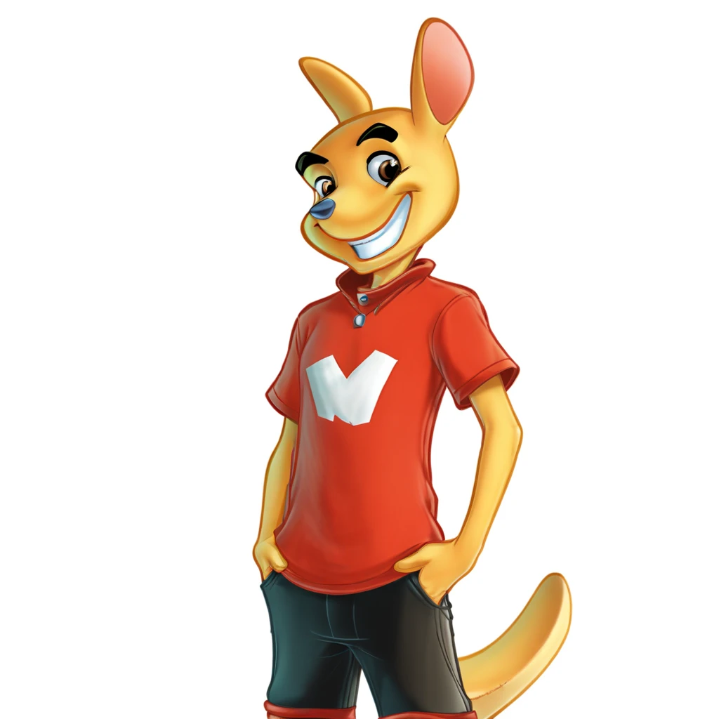 kangaroo, smile, , furry, white background, simple background, full body, walibi, solo, red t-shirt, yellow furs, tail, male focus, identical art style, teen, 1boy, solo,shirt