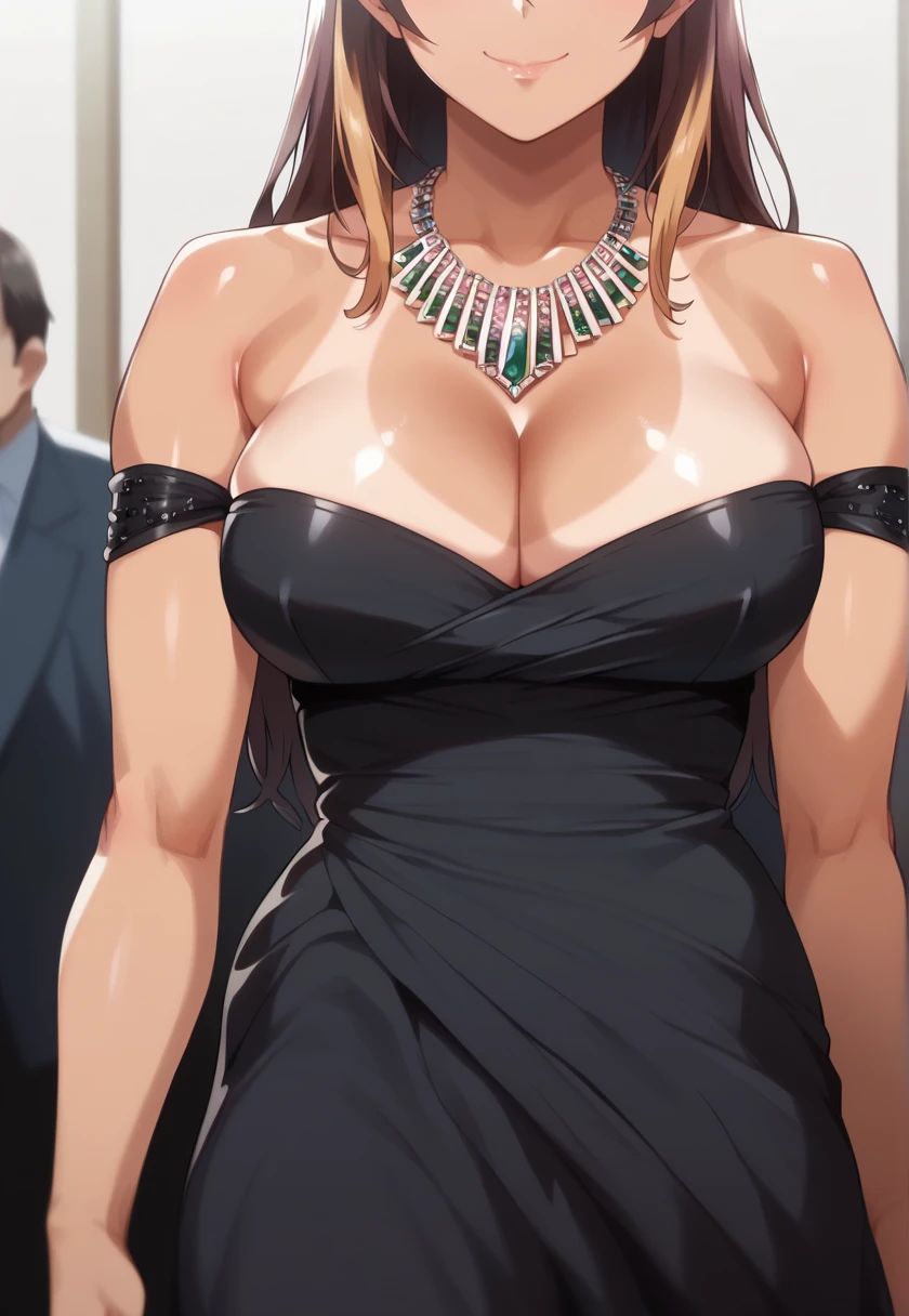 short hair, brown hair, multicolored hair, green eyes, large breasts, tanlinesAttire