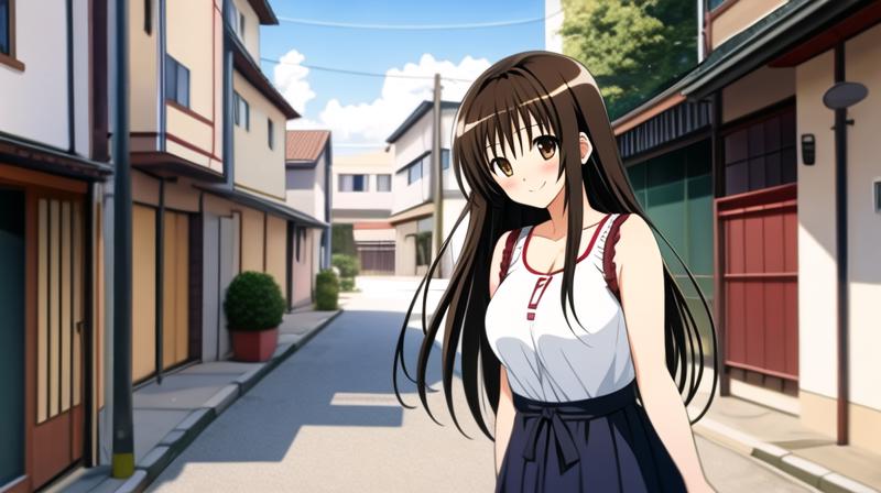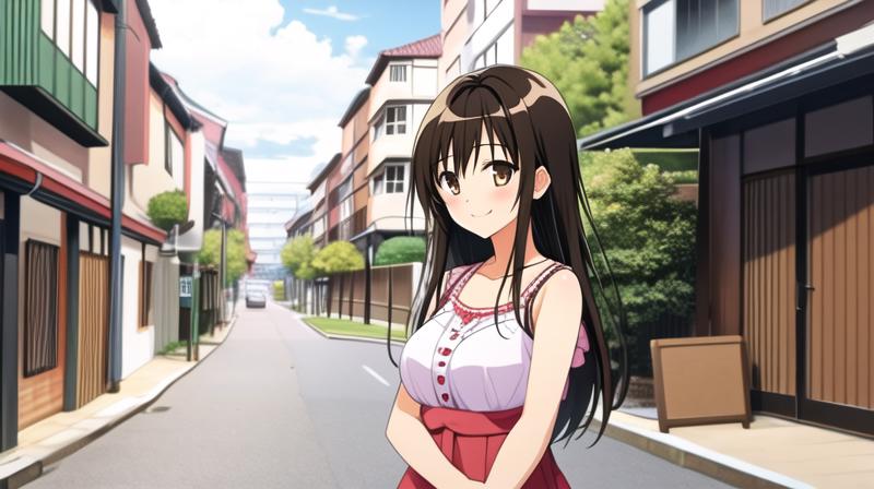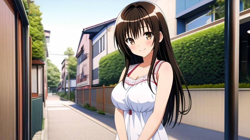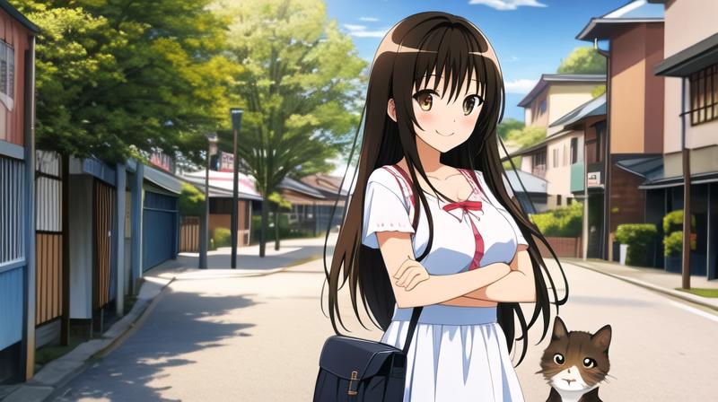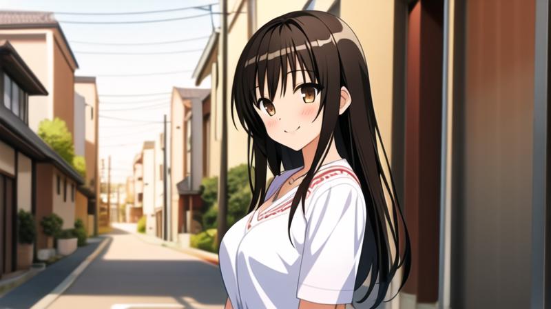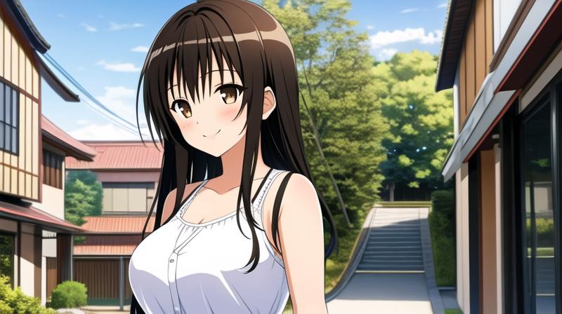 Character: kotegawa yui, black hair, long hair, long bangs, brown eyes, large breasts