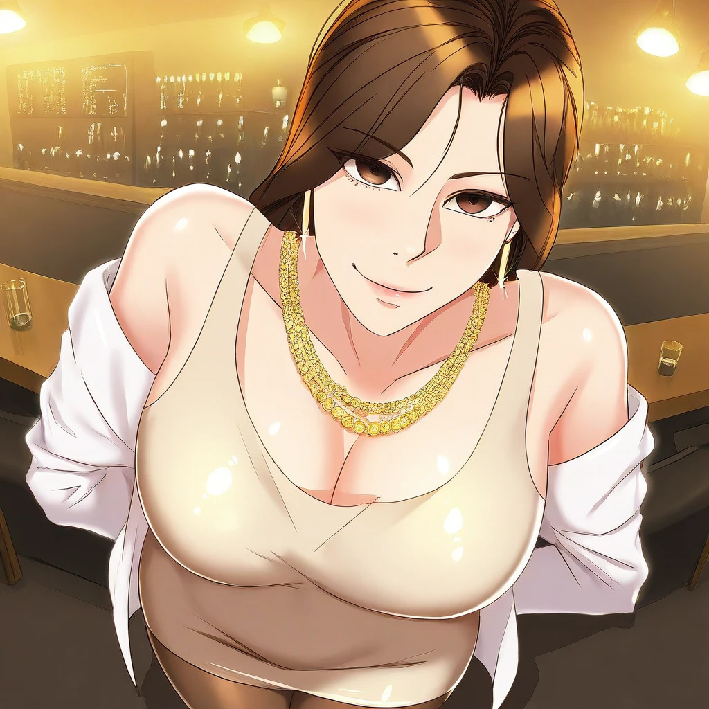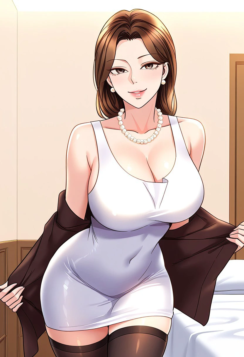6. ((sexy beige dress, obscene cleavage, huge cleavage, brown thighhighs, gold necklace, long gold earrings, slinging white suit jacket, )) + brown high heels,