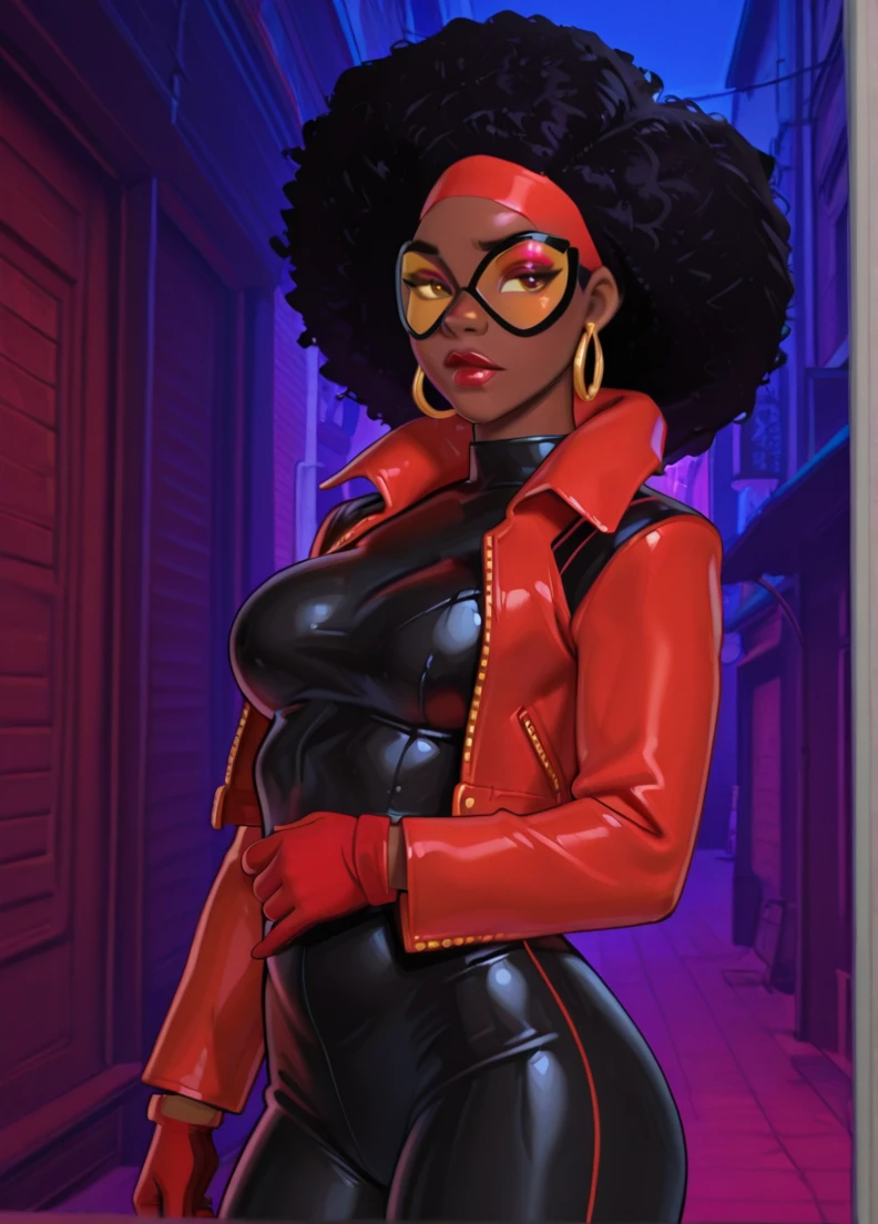 jacket, red gloves, makeup, lips, breasts, jewelry, gloves, hoop earrings, sunglasses,