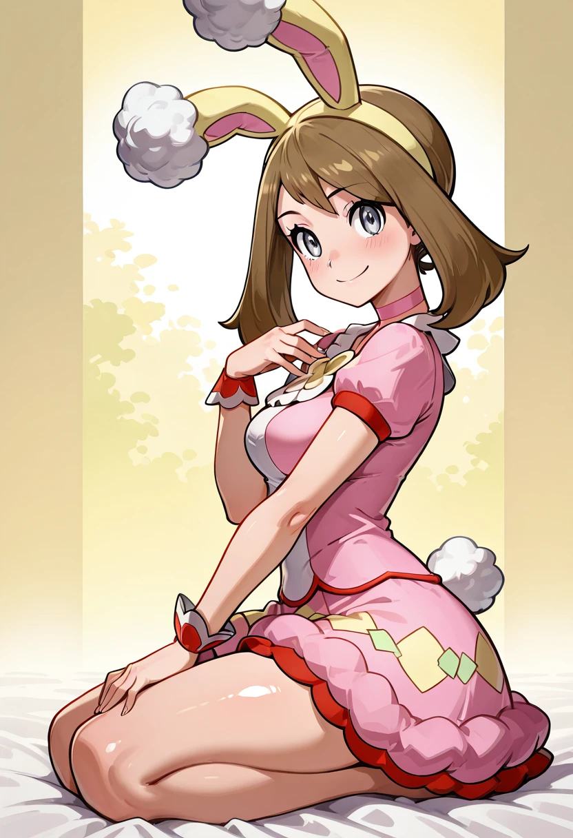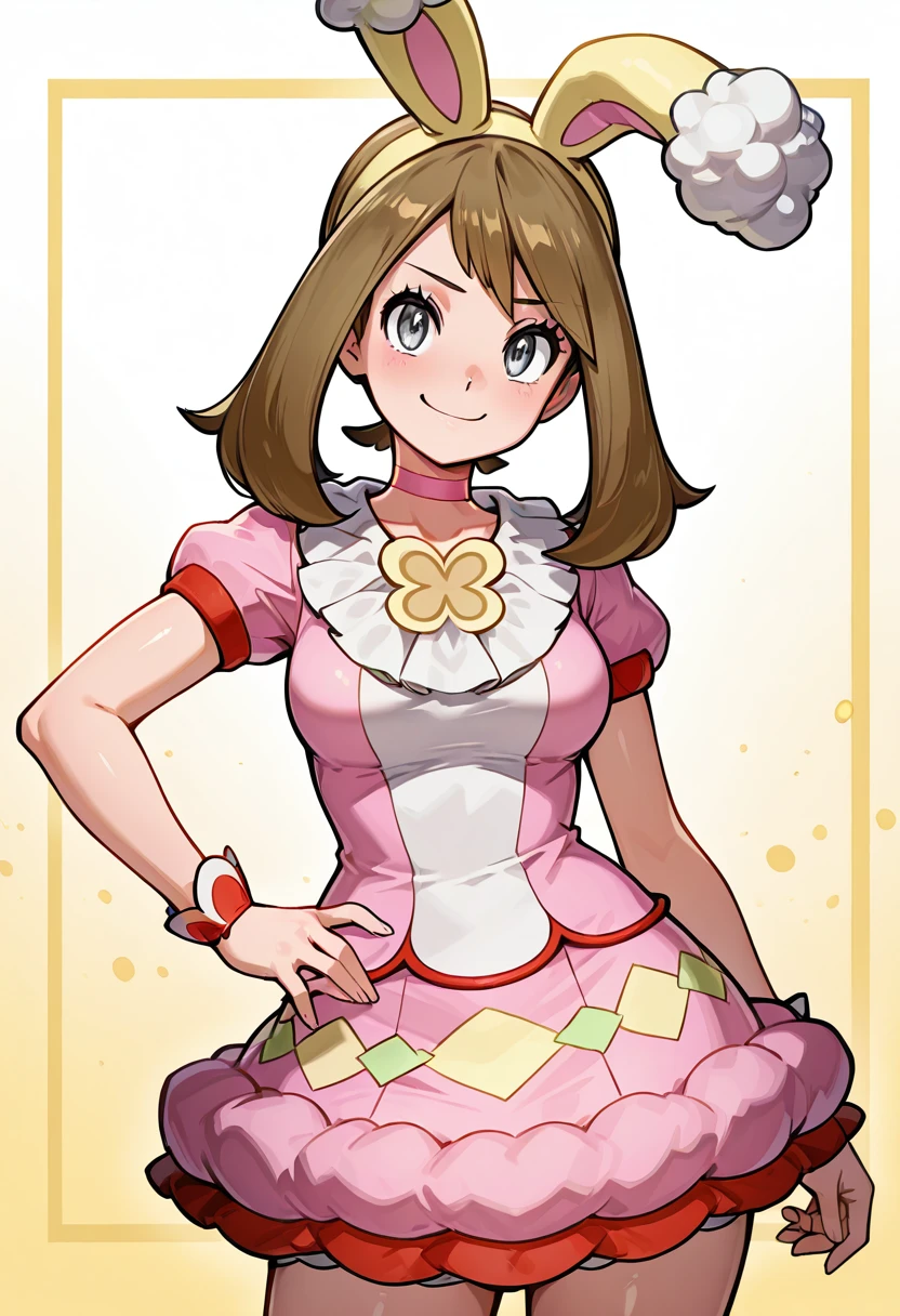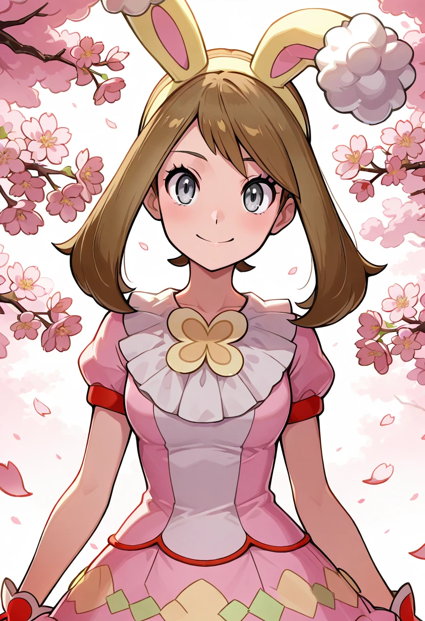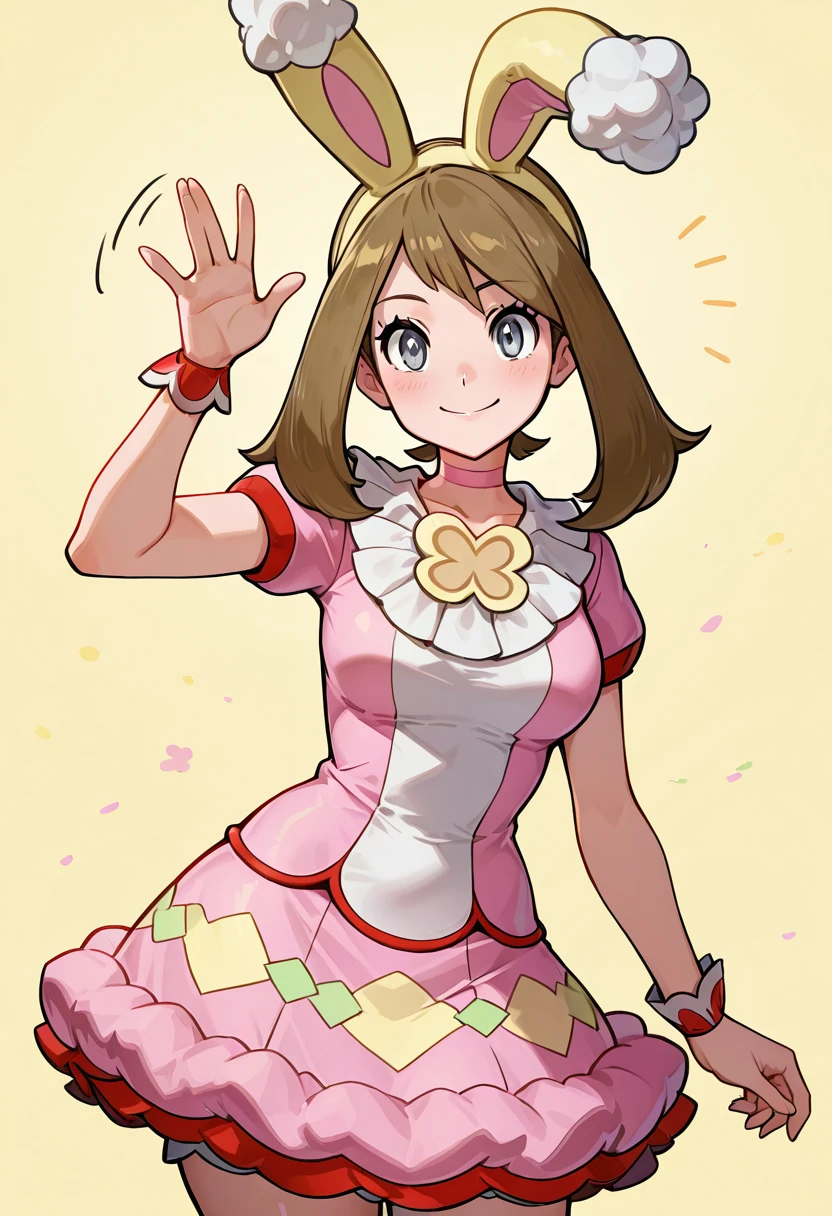 zzMaySpring, grey eyes, brown hair, medium hair, rabbit ears, yellow hairband, pink dress, short sleeves, pink choker, wrist cuffs,