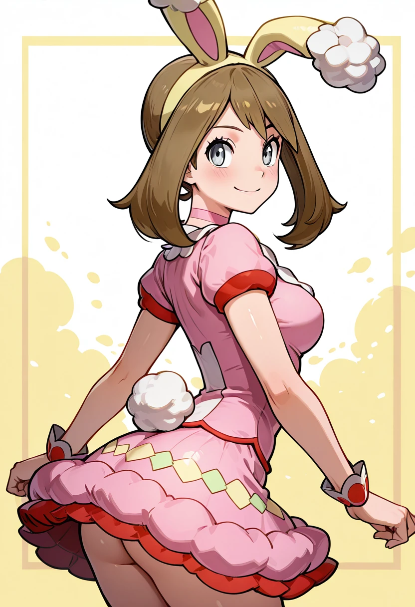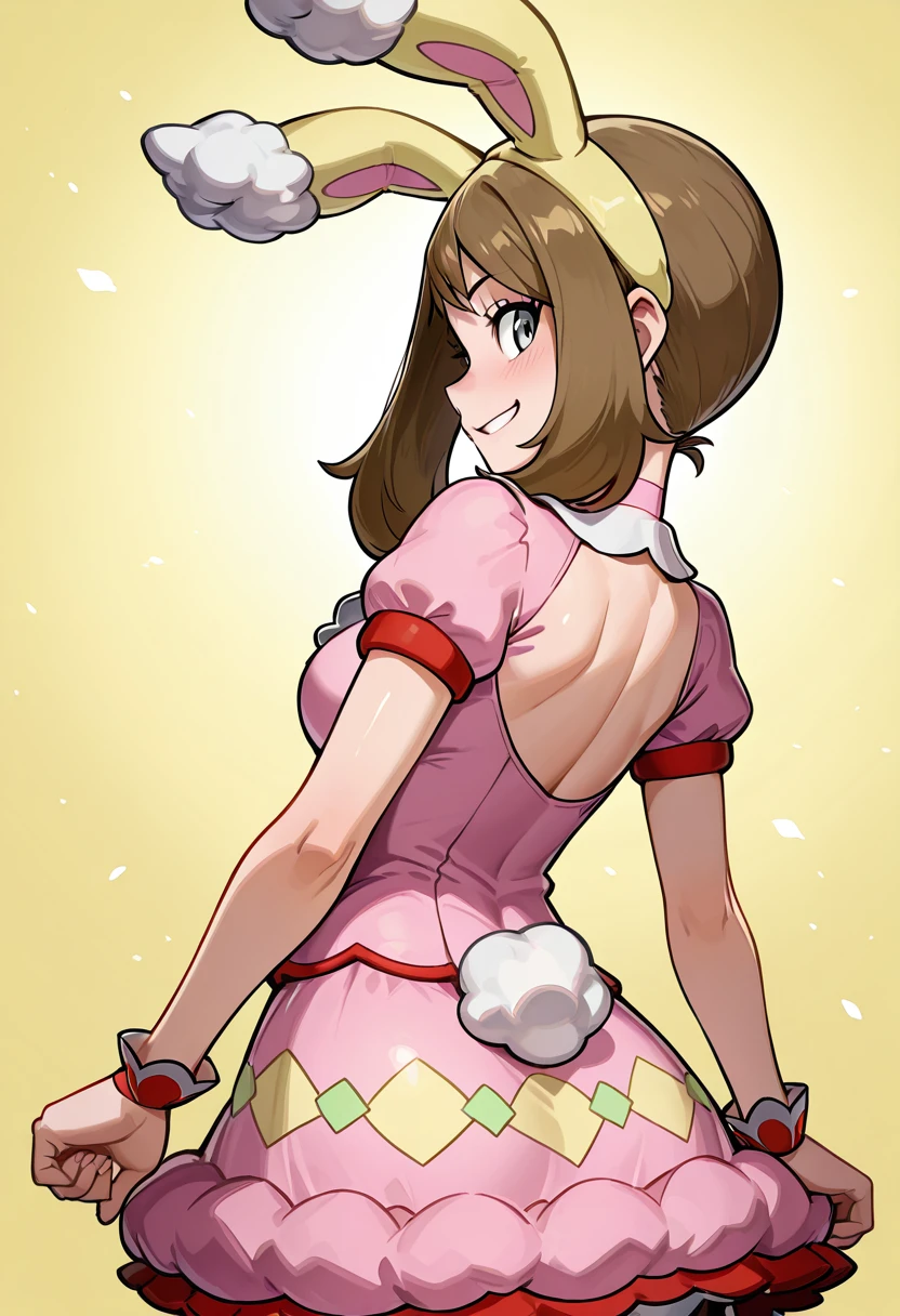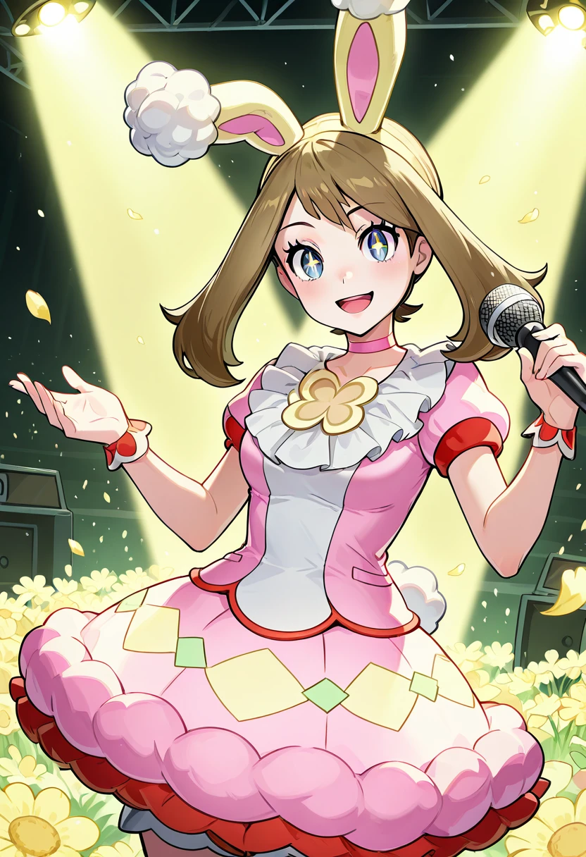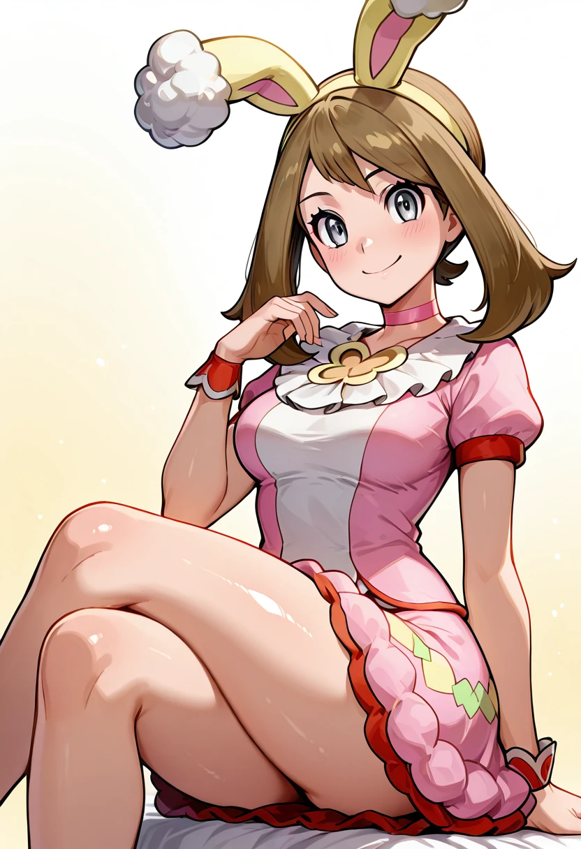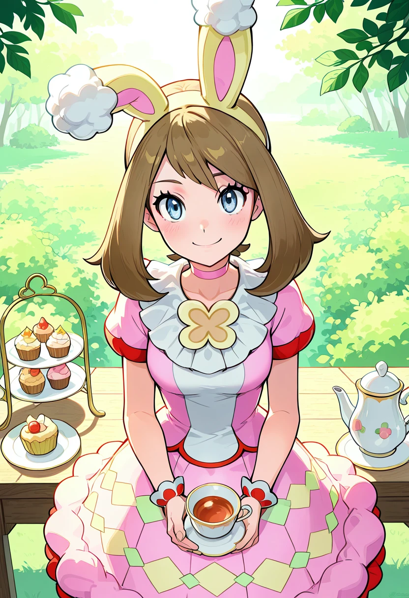 zzMaySpring, grey eyes, brown hair, medium hair, rabbit ears, yellow hairband, pink dress, short sleeves, pink choker, wrist cuffs,
