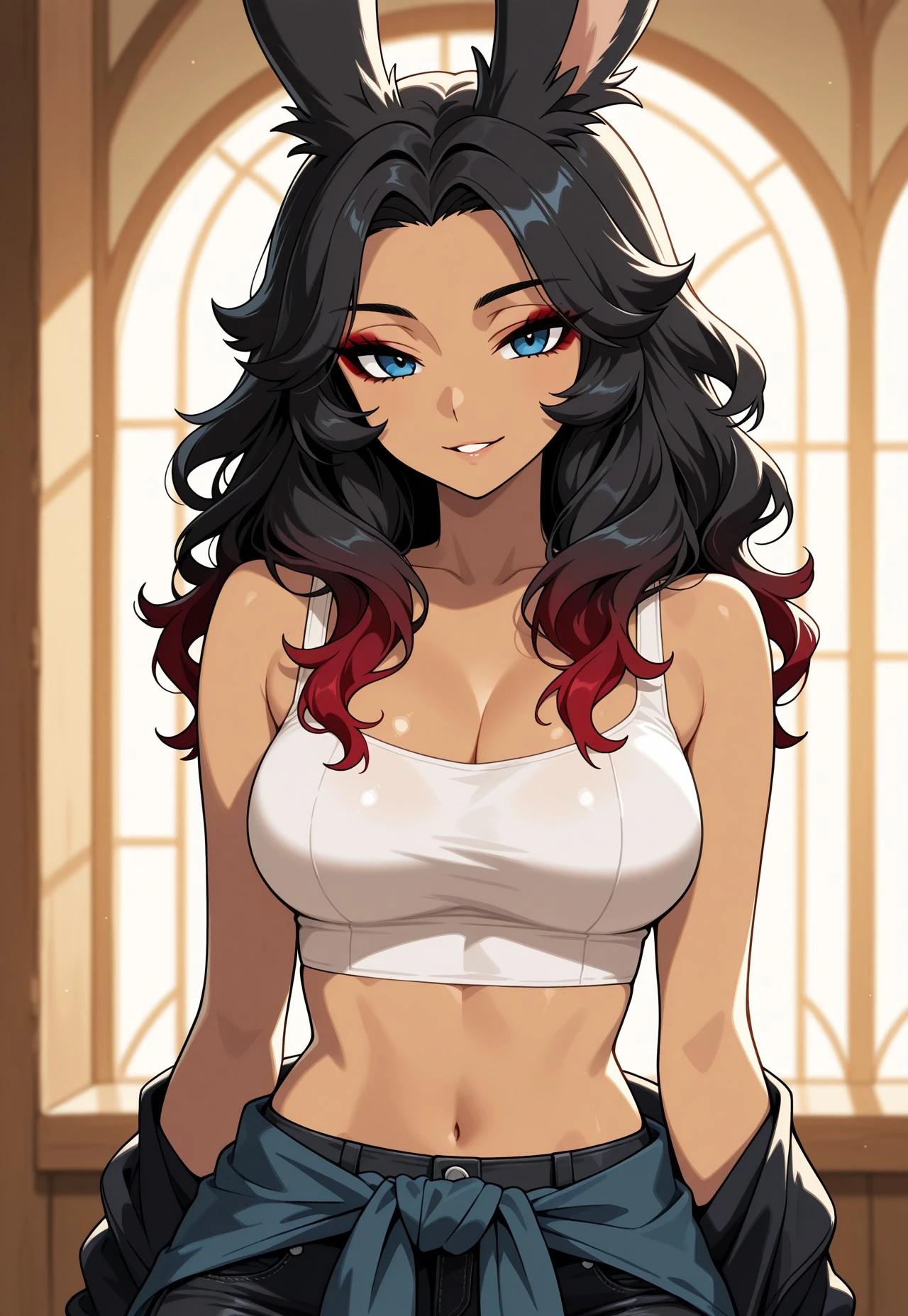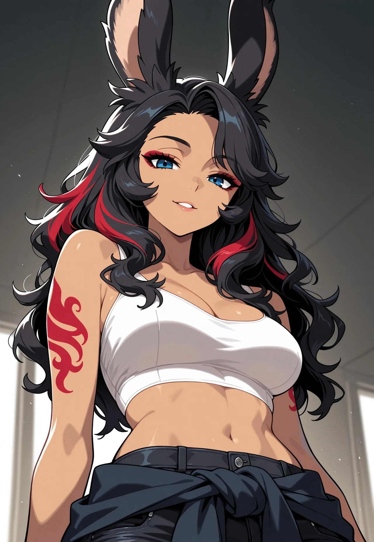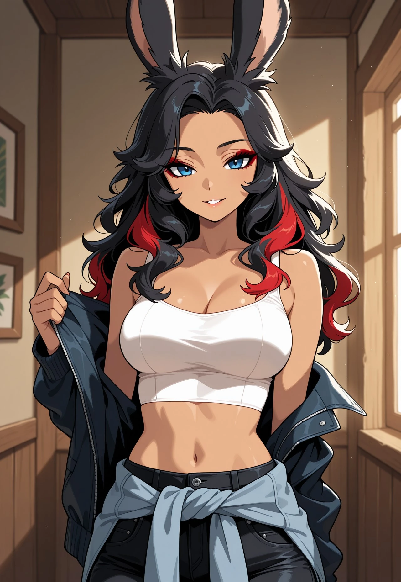 Viera woman, black hair, red streaks in hair, wavy hair, beautiful, blue eyes, tan, white Crop top, cami top, jacket tied around waist, black skinny jeans