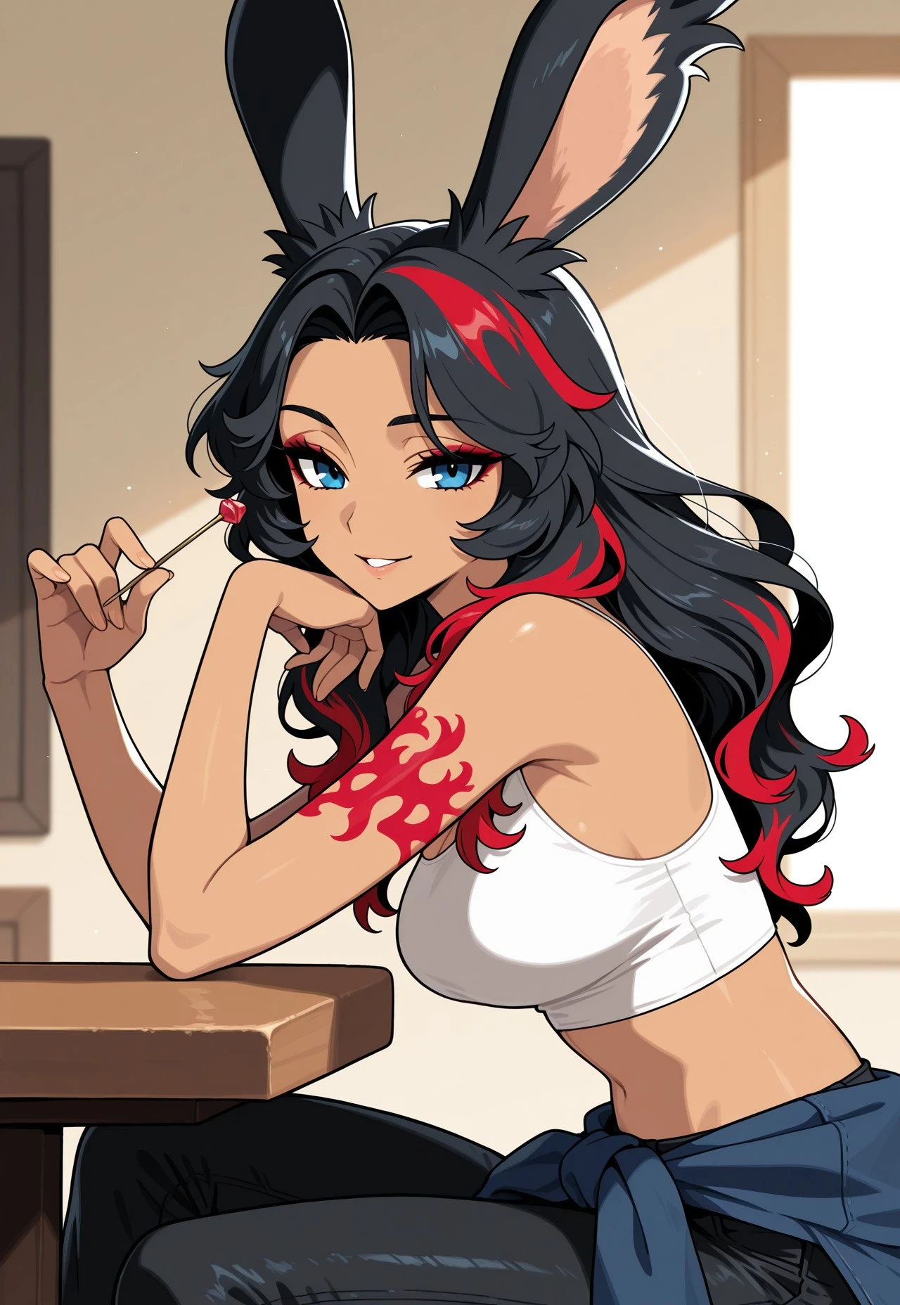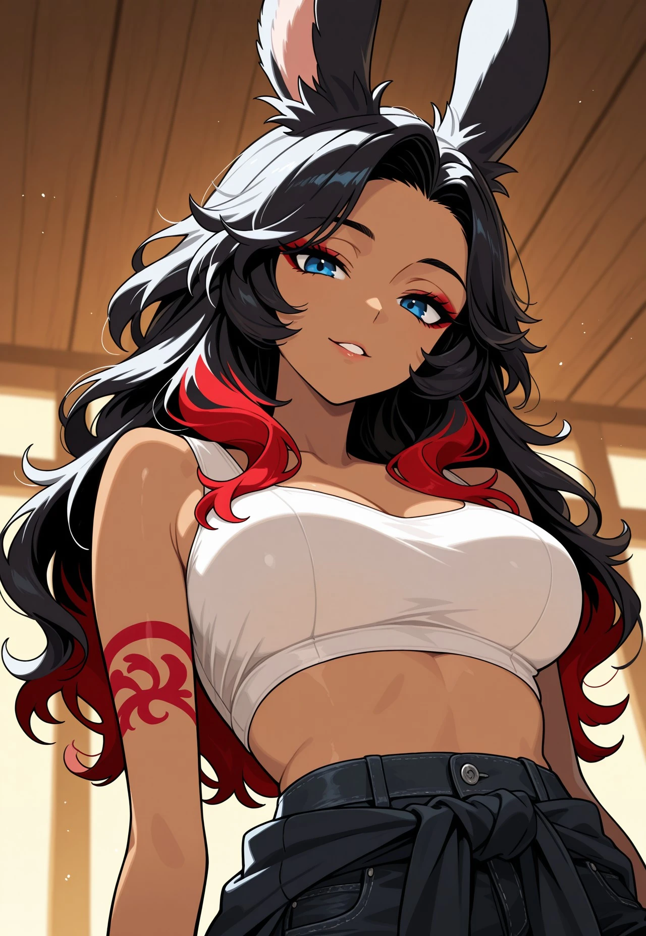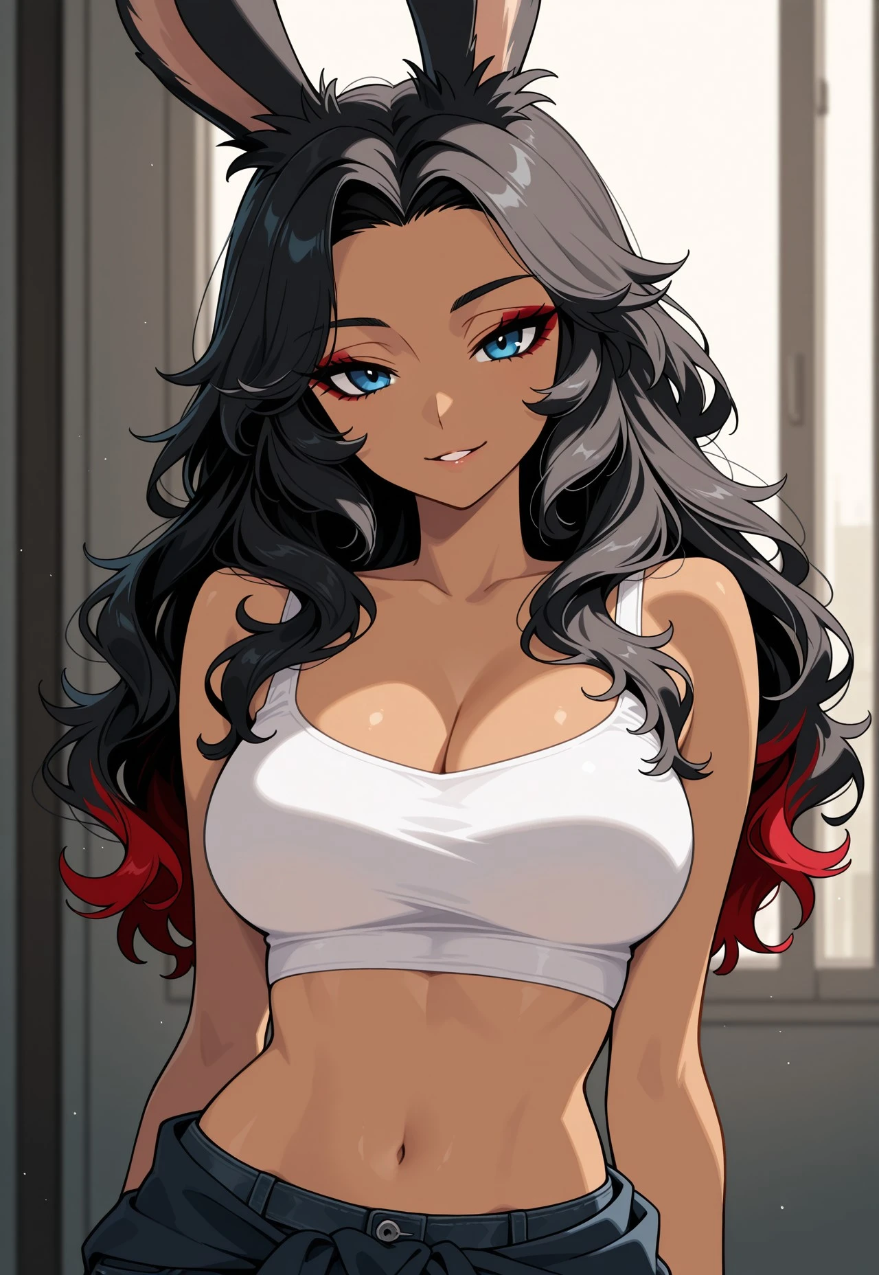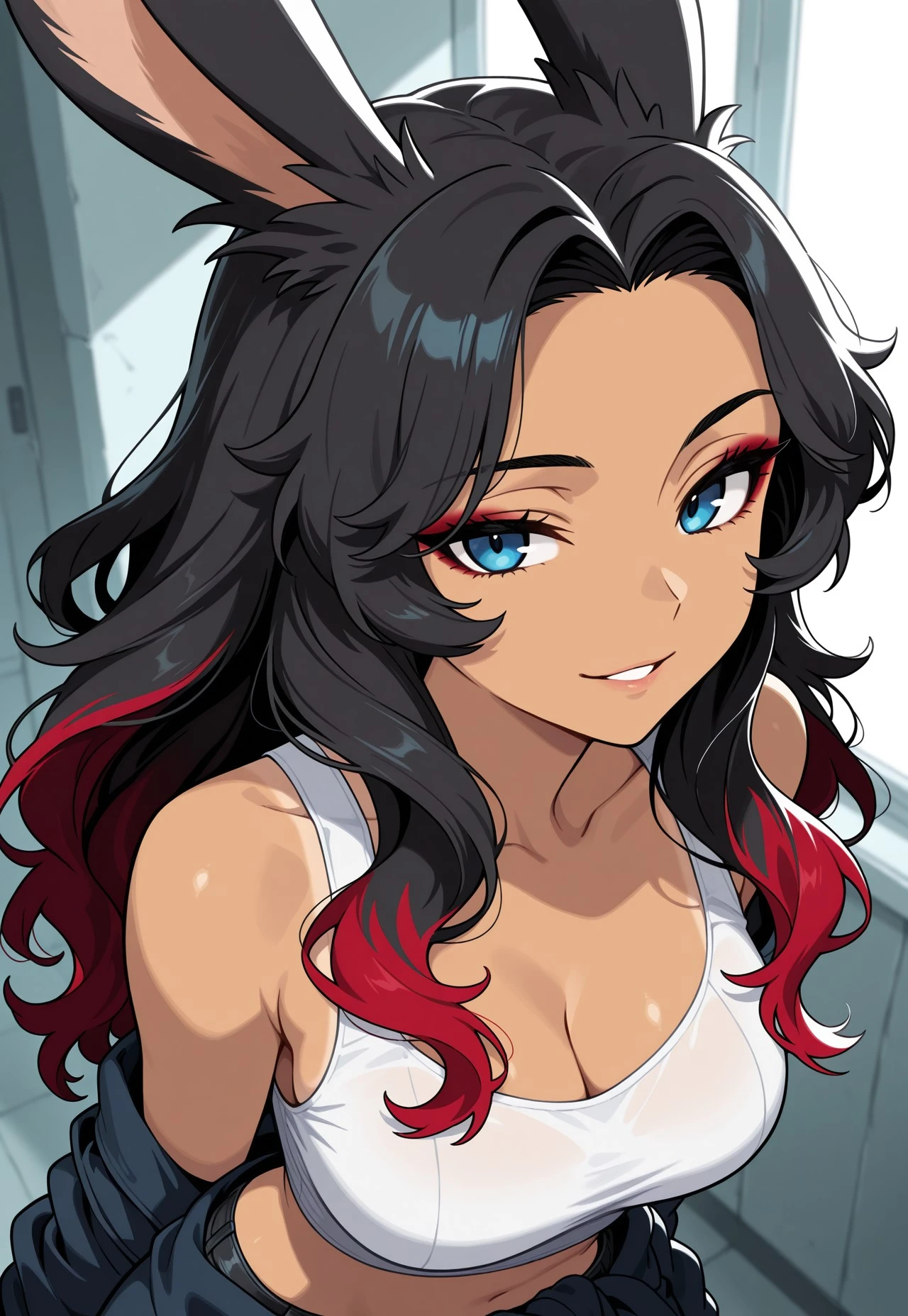 Viera woman, black hair, red streaks in hair, wavy hair, beautiful, blue eyes, tan, white Crop top, cami top, jacket tied around waist, black skinny jeans