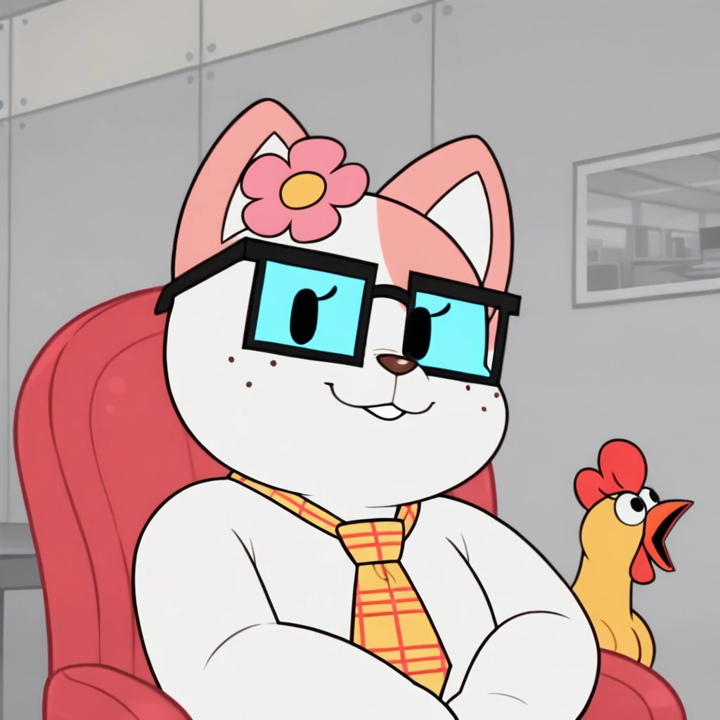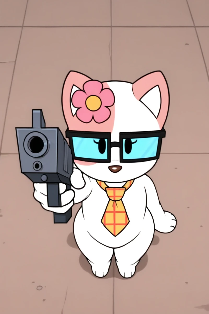 6y4tt, female, solo, anthro, feline, dot eyes, flower in hair, glasses, brown nose, domestic cat, short stack, white body, two tone head, pink markings, wide hips, pink pawpads, yellow tail, 4 fingers, , yellow necktie, pleated necktie,