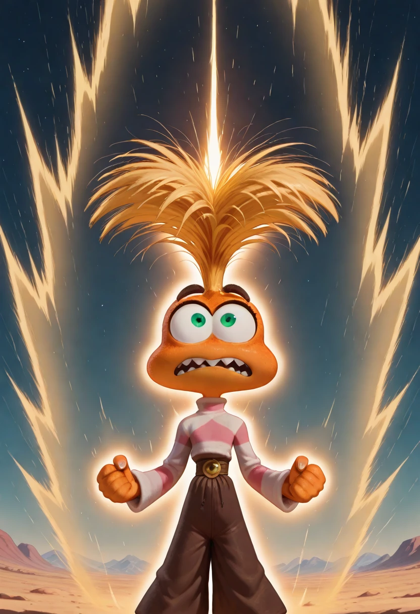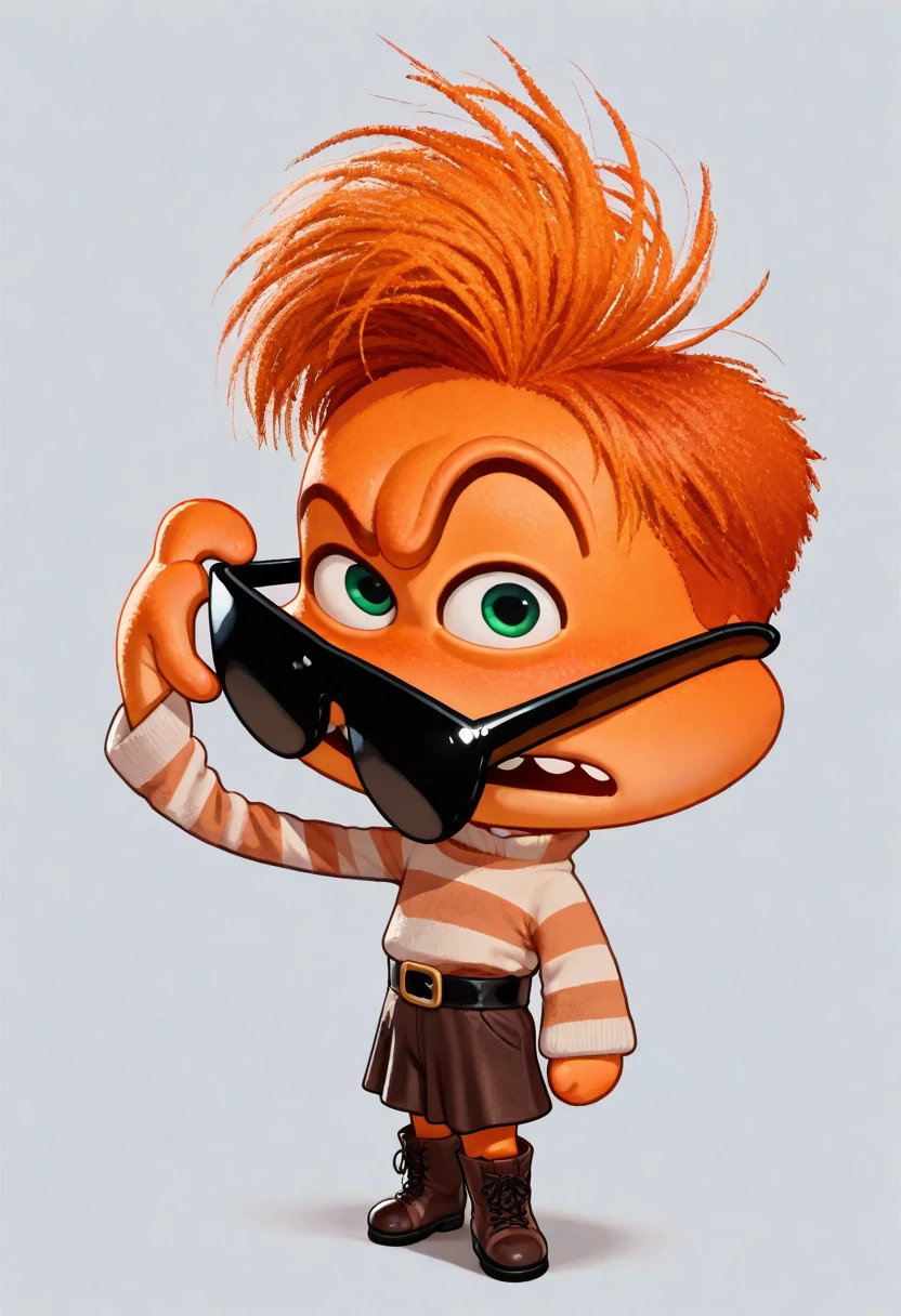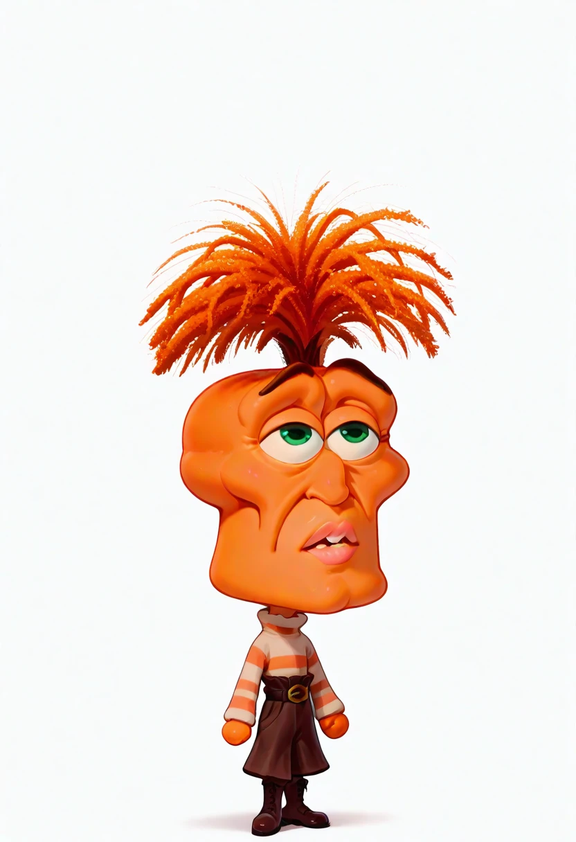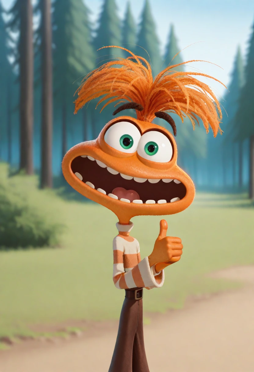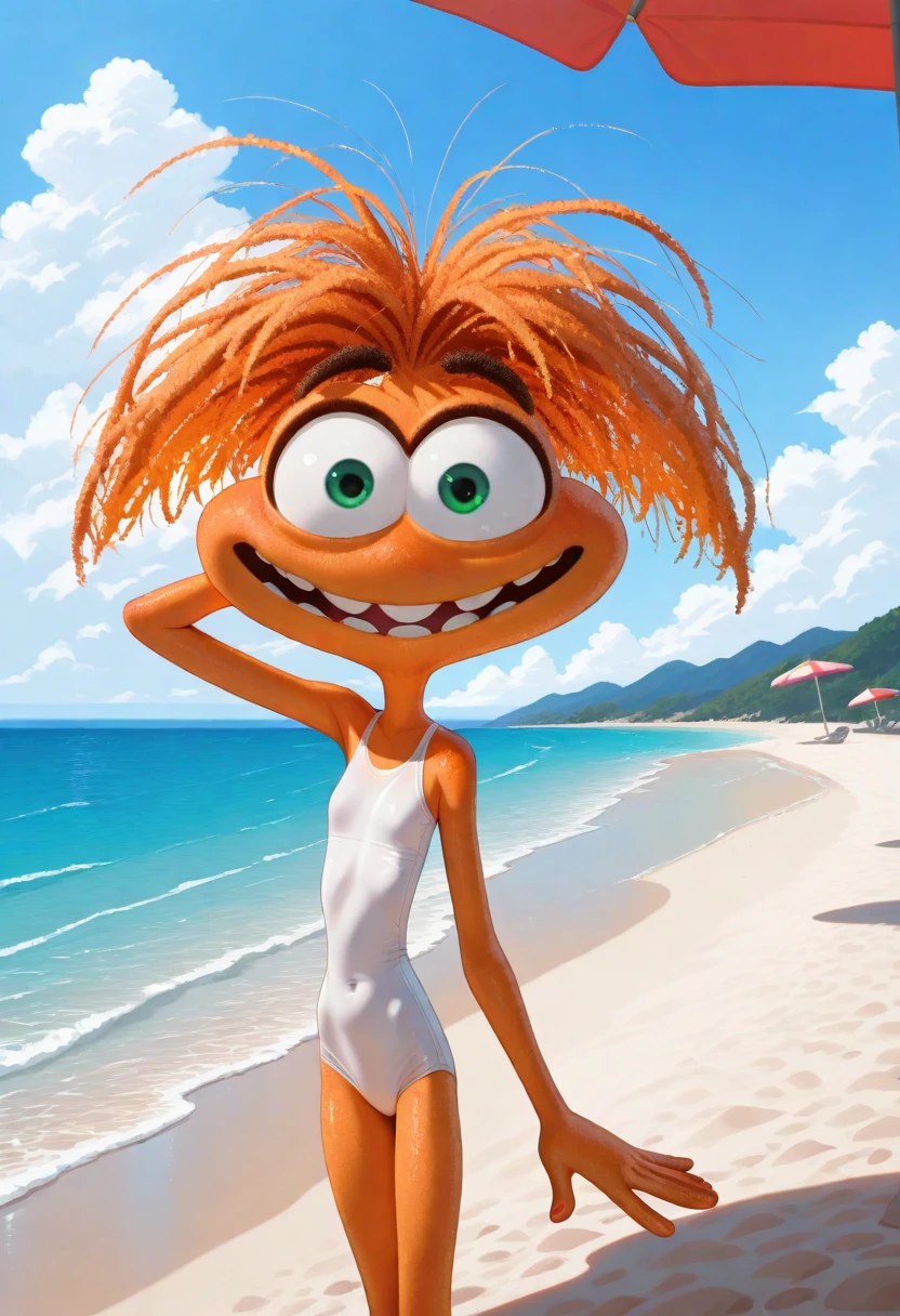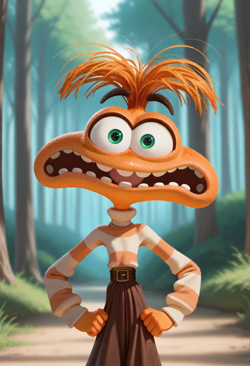 1girl, anxiety, orange skin, green eyes, orange hair, wide mouth, teeth