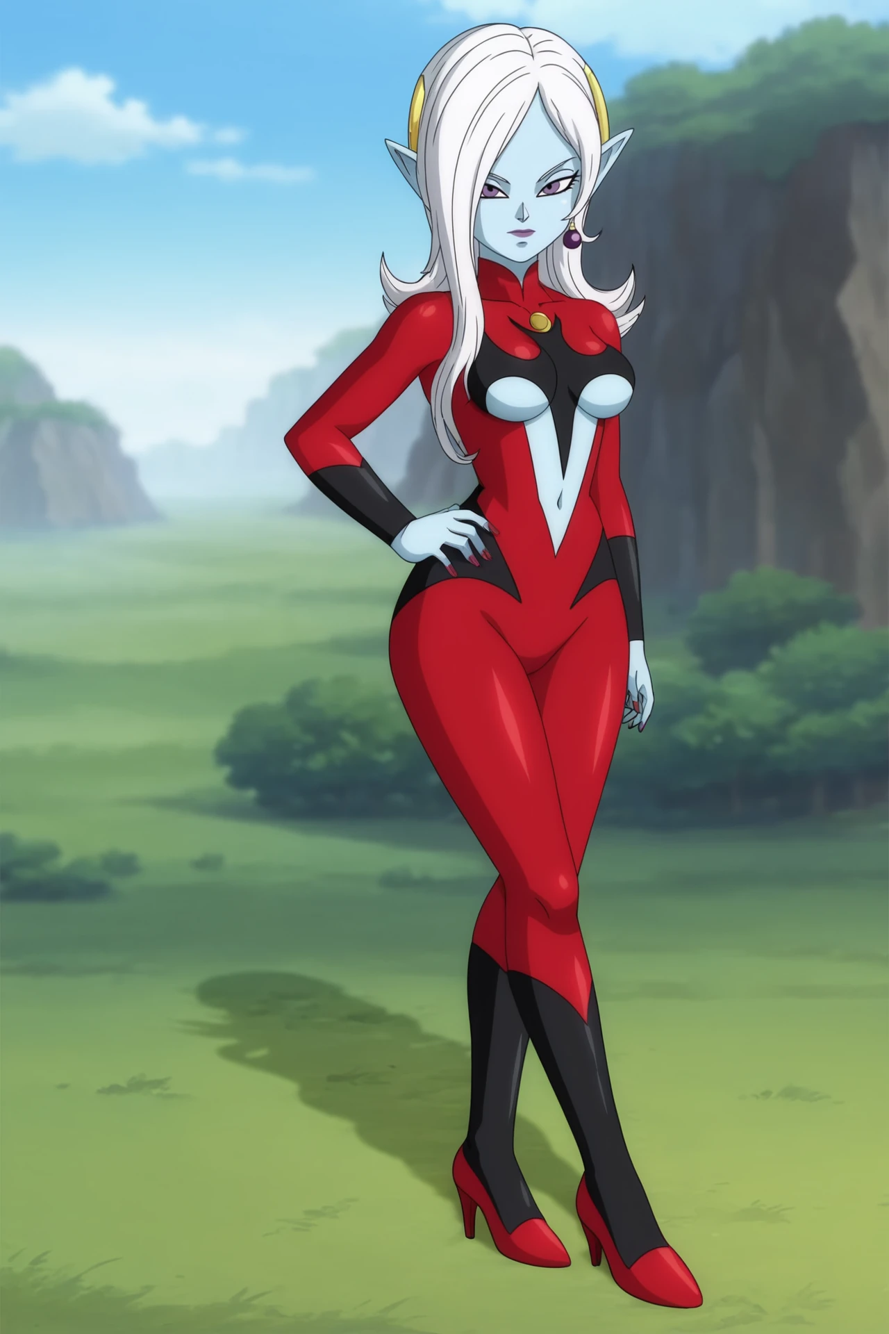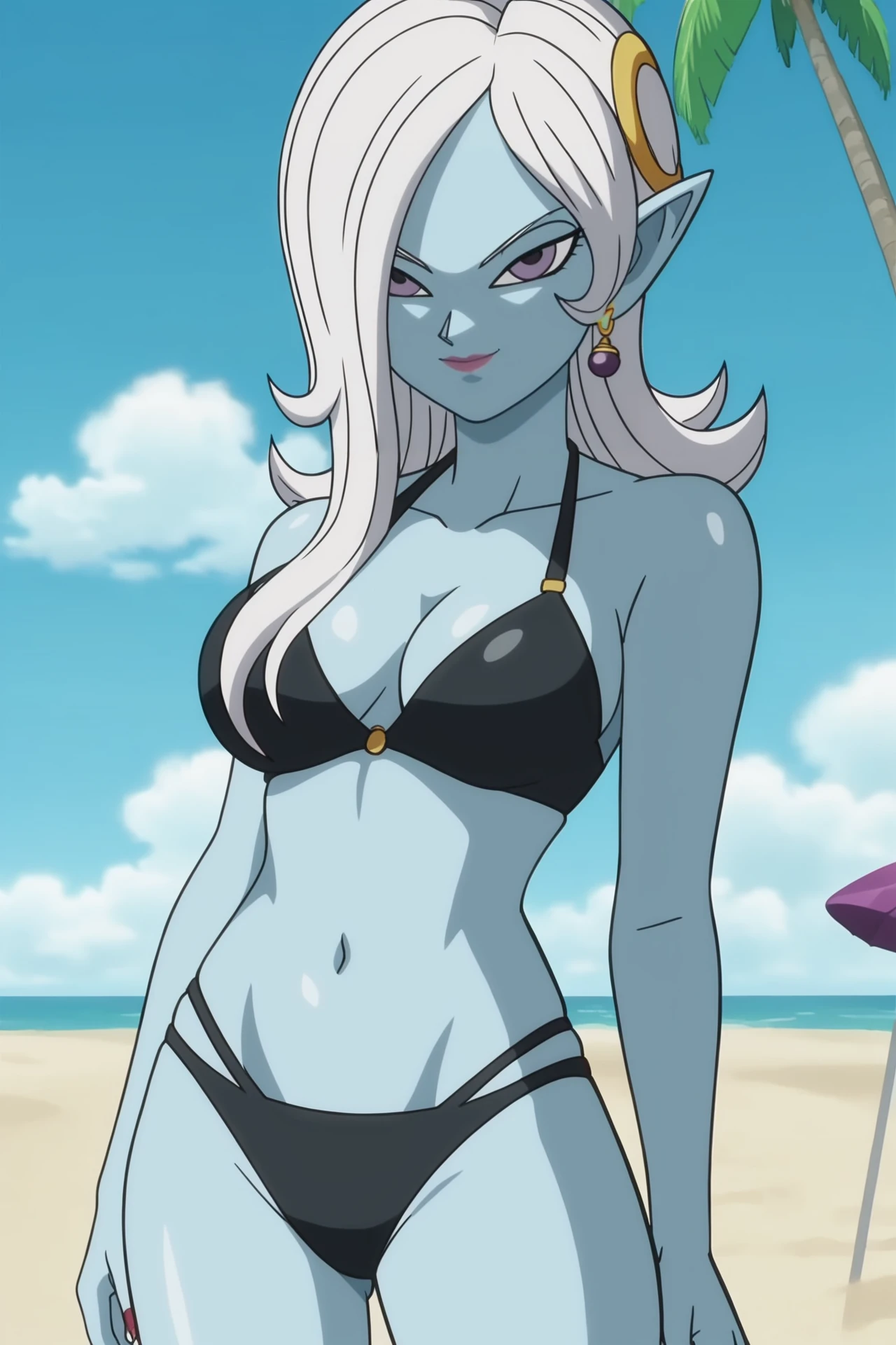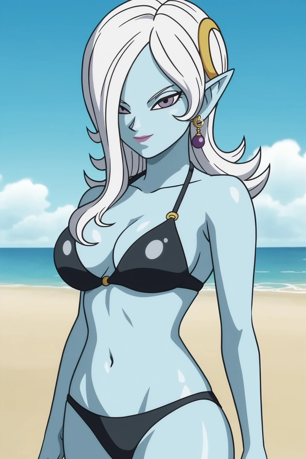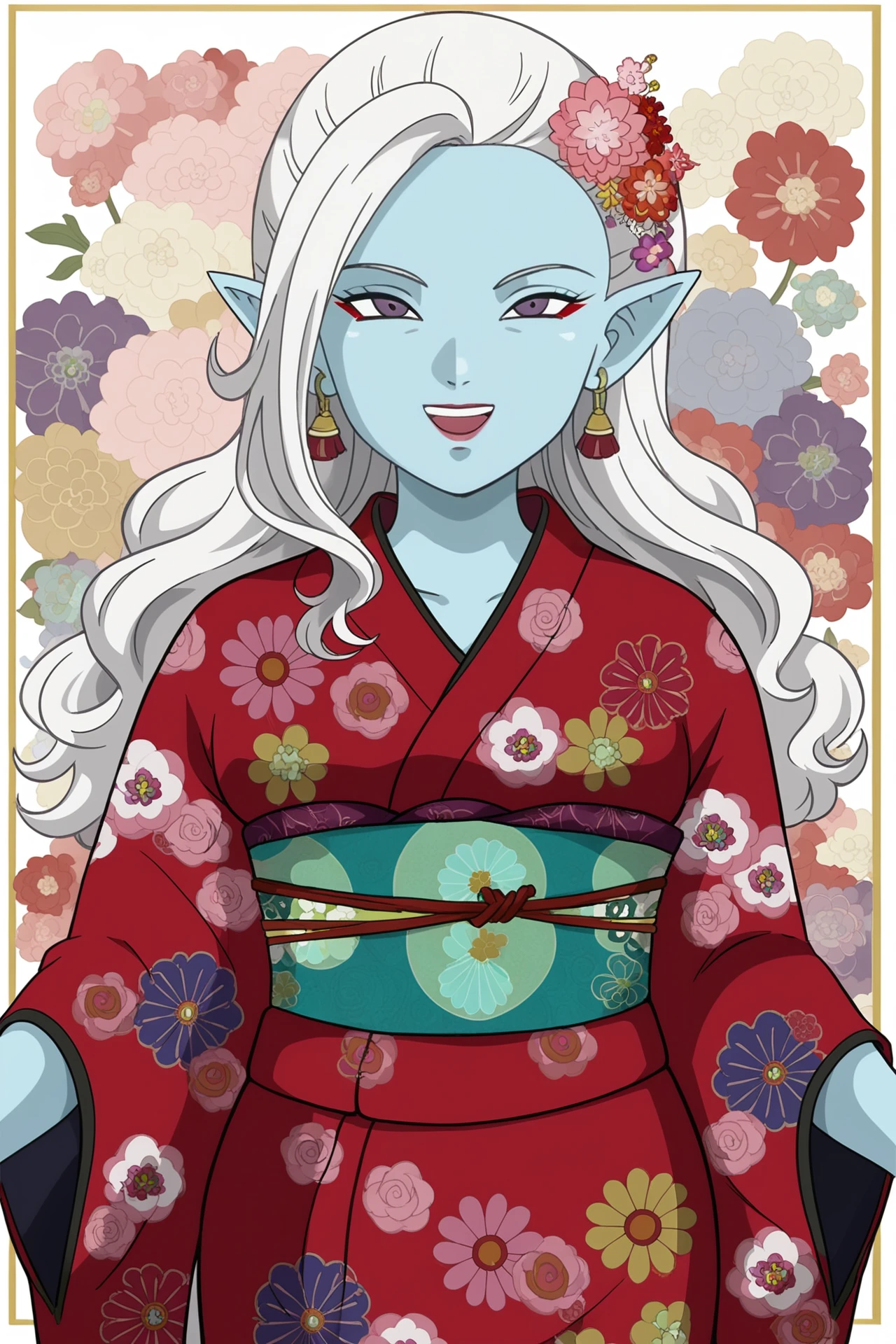 towa, hair ornament, long hair, white hair, hair over one eye, blue skin, colored skin, pointy ears,