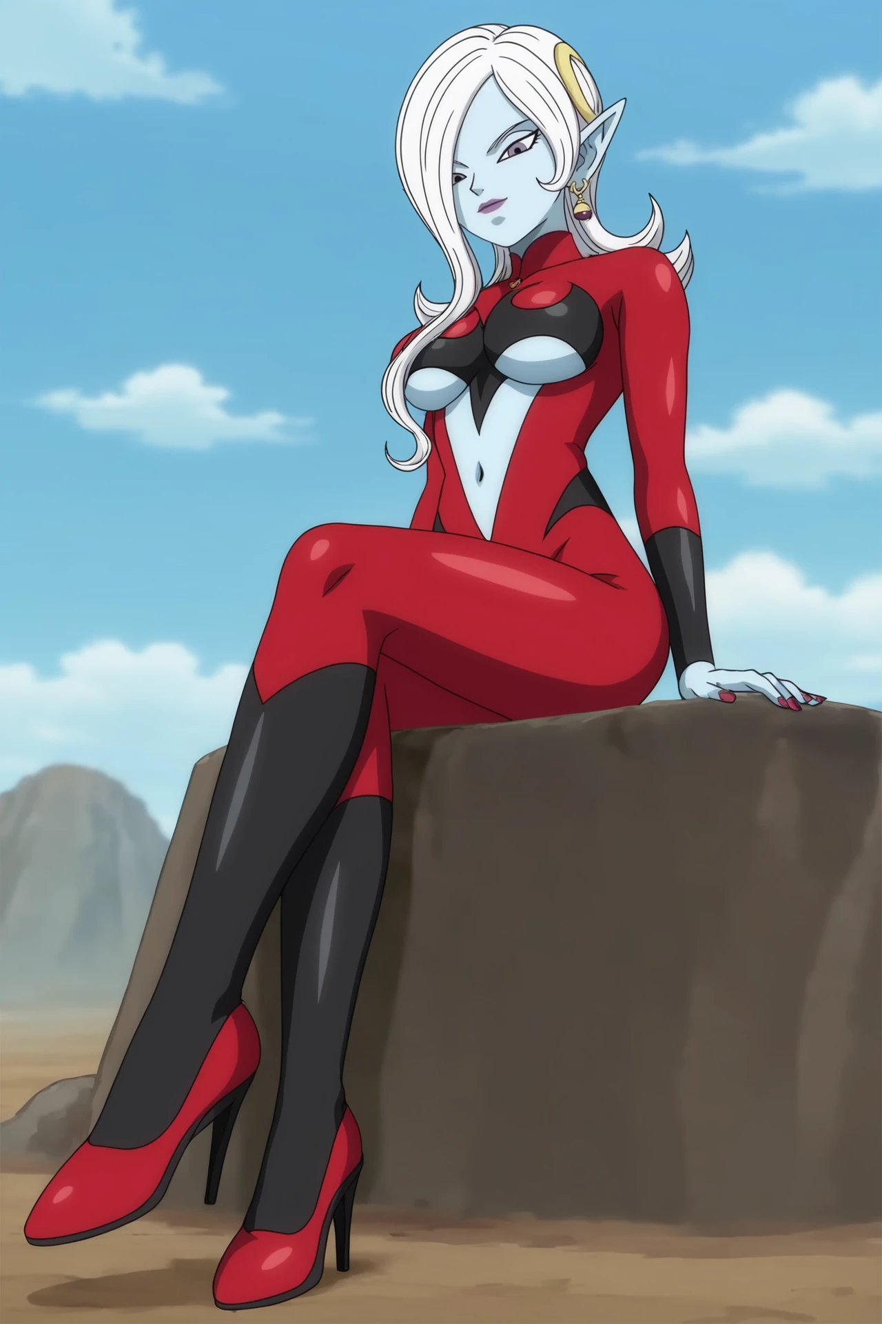 alternate costume, two tone bodysuit, skin tight, black bodysuit, center opening, navel, bare shoulders, sleeveless, detached sleeves, black sleeves, red gloves, skirt removed, red footwear, stiletto heels, high heels