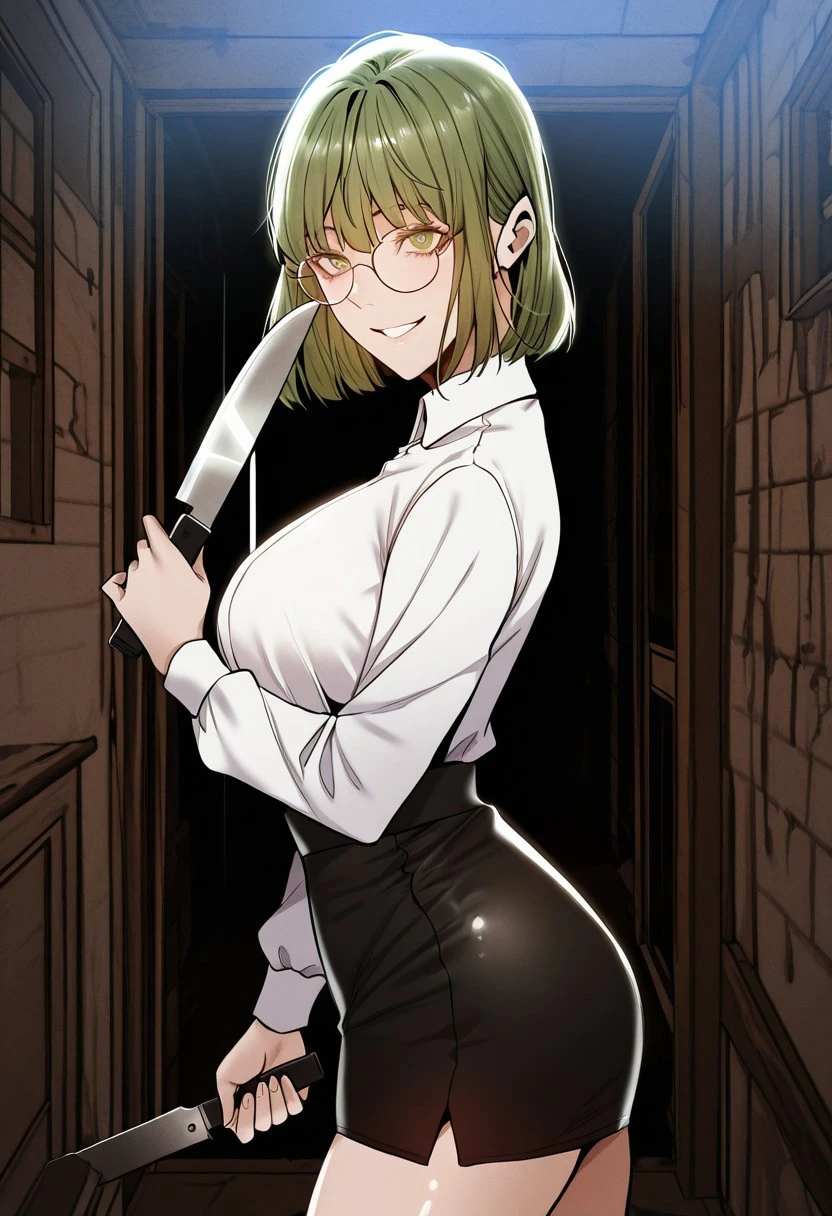 Soo-Ki: soo-ki, beautiful light green eyes, beautiful green hair, beautiful medium bob haircut, bangs, huge and shaggy ???????, glasses,