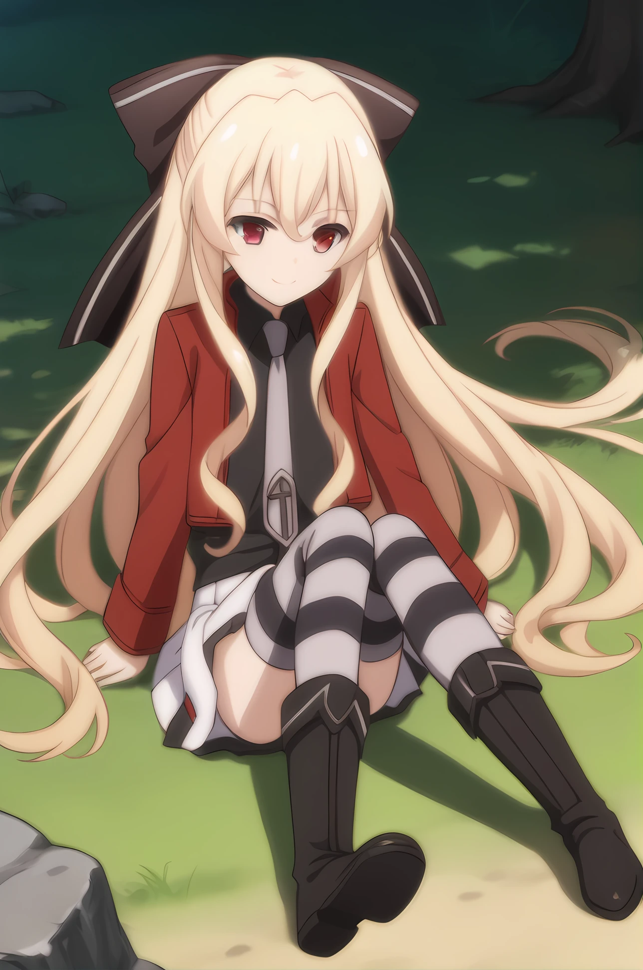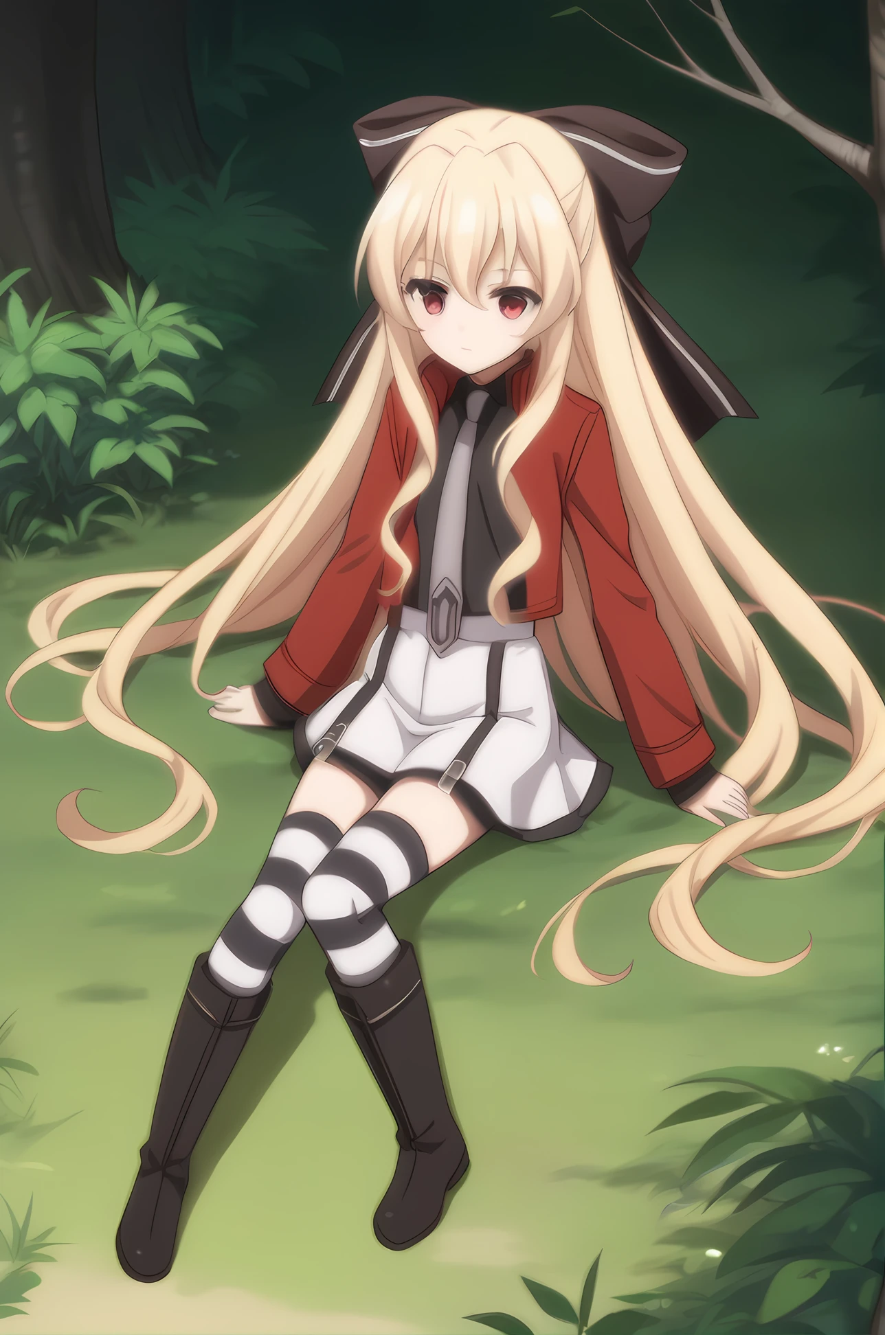 red jacket necktie black shirt white skirt striped thighhighs black boots