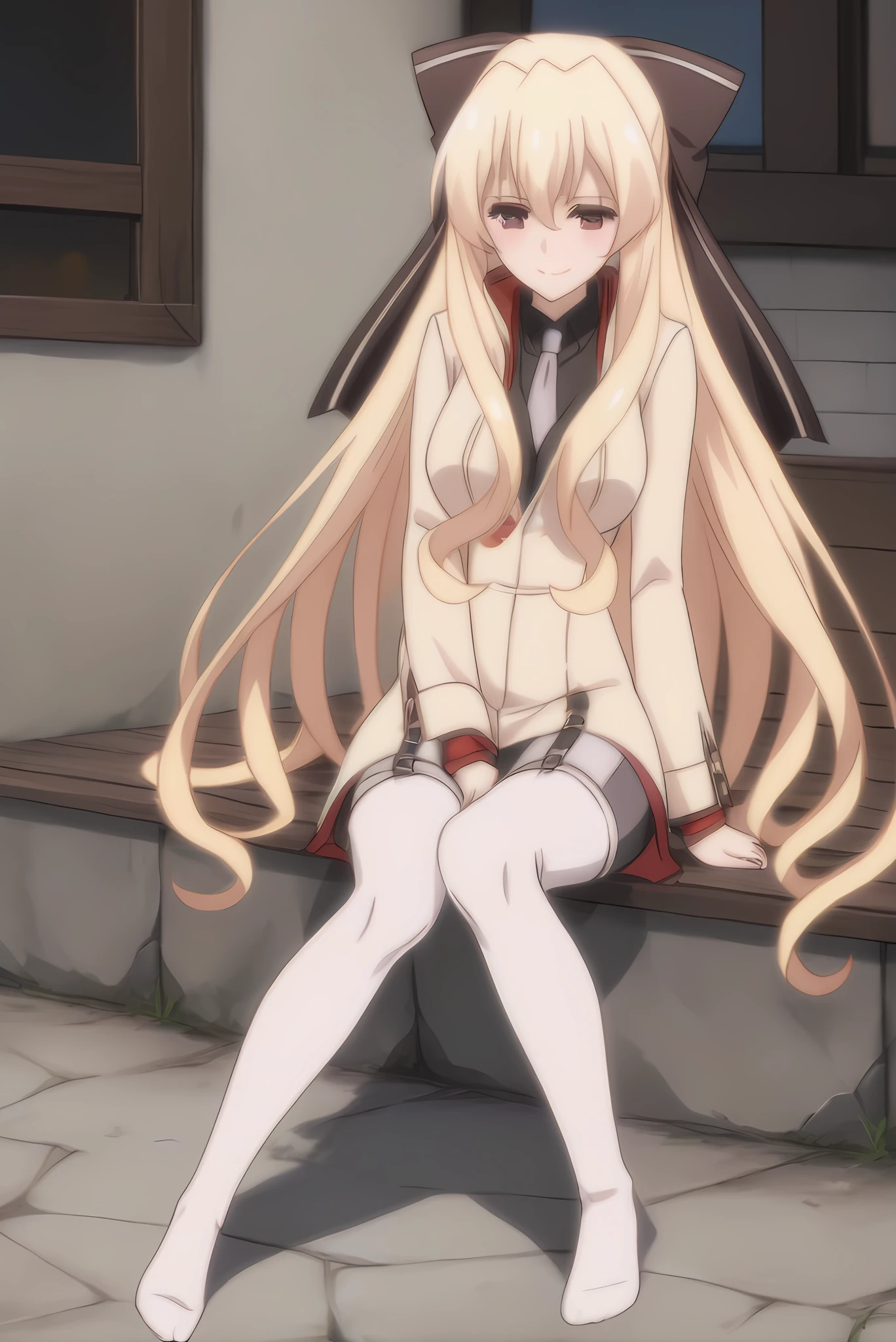 blonde hair, red eyes, long hair, hair bow